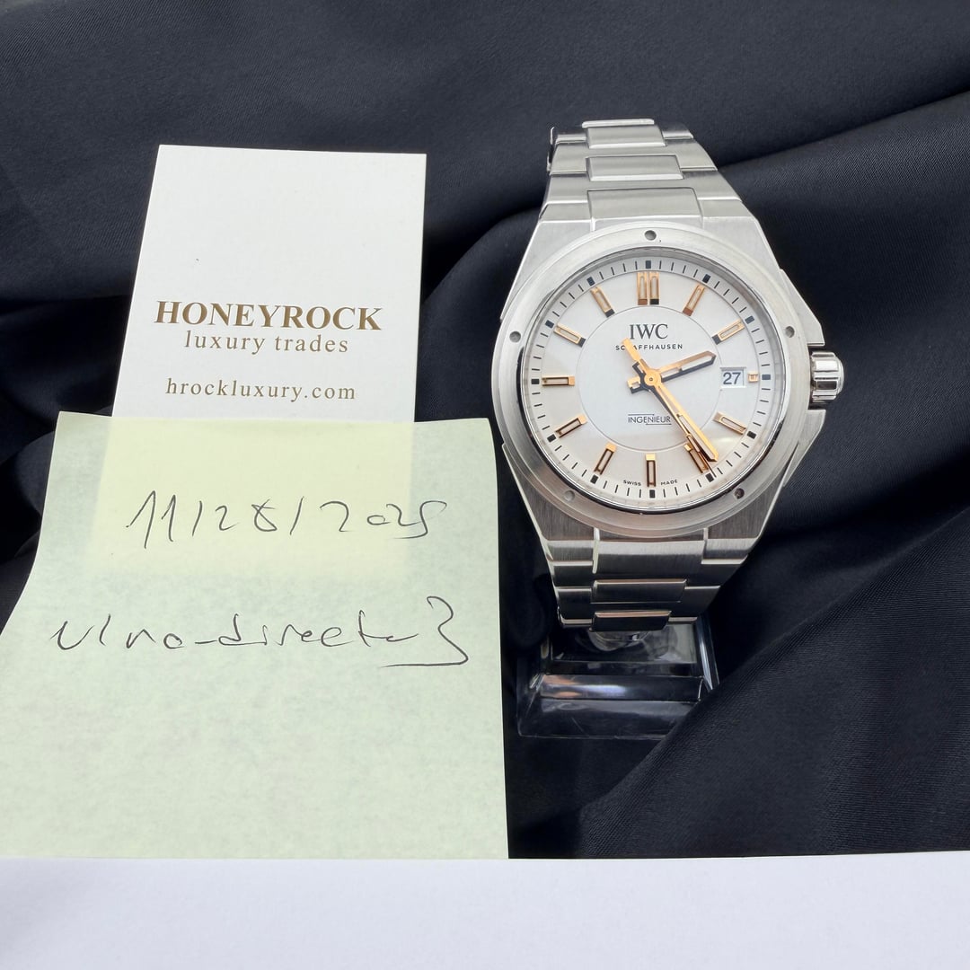 IWC Ingenieur Automatic Ref. IW323906 — 40 mm - Full Set *We offer 1 year mechanical warranty Price : $5750 + ship The IWC Ingenieur began life in 1955 as a tool watch built for scientists, engineers, and medical professionals working in magnetic environments. Its signature innovation — a soft-iron inner cage shielding the movement from magnetic interference — made it a technical marvel of its time. But it was in 1976 that the Ingenieur took on its modern identity, when the legendary Gérald Genta redesigned it as a sleek, integrated-bracelet sports watch. Sharing the same design philosophy as his creations for the Audemars Piguet Royal Oak and Patek Philippe Nautilus, the Ingenieur Ref. 1832 introduced the bold industrial aesthetic that this model continues to embody today. This IW323906 is a modern evolution of that lineage — refined, balanced, and instantly recognizable. The 40 mm stainless-steel case showcases Genta’s geometric precision, alternating brushed and polished surfaces for depth and dimension. The silver dial is elegant yet technical, brought to life by rose-gold hour and minute hands and matching applied indices that add warmth and sophistication to the cool steel architecture. Powering the watch is the IWC Caliber 30110, an automatic movement based on the ETA 2892-A2, offering a 42-hour power reserve and renowned reliability. The flat sapphire crystal features double-sided anti-reflective coating, while Super-LumiNova on the hands and hour markers ensures legibility in any light. Condition: Excellent overall. The bracelet fits wrists up to 7.5 inches. Includes: • IWC outer box • Warranty card dated May 20, 2016 (Tourneau USA-stamped) Specifications: • Case: Stainless steel, 40 mm diameter, 10 mm thickness, 50 mm lug-to-lug (including end links) • Bracelet: Stainless steel with quick-release system, 26–20 mm taper • Crystal: Flat sapphire, double AR coating • Movement: Caliber 30110 automatic (ETA 2892-A2 base) • Water Resistance: 120 m • Swiss Made A refined expression of Gérald Genta’s design philosophy, this Ingenieur balances technical robustness with elegance — the perfect bridge between IWC’s engineering heritage and modern-day sophistication.
