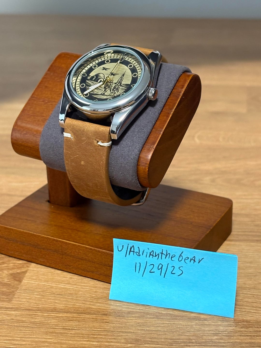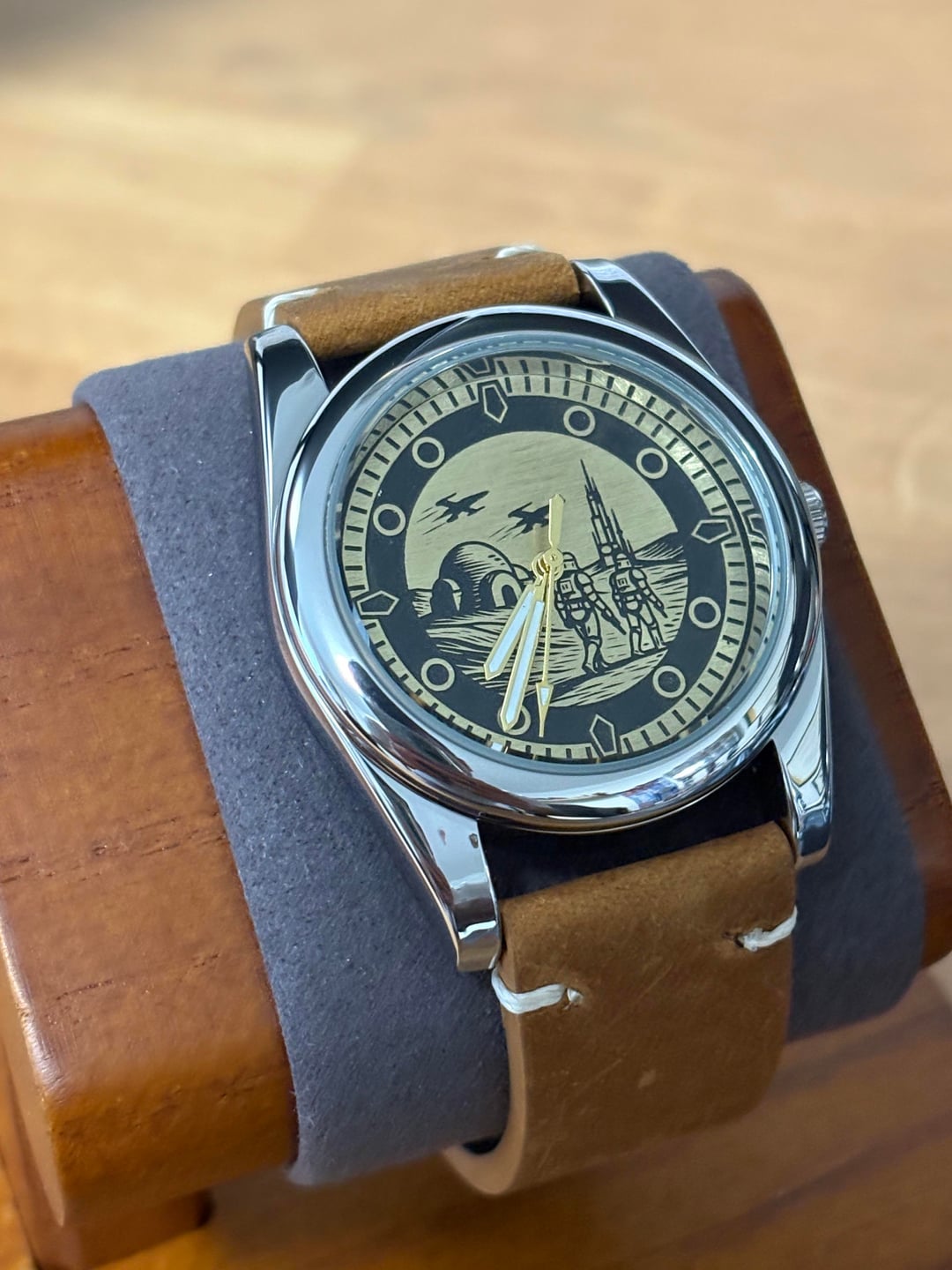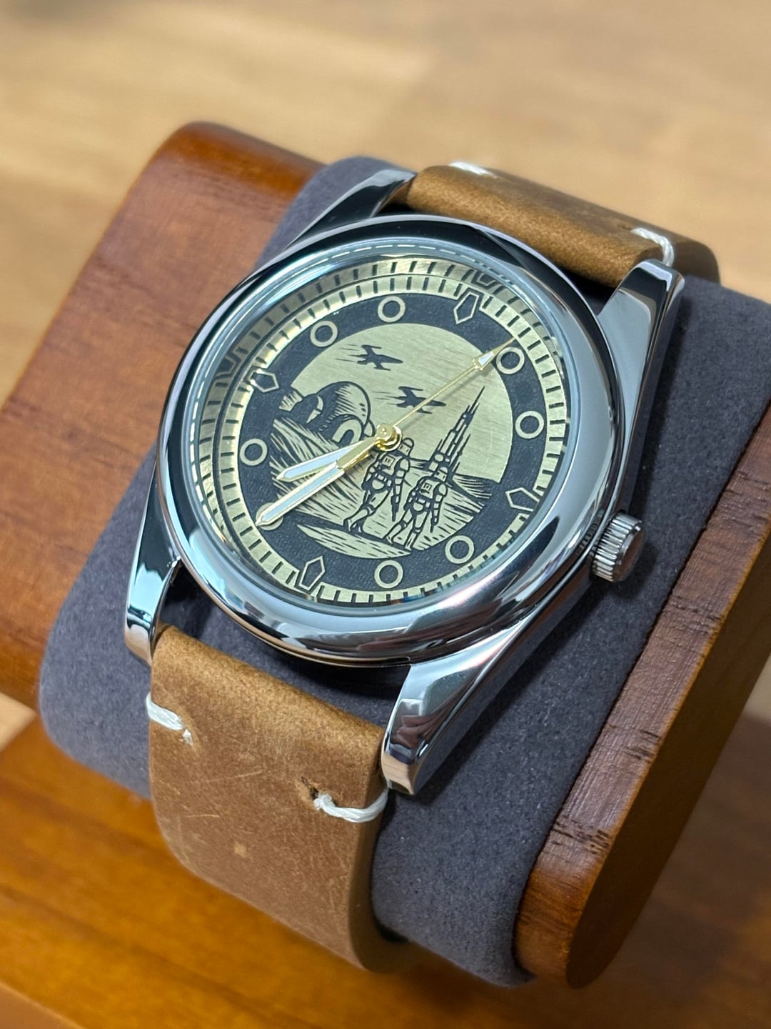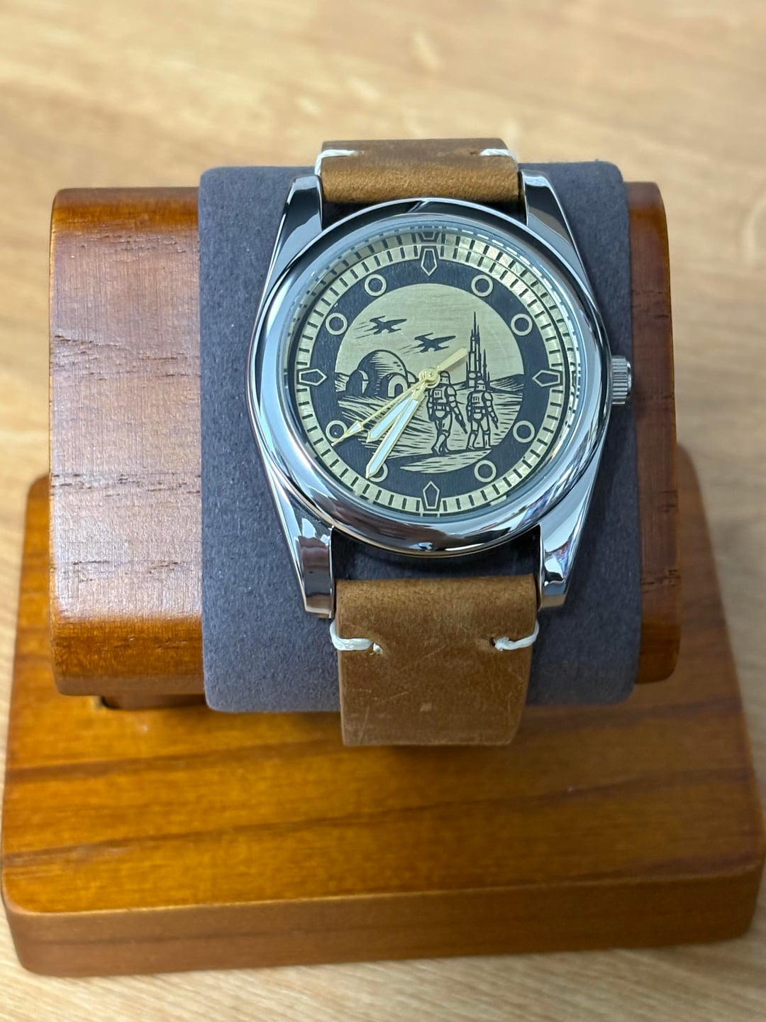 Hi WatchEx, Up for sale is a custom built Star Wars theme watch with a Star Wars scene depicting two Stormtroopers walking across a barren battlefield with a pair of X-Wing fighters flying overhead. These dials are cut from a sheet of jeweler’s brass using by laser, painted, hand-sanded and waxed. The case is a very slim 10mm by 37mm in diameter. Watch will come with a watch travel pouch for safe keeping. Specs: - Case: 37mm in diameter and 10mm thick - Glass: Sapphire Crystal - Movement: Seiko VH31 Quartz movement with a sweeping seconds hand. - Strap: 20mm brown leather strap - Condition: Brand new Price: $150 SHIPPED within US Like what you see and the watch sold? Happy to make you another or customize a different piece for you! Feel free to DM me for a commission or follow my page for more examples of my work in Instagram: https://www.instagram.com/avilawatchco?igsh=MXh5OXh2bDFjb3h3NQ%3D%3D&utm_source=qr