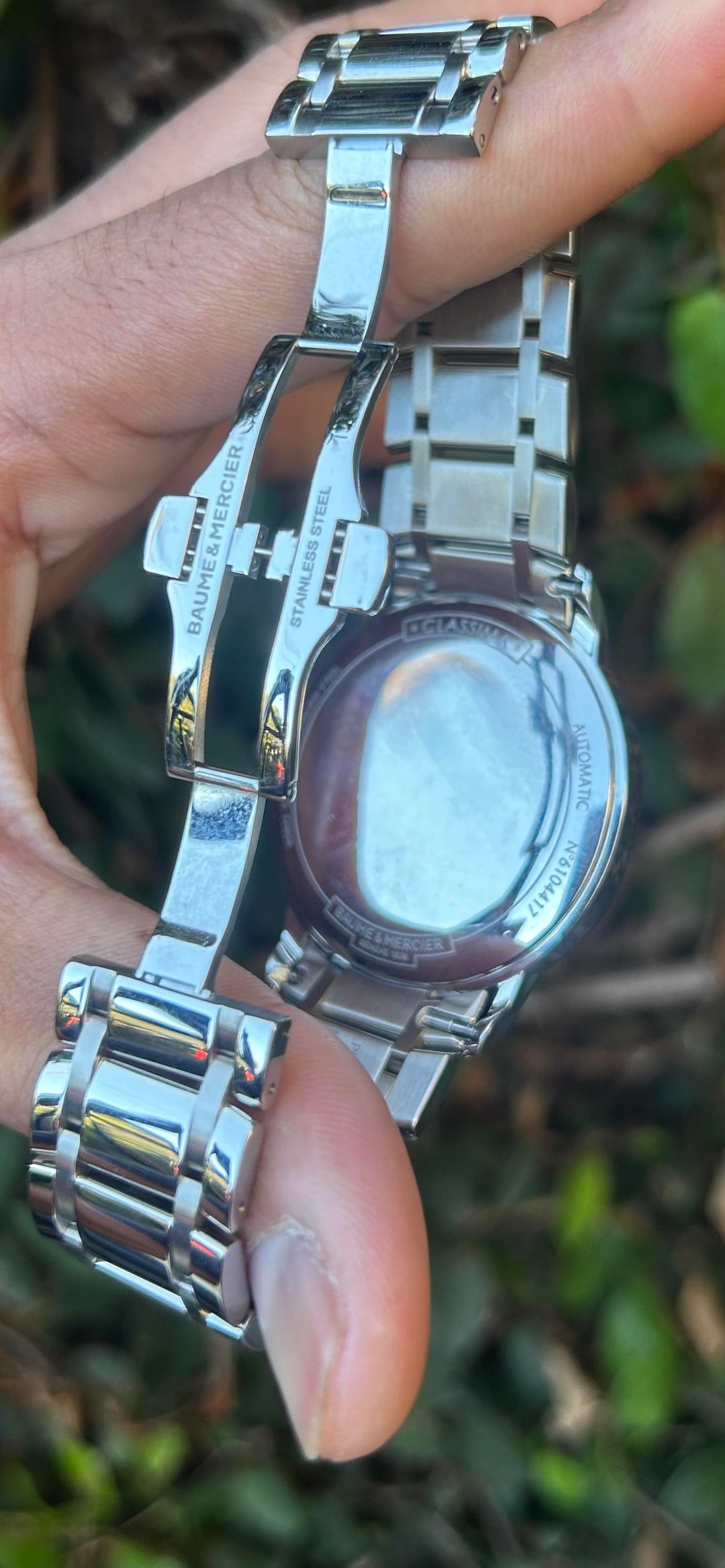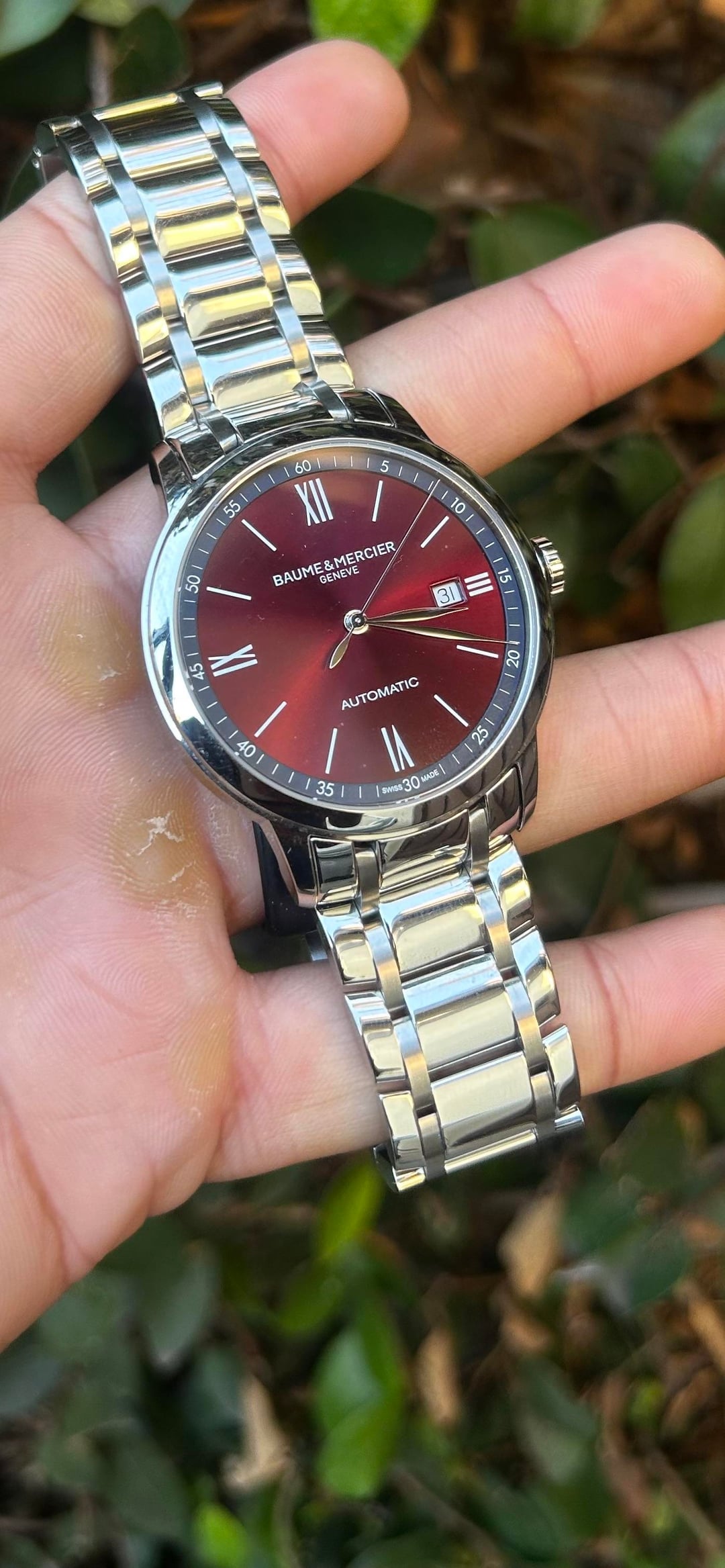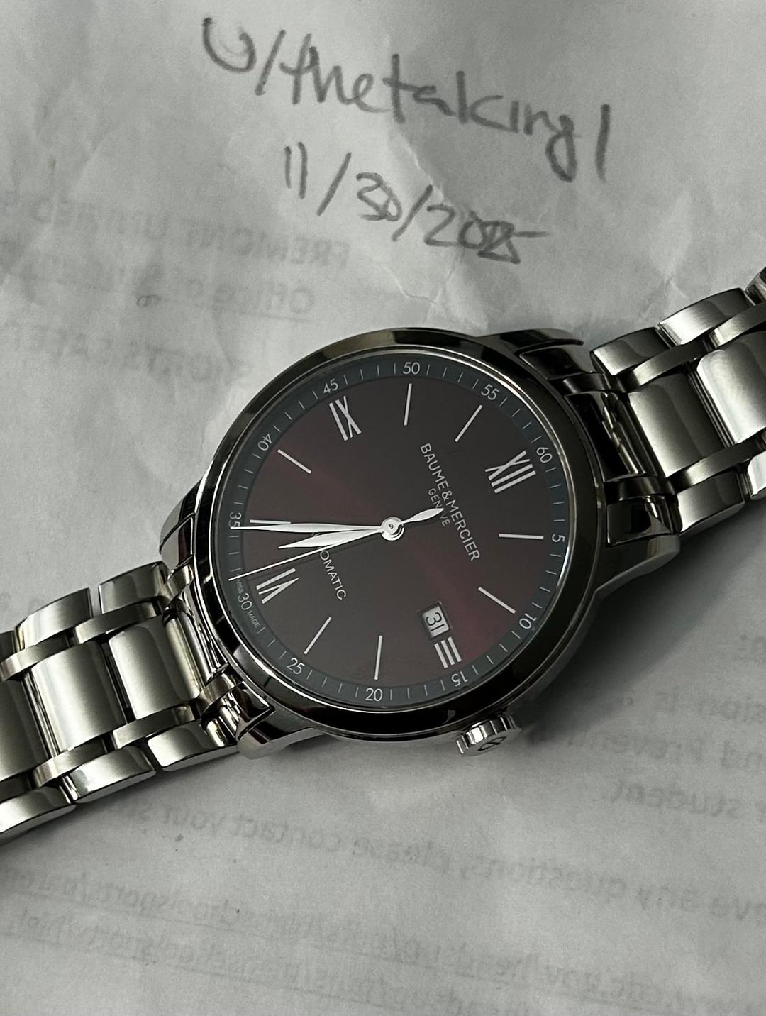 This is the type of watch that makes me want to take a photography class because I simply cannot do it justice. Putting up this absolutely gorgeous Baume & Mercier Classima XL with the deep burgundy sunburst dial that hits the light like a glass of red wine under a spotlight. If you’re tired of boring black/silver dress watches, this is the punch of color your collection has been begging for. This thing is pure class on wrist — slim, elegant, and with that polished multi-link bracelet that somehow feels both dressy and flexy at the same time. It wears like a much more expensive piece (because honestly… it kind of looks like one). Comes full kit, runs great, and looks even better in person. Zero excuses — just a beautiful Swiss automatic with actual personality. $999 + label costs Trade Value $1200 for anything cool, interesting, or that brings good vibes. Let’s move this stunner to a wrist that’ll appreciate it. Please comment before PMing
