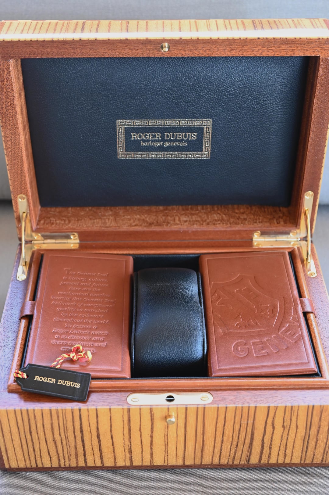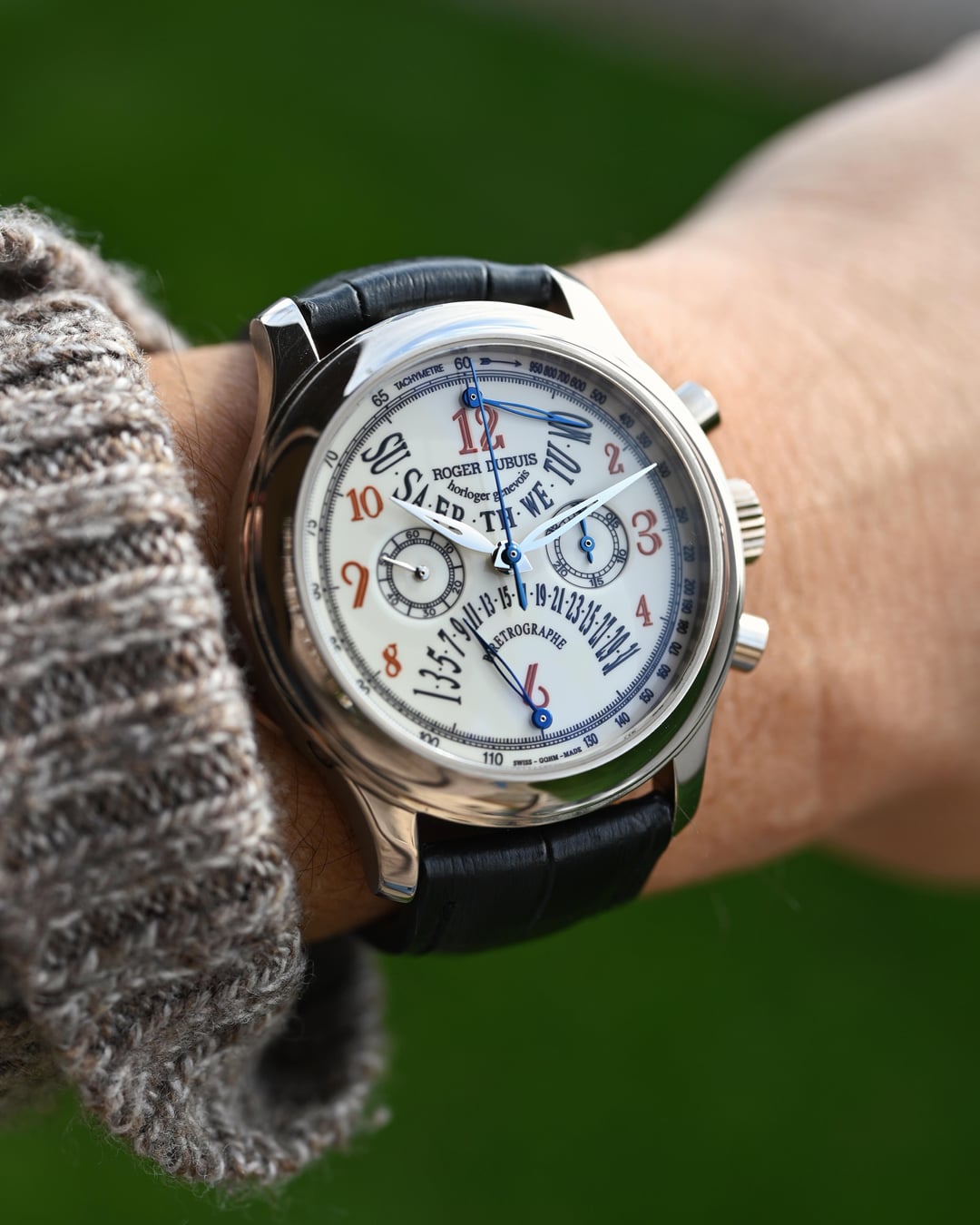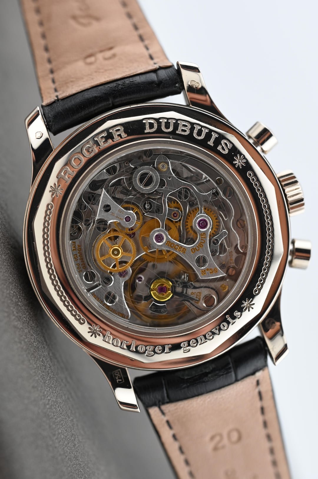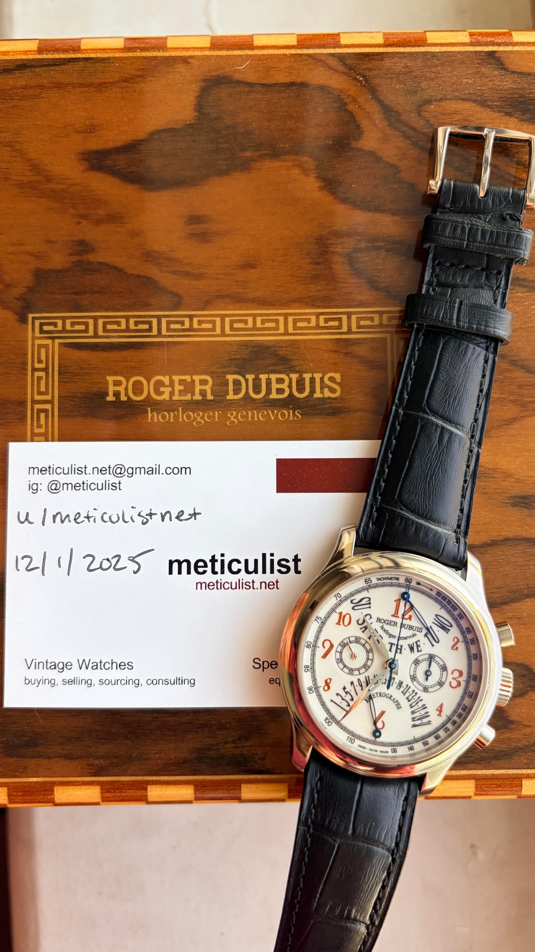 An early, rare, and absolutely stunning Roger Dubuis Hommage Bi-Retrograde Chronograph Reference H40 560 series in white gold with original presentation box. This watch is achingly beautiful from every angle, and particularly interesting at off angles, highlighting a seemingly endless list of intricate and fascinating details such as the polished concave bezel, anti-slide “tasti-tondi” style pushers, unique hollowed and heat blued sub register hands, highlighting the stylized red Arabic numerals, and the richness and depth of the lacquered white dial. The party continues on the movement side with a beautifully finished manually wound and Geneva Seal caliber RD5630 movement, based on the infamous Lemania 2310 caliber complete with Geneva striping, anglage, black polishing, a capped column wheel, and swan’s neck regulator. Far more interesting and detailed than anything from Patek or the like, presenting a tremendous value and serious collection capstone. **Reference:** Hommage Bi-Retrograde Chronograph H40-560 **Case:** The 40 x 47 x 14 mm solid white gold case is in excellent overall condition, and appears to be unpolished. **Dial:** The white lacquered dial has a glassy milky richness and depth to it, appearing to be enamel, highlighting the layers and thickness of the printed scales and numerals. The dial and hands are free from defects as pictured. **Movement:** The RD5630 caliber is a heavily modified Lemania 2310 base that features a Geneva Seal on the balance cock as well as on the movement base plate under the balance wheel. The finishing is intricate and classic and the watch is winding, setting, and running well, with crisp calendar changes at midnight. The watch is running at approximately +/- 0 s/d, averaged across 6 positions. **Strap:** The watch is presented on a black alligator strap with calfskin lining in good shape measuring 75 x 120 mm and including the original signed white gold buckle in very good condition. **Includes:** Presented with one of the coolest wooden boxes I’ve seen with multiple grain patterns throughout and a rich leather presentation inside depicting and describing the importance of the Geneva Seal. Accompanied by the original leather hang tag. No additional booklets or papers are present. **Price:** $39,500 USD including fully insured shipping from Phoenix, AZ to a FedEx Office location or commercial address within the continental US, international shipping available at cost based on location. Payment by ACH or wire, no trades please. I have all positive references here, [Chrono24](https://www.chrono24.com/dealer/meticulist/index.htm), forums, and [Instagram (@)meticulist](http://instagram.com/meticulist). All available watches can be found at [meticulist.net](http://meticulist.net/) Thanks mods for the space.