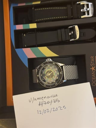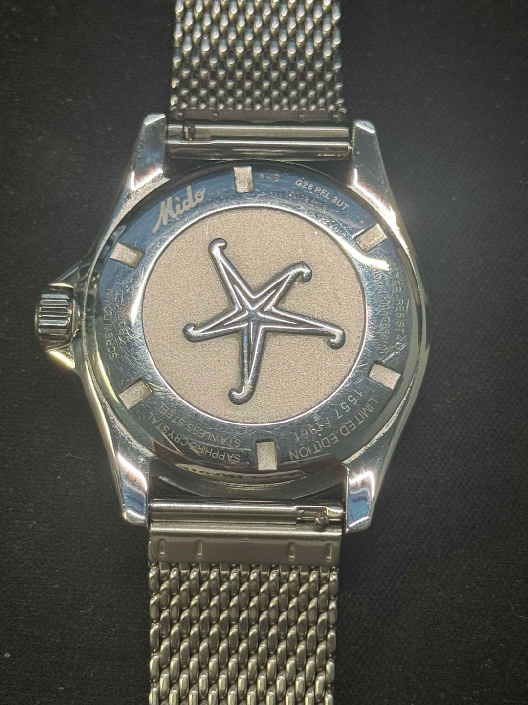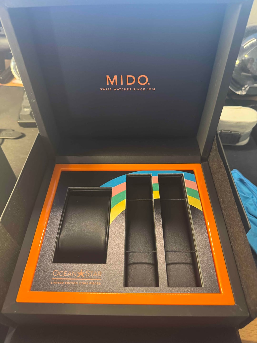 This is the original limited edition re-issue release, the fun Mido Decompression timer. https://www.midowatches.com/us/news-ocean-star-decompression-timer-1961-edition-2020.html I am the original owner, bought from Hodinkee in 2020. This release was huge in 2020, though there have been a number of variations released since, I think the original did it best. 40.5mm, 21mm between the lugs, original straps and extra barton rubber strap. Great condition, the scratches on the legs and stainless steel are very superficial and only really visible in harsher light like photograph. Notice a couple light scratches on the bezel at 5 o' clock. On my timegrapher this watch reads within 5s a day, and in some positions 0s/day. 0.2 beat error, 300 amplitude. Running amazingly. $999, Paypal FF, not including shipping. US-based prefer to sell in the US. Local NYC meetup possible Thanks for taking a look!