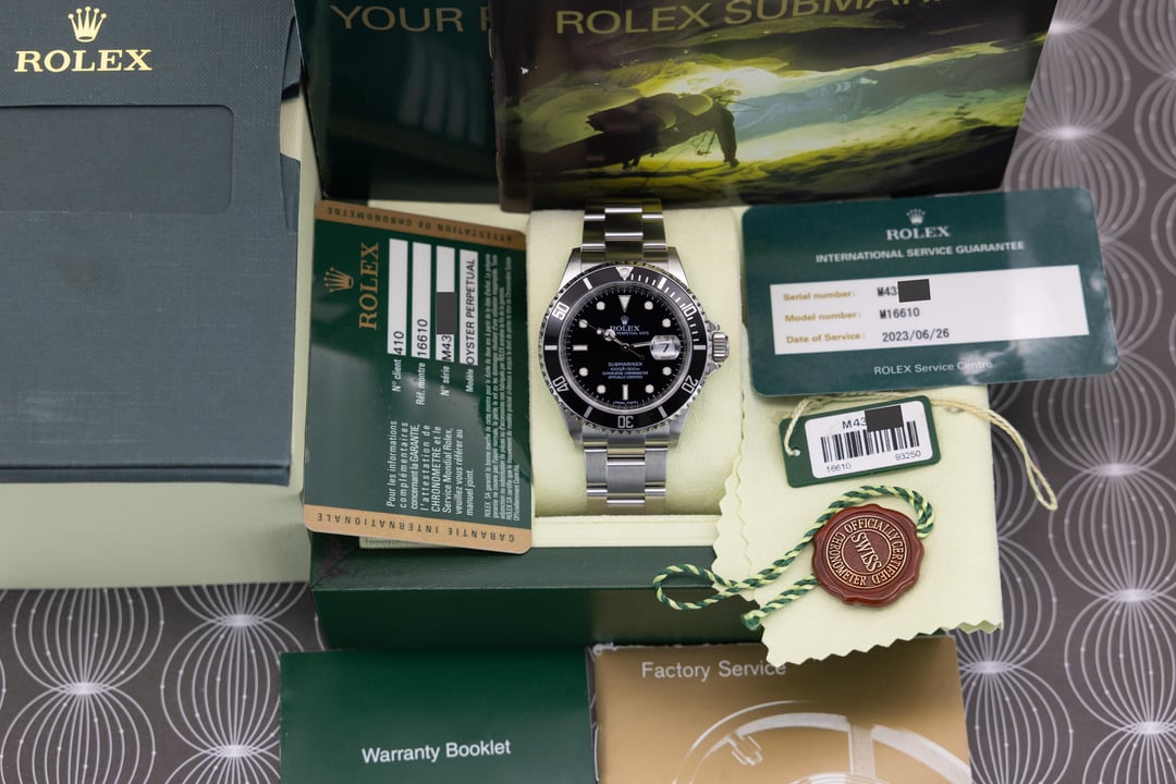 [pics](https://imgur.com/a/Zj8qglc) [timestamp](https://imgur.com/5Yue448) Case: Excellent condition no-holes case with very light signs of wear. The black bezel insert in excellent condition. M-Serial. Dial: Excellent swiss made super luminova maxi dial with matching hands. Bracelet: The 12.5 link SEL oyster bracelet is excellent and remains tight. The clasp is stamped with an EO code dating it to 2007. Includes divers extension. Accessories: Inner/outer boxes, booklets, cleaning cloth, hangtags, 2023 RSC service card, and original warranty card. Notes: A fresh no-holes sub in excellent condition coming in with all the goodies. Offered at $10,950 shipped. Payment by PayPal F&F, bank wire, or crypto. Located in San Diego, CA. Insured overnight FedEx shipping. International shipping available. Buyers shipping the watch to CA will be required to pay applicable sales tax. Thanks for looking and feel free to message me with any questions!! Hit me up on IG u/mvvwatches Phone Number: 925-219-5232 Email: [[email protected]](mailto:[email protected])