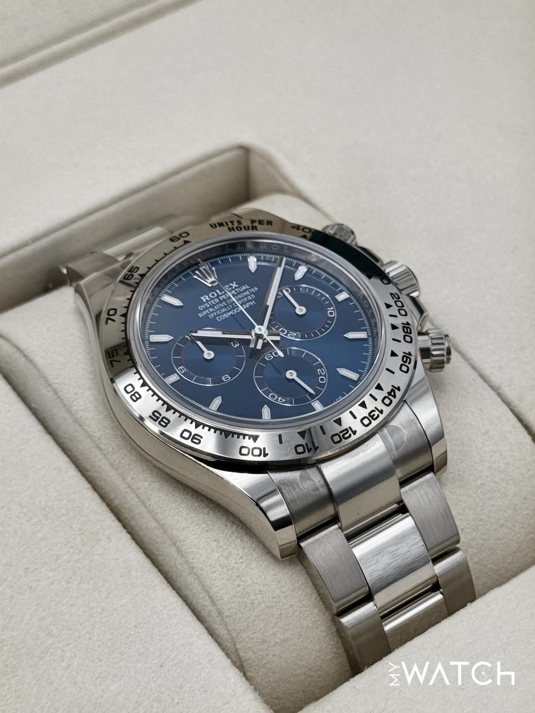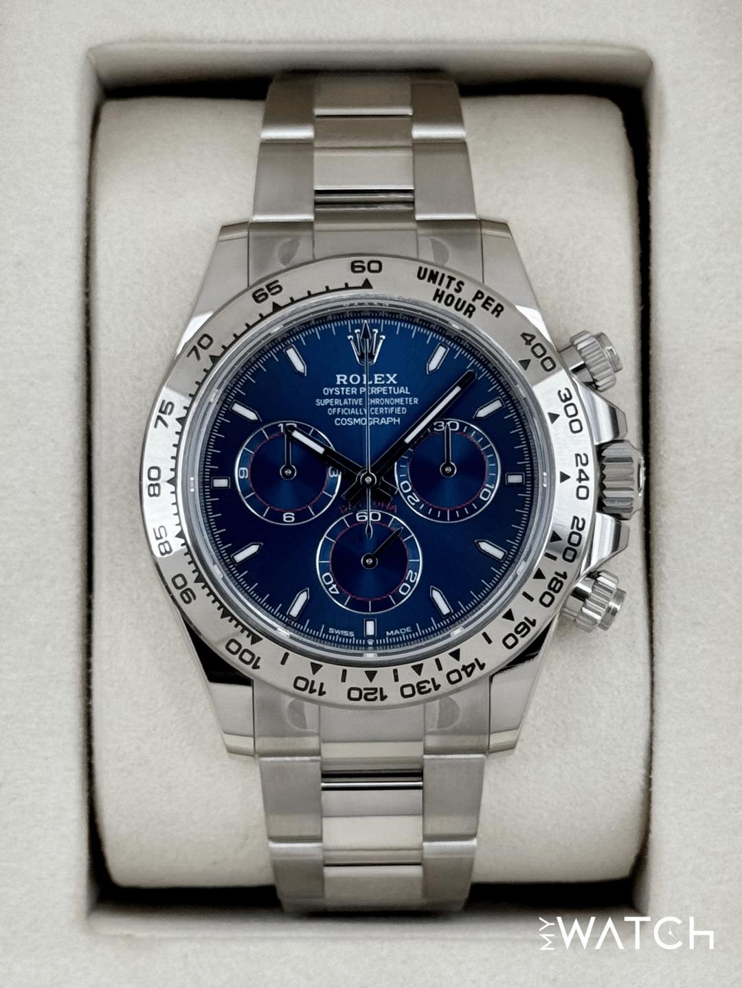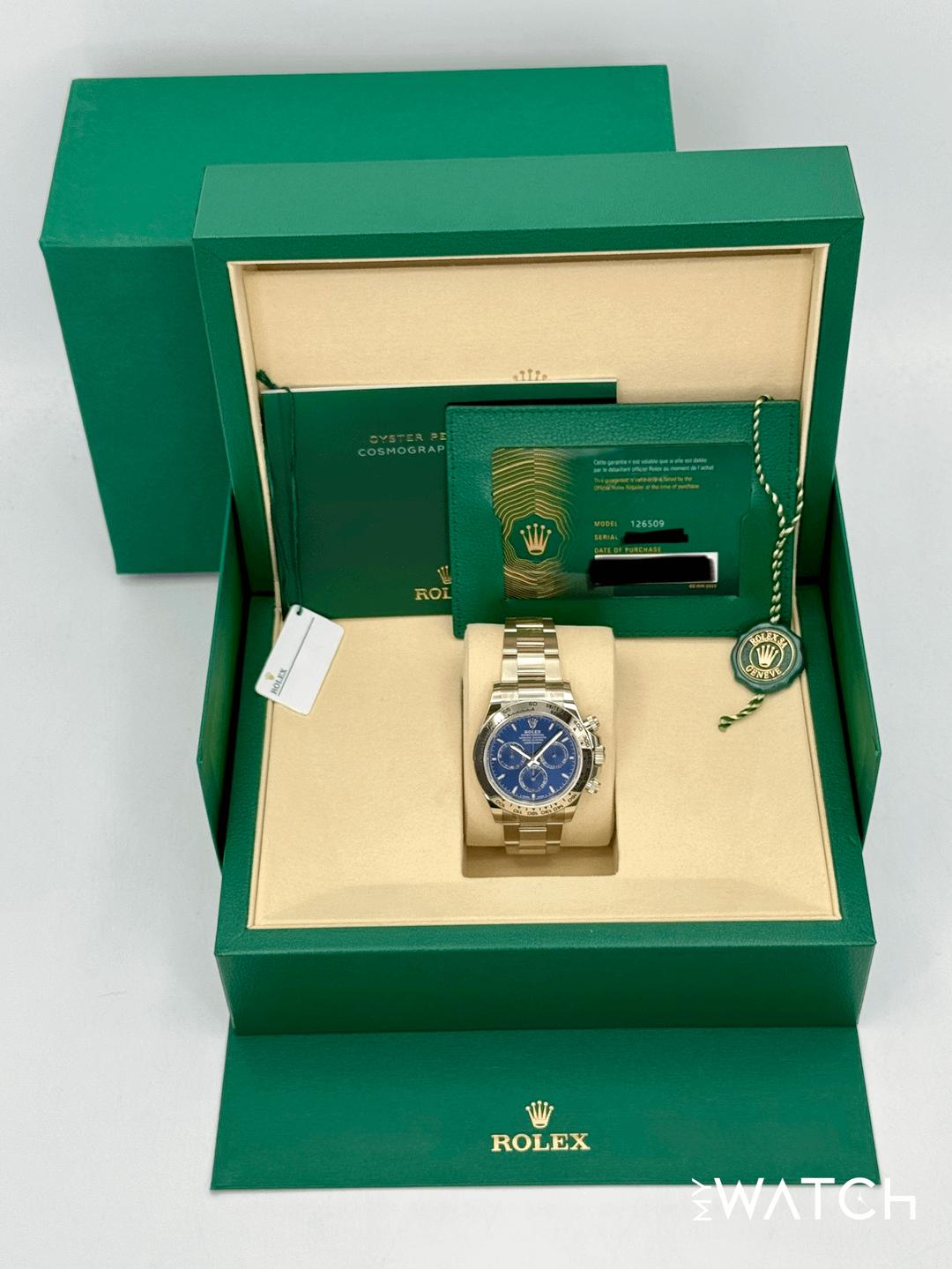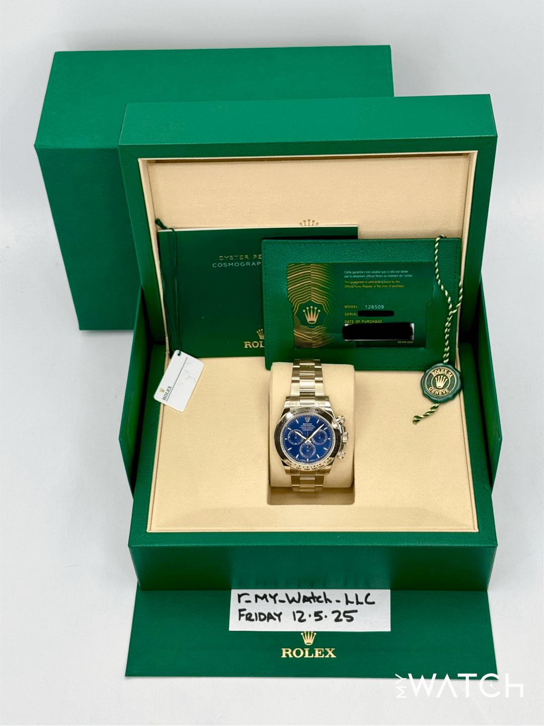 🔵**NEW 2025 Rolex Cosmograph Daytona 40mm 126509 18kt White Gold Blue Dial Oyster Bracelet** 🔵**NOTE: Watch is Factory Rolex Stickered including clasp, end links, crown guard and case back.** 🔵**TRADE or SELL us your luxury watch, all brands considered. Message me details.** **Includes the following:** **✔️BRAND NEW 2025 UPDATED ROLEX BOX (Double Boxed)** **✔️Box and Papers - Yes** **✔️Warranty card dated November 2025** **✔️5 year Manufacturer warranty** **✔️Manual and Warranty booklets** **✔️Green and White Hand Tags** **✔️Bezel Protector** **✔️Size: 8.0inch wrist (Full Links)** **✔️Watch is BRAND NEW/UNWORN** **✔️**[**Trades**](https://mywatchllc.com/pages/sell-rolex-watch) **welcome** Business Name: **My Watch LLC** LOCATION: Oak Park, Michigan ✔️[MyWatchLLC.com](http://mywatchllc.com/) for current inventory ✔️Google Business Listing [https://g.co/kgs/Cmd6FPW](https://g.co/kgs/Cmd6FPW) ✔️Business Hours M-F 9-6 ✔️Facetime/Video chat/calls welcome to view the watch interested. ✔️Contact: 248-422-0909 via text or call for quickest response. 🟢TERMS: Visit [MyWatchLLC.Com](http://mywatchllc.com/) for payments accepted 🟢REFERENCES/REVIEWS: We are well reviewed on all platforms from google, trust pilot, rolexforums, additionally we have 300+ reference in multiple FaceBook watch groups, reference checks welcome. 🟢SHIPPING: If you are not local, we offer Fully Insured FedEx overnight shipping in the USA for a fee. International shipping available. [https://mywatchllc.com/products/new-2025-rolex-daytona-40mm-126509-white-gold-blue-dial-2](https://mywatchllc.com/products/new-2025-rolex-daytona-40mm-126509-white-gold-blue-dial-2)