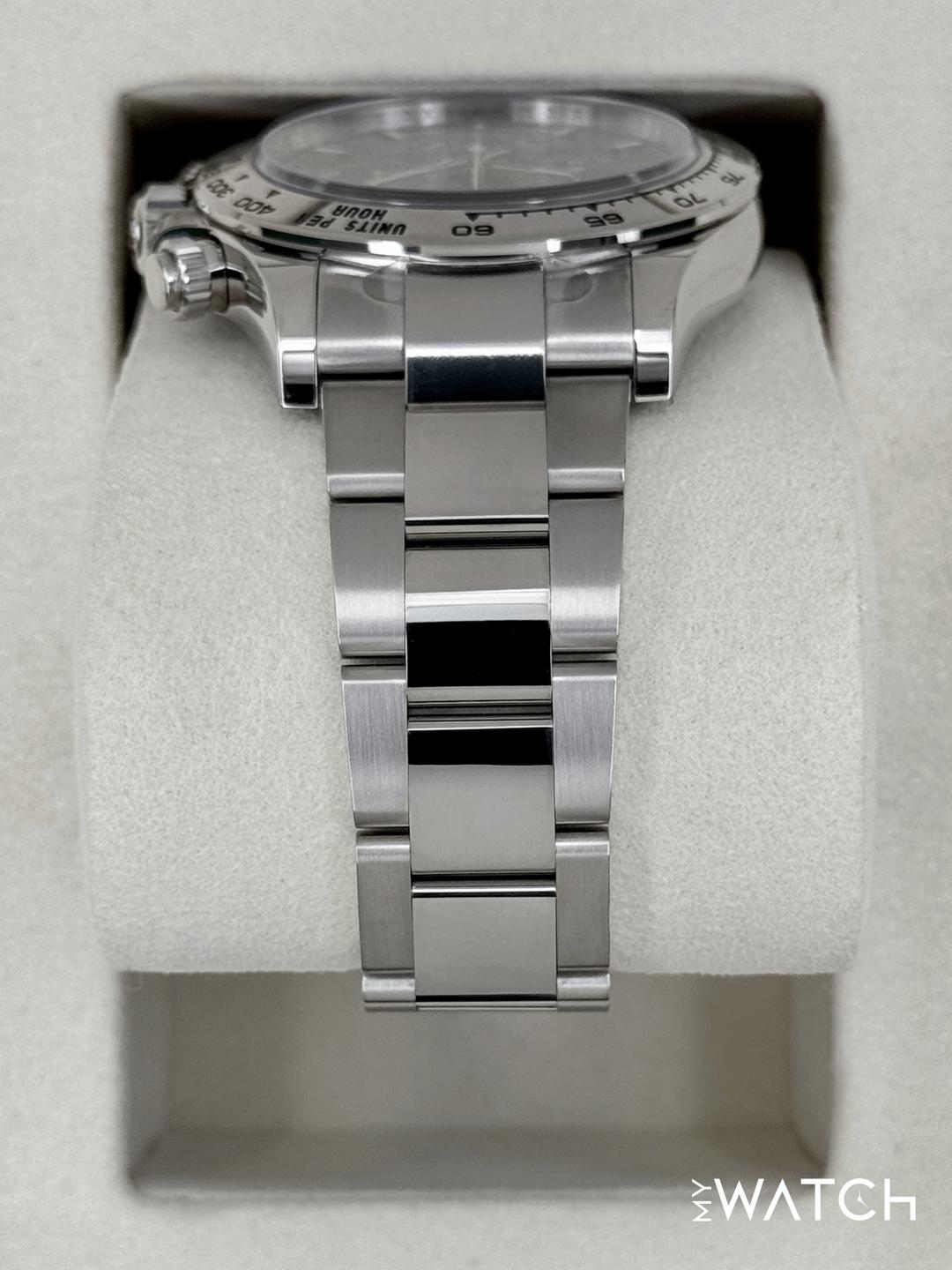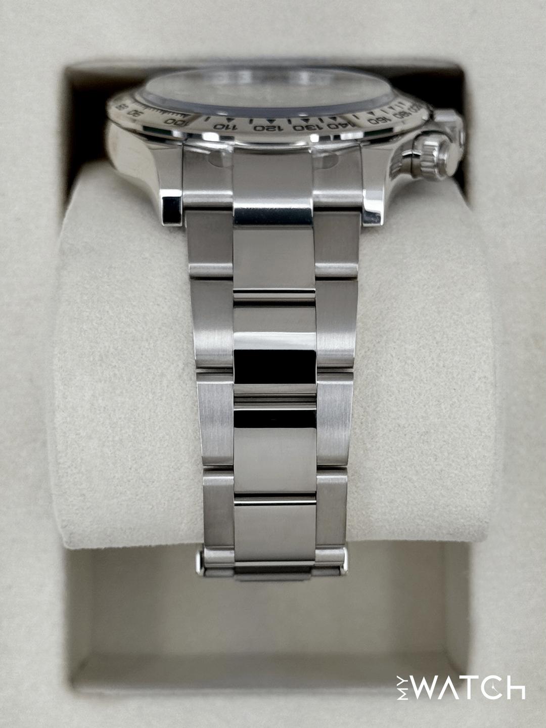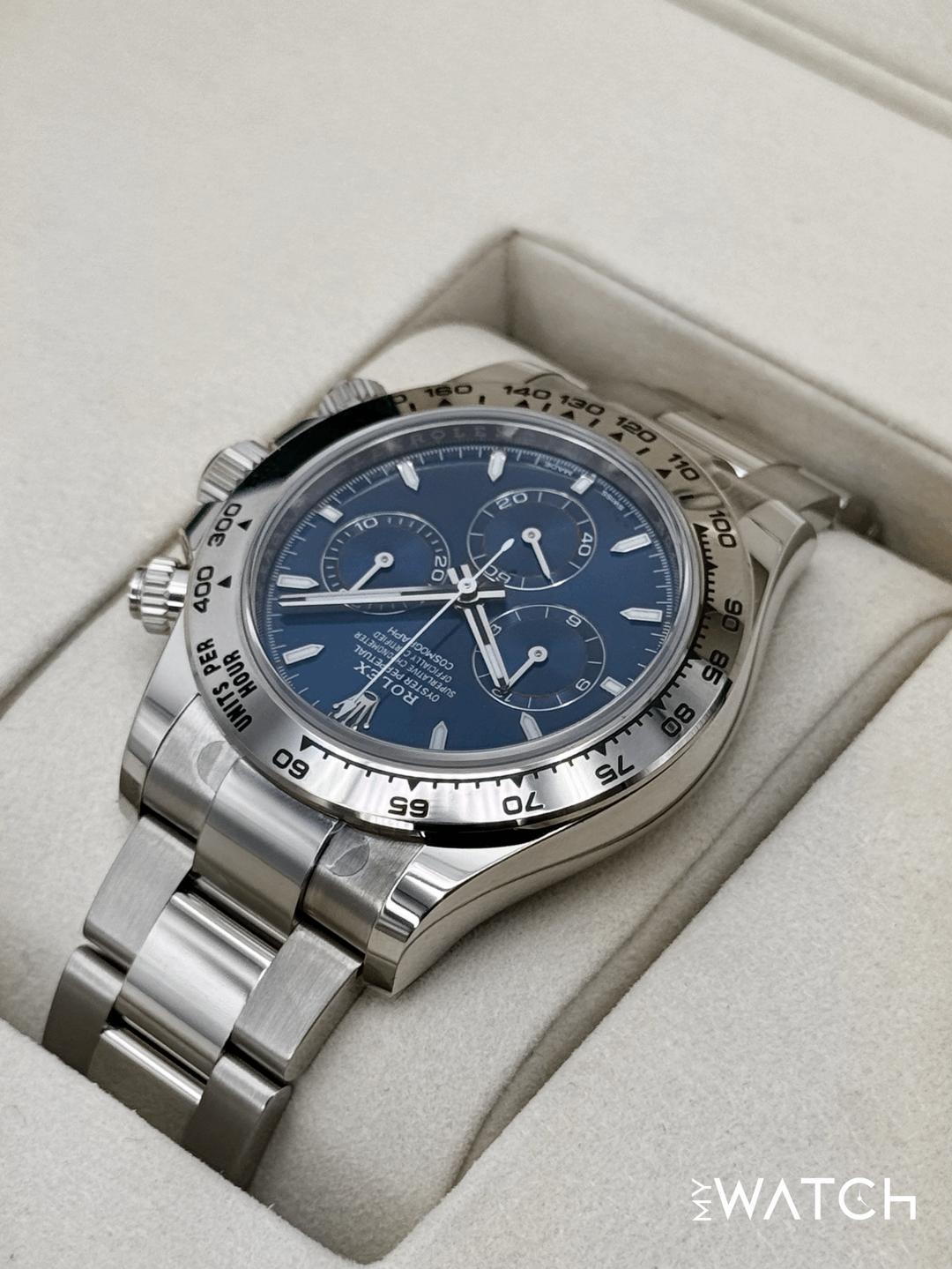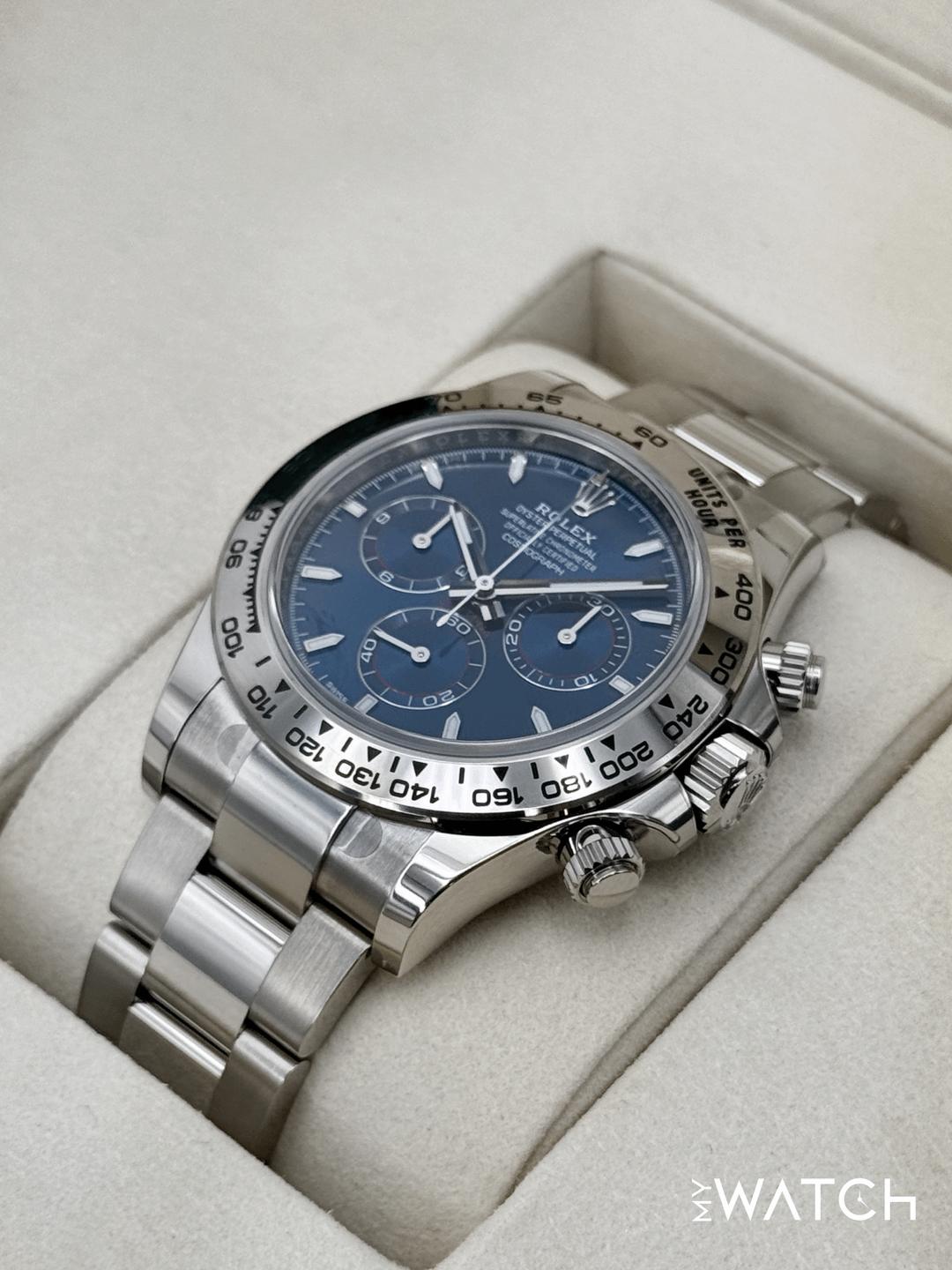 🔵**NEW 2025 Rolex Cosmograph Daytona 40mm 126509 18kt White Gold Blue Dial Oyster Bracelet** 🔵**NOTE: Watch is Factory Rolex Stickered including clasp, end links, crown guard and case back.** 🔵**TRADE or SELL us your luxury watch, all brands considered. Message me details.** **Includes the following:** **✔️BRAND NEW 2025 UPDATED ROLEX BOX (Double Boxed)** **✔️Box and Papers - Yes** **✔️Warranty card dated November 2025** **✔️5 year Manufacturer warranty** **✔️Manual and Warranty booklets** **✔️Green and White Hand Tags** **✔️Bezel Protector** **✔️Size: 8.0inch wrist (Full Links)** **✔️Watch is BRAND NEW/UNWORN** **✔️**[**Trades**](https://mywatchllc.com/pages/sell-rolex-watch) **welcome** Business Name: **My Watch LLC** LOCATION: Oak Park, Michigan ✔️[MyWatchLLC.com](http://mywatchllc.com/) for current inventory ✔️Google Business Listing [https://g.co/kgs/Cmd6FPW](https://g.co/kgs/Cmd6FPW) ✔️Business Hours M-F 9-6 ✔️Facetime/Video chat/calls welcome to view the watch interested. ✔️Contact: 248-422-0909 via text or call for quickest response. 🟢TERMS: Visit [MyWatchLLC.Com](http://mywatchllc.com/) for payments accepted 🟢REFERENCES/REVIEWS: We are well reviewed on all platforms from google, trust pilot, rolexforums, additionally we have 300+ reference in multiple FaceBook watch groups, reference checks welcome. 🟢SHIPPING: If you are not local, we offer Fully Insured FedEx overnight shipping in the USA for a fee. International shipping available. [https://mywatchllc.com/products/new-2025-rolex-daytona-40mm-126509-white-gold-blue-dial-2](https://mywatchllc.com/products/new-2025-rolex-daytona-40mm-126509-white-gold-blue-dial-2)