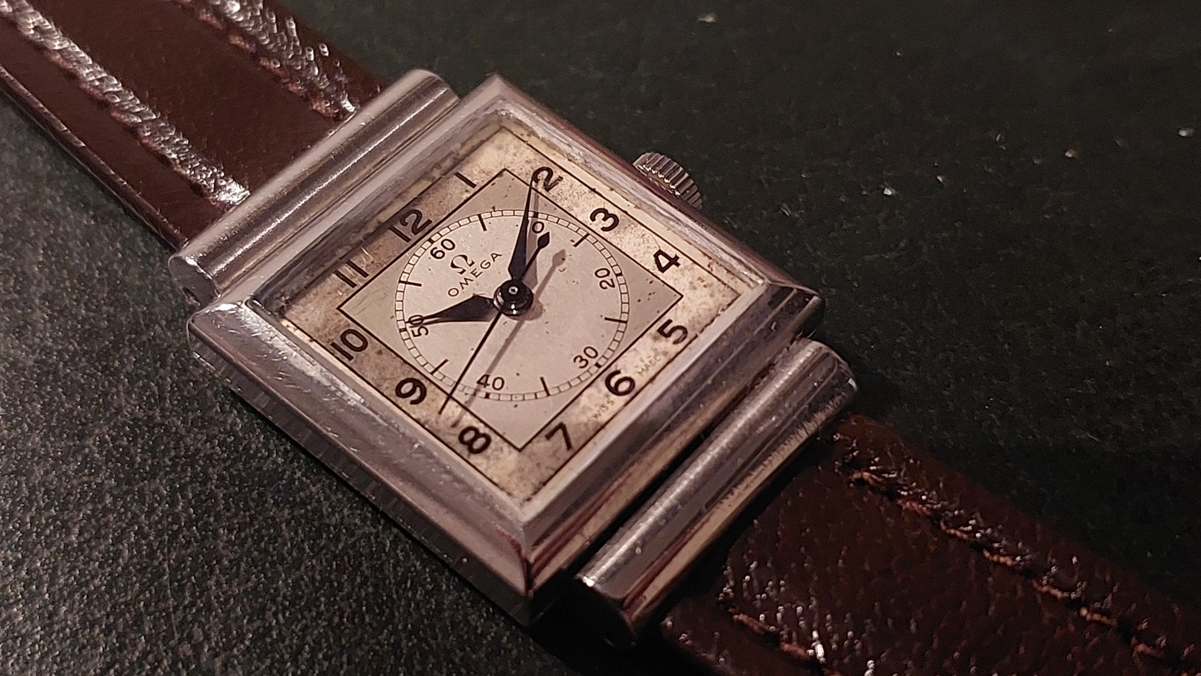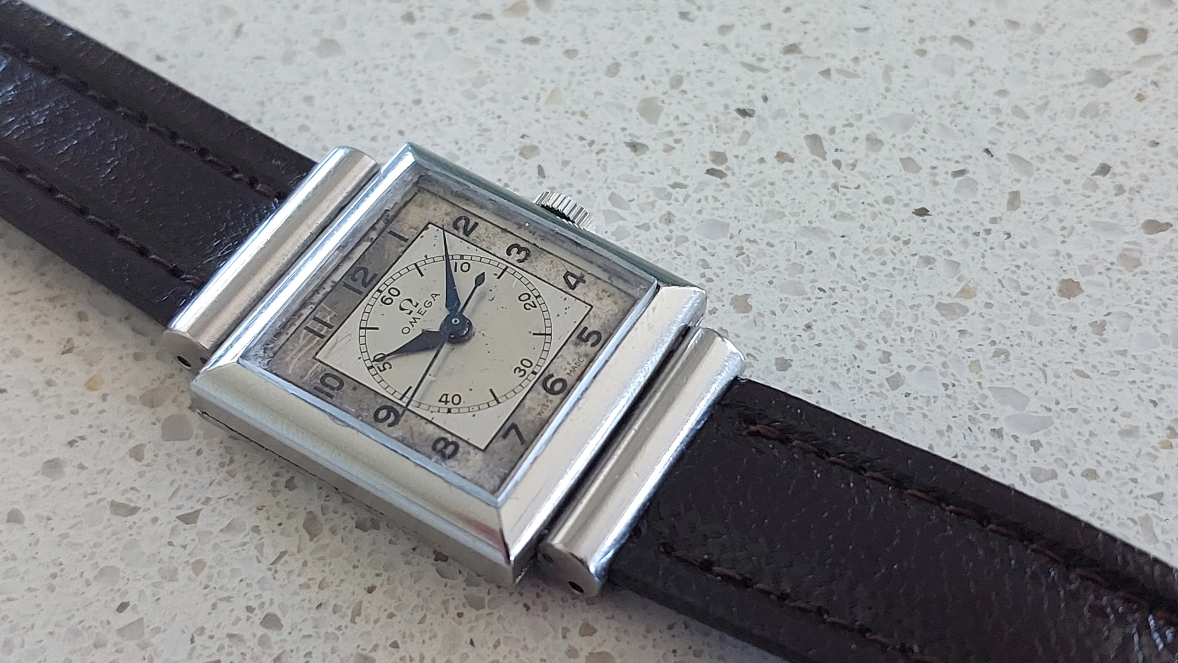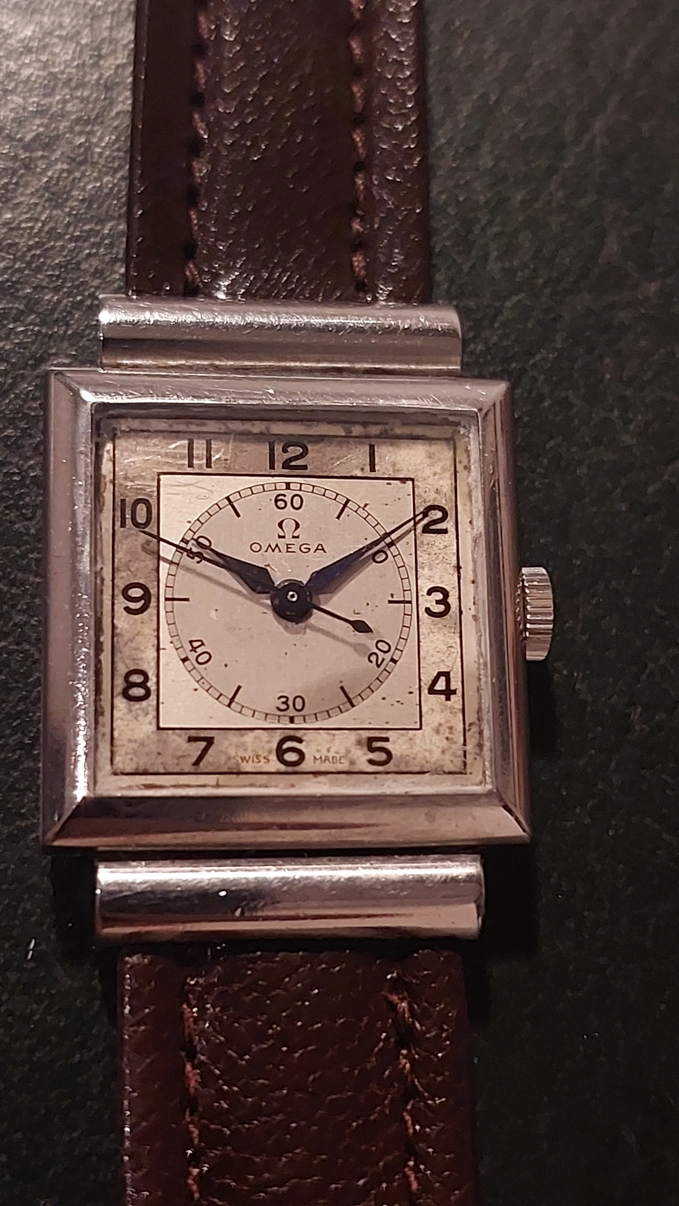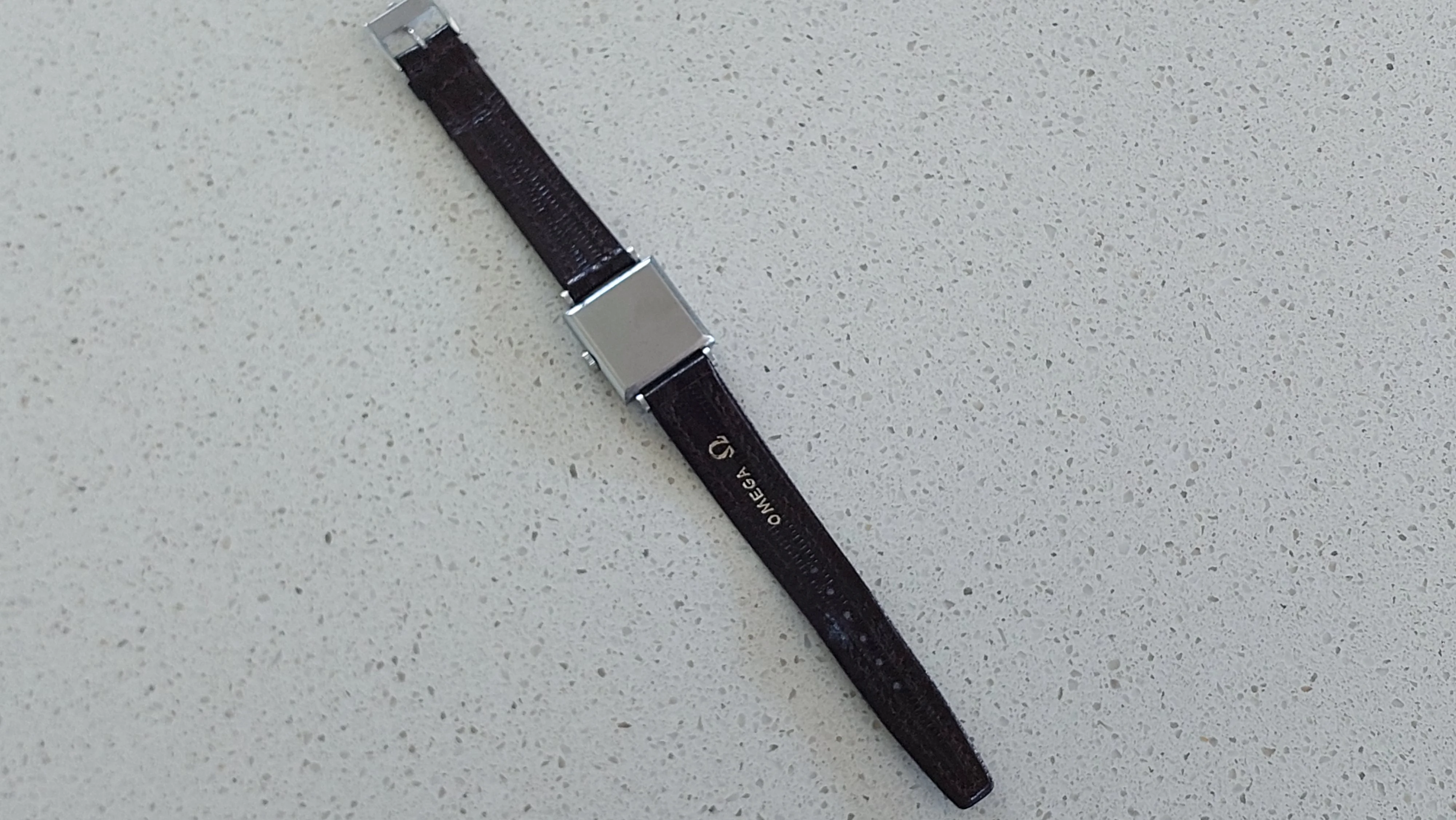 Comes with vintage leather omega branded strap and a non-genuine omega buckle.