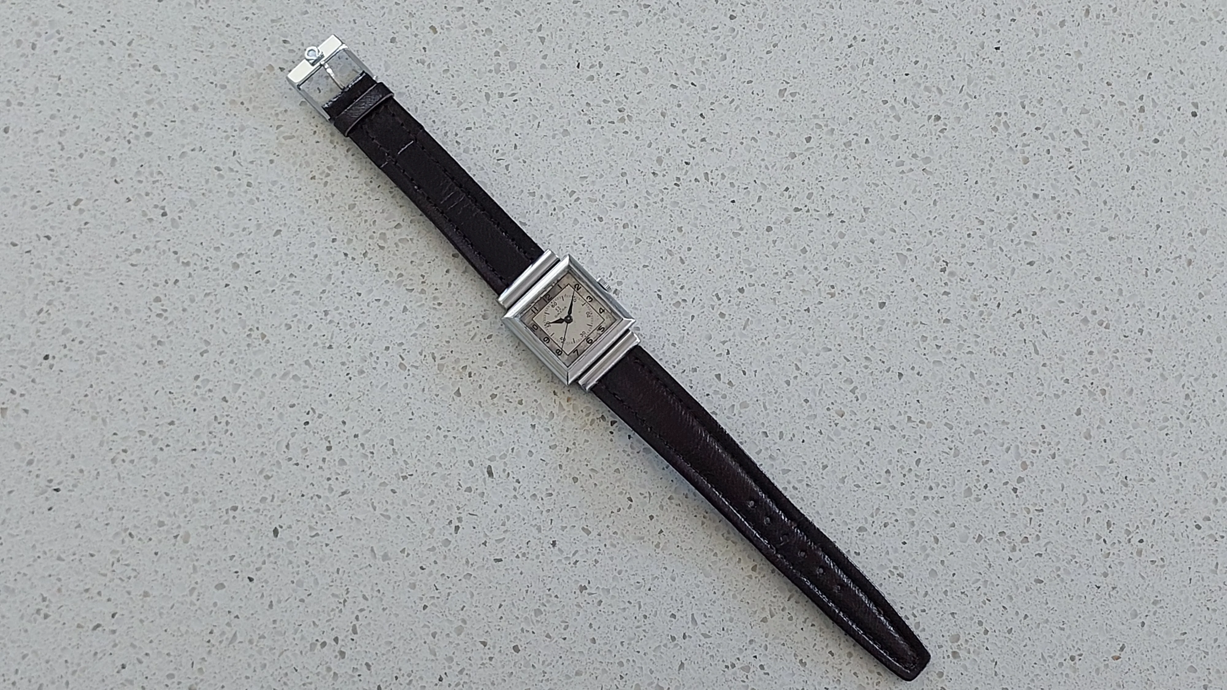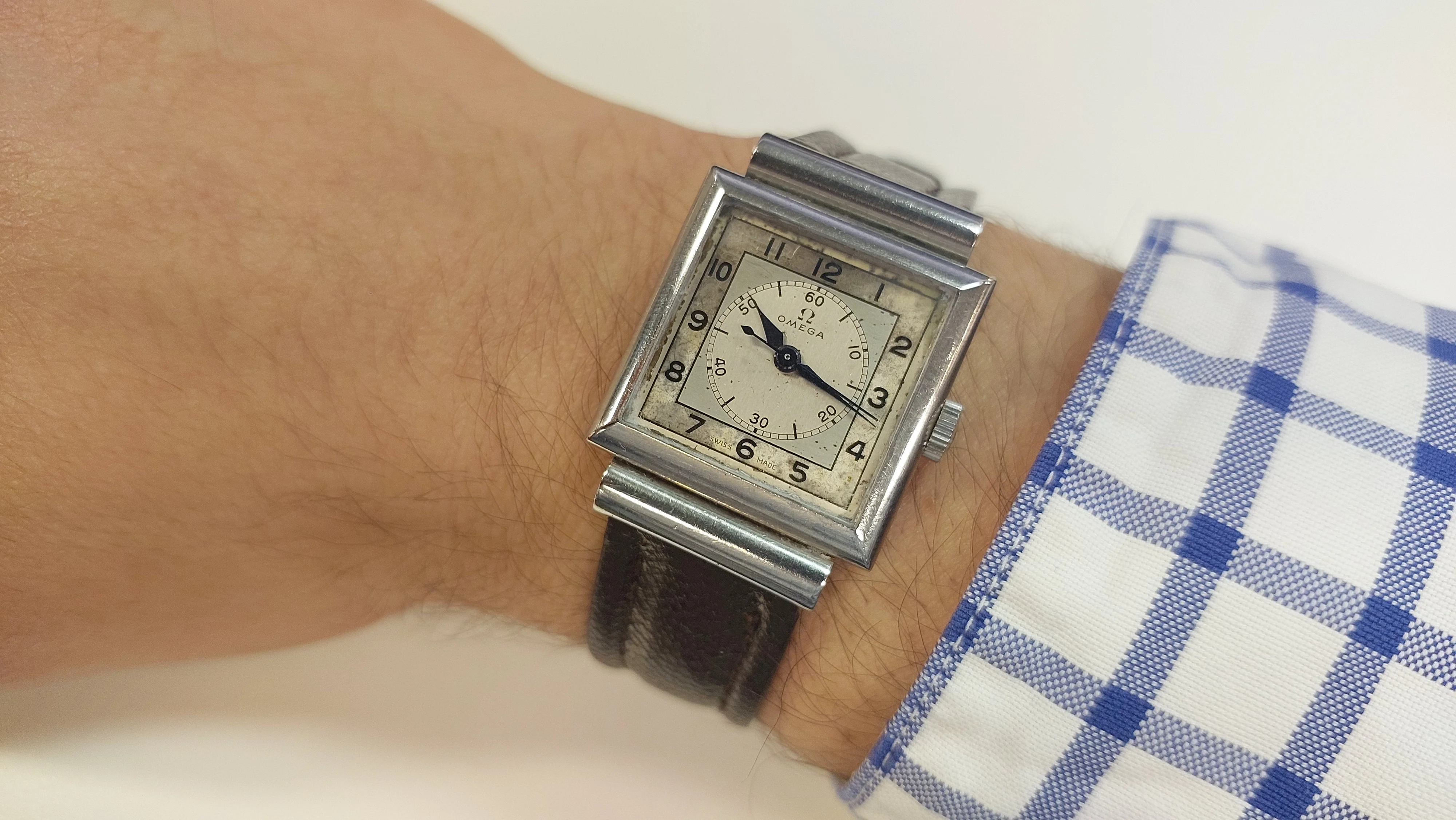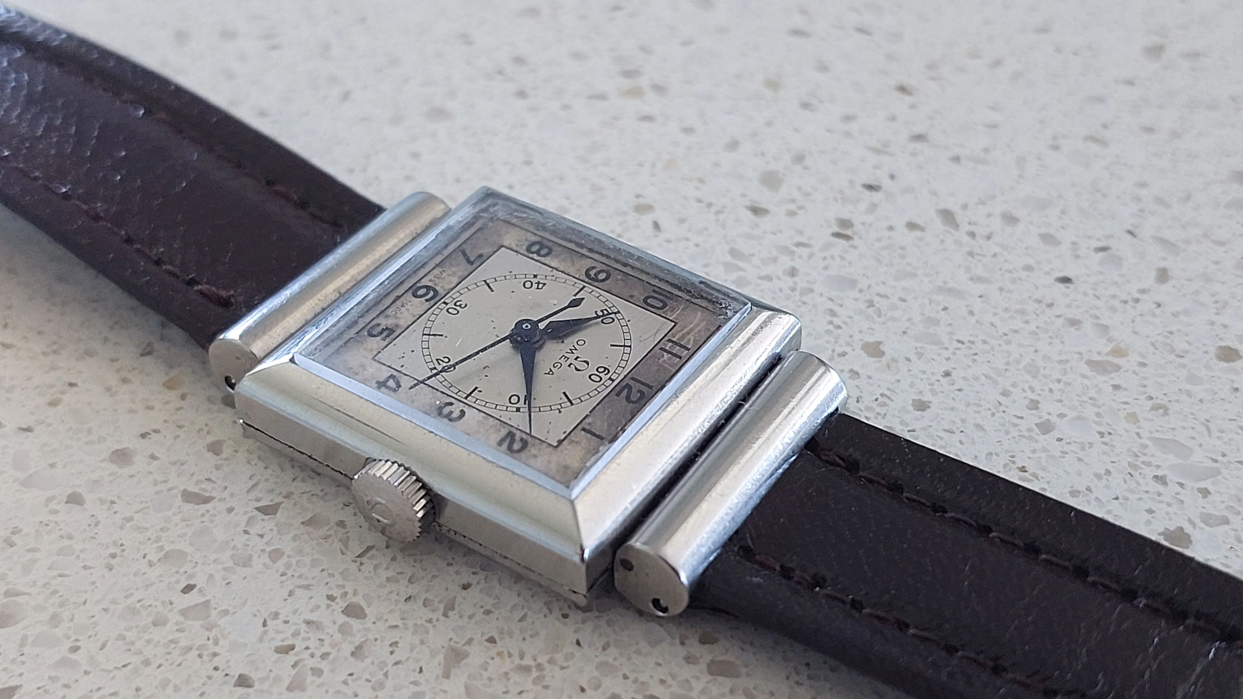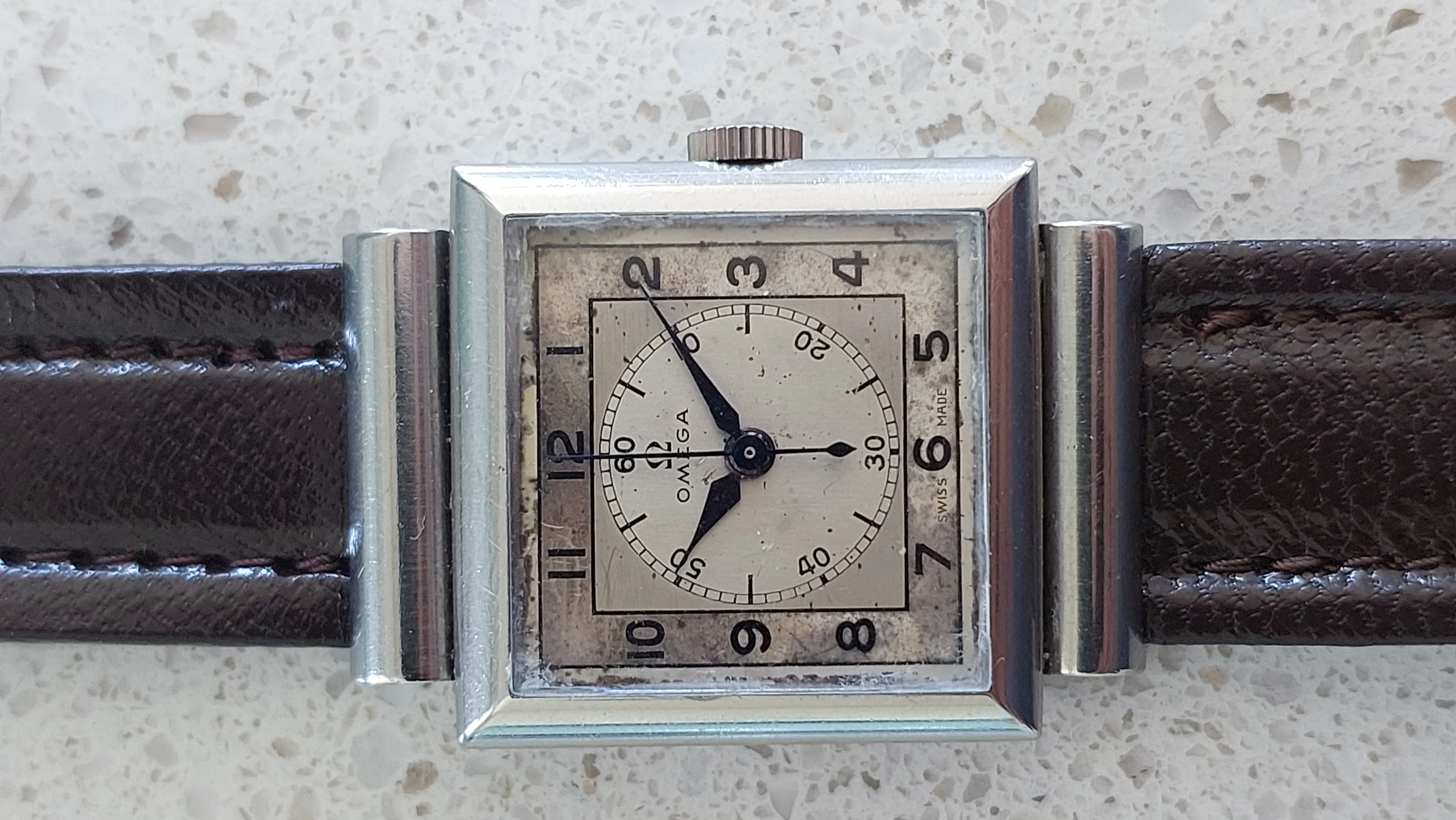 Comes with vintage leather omega branded strap and a non-genuine omega buckle.
