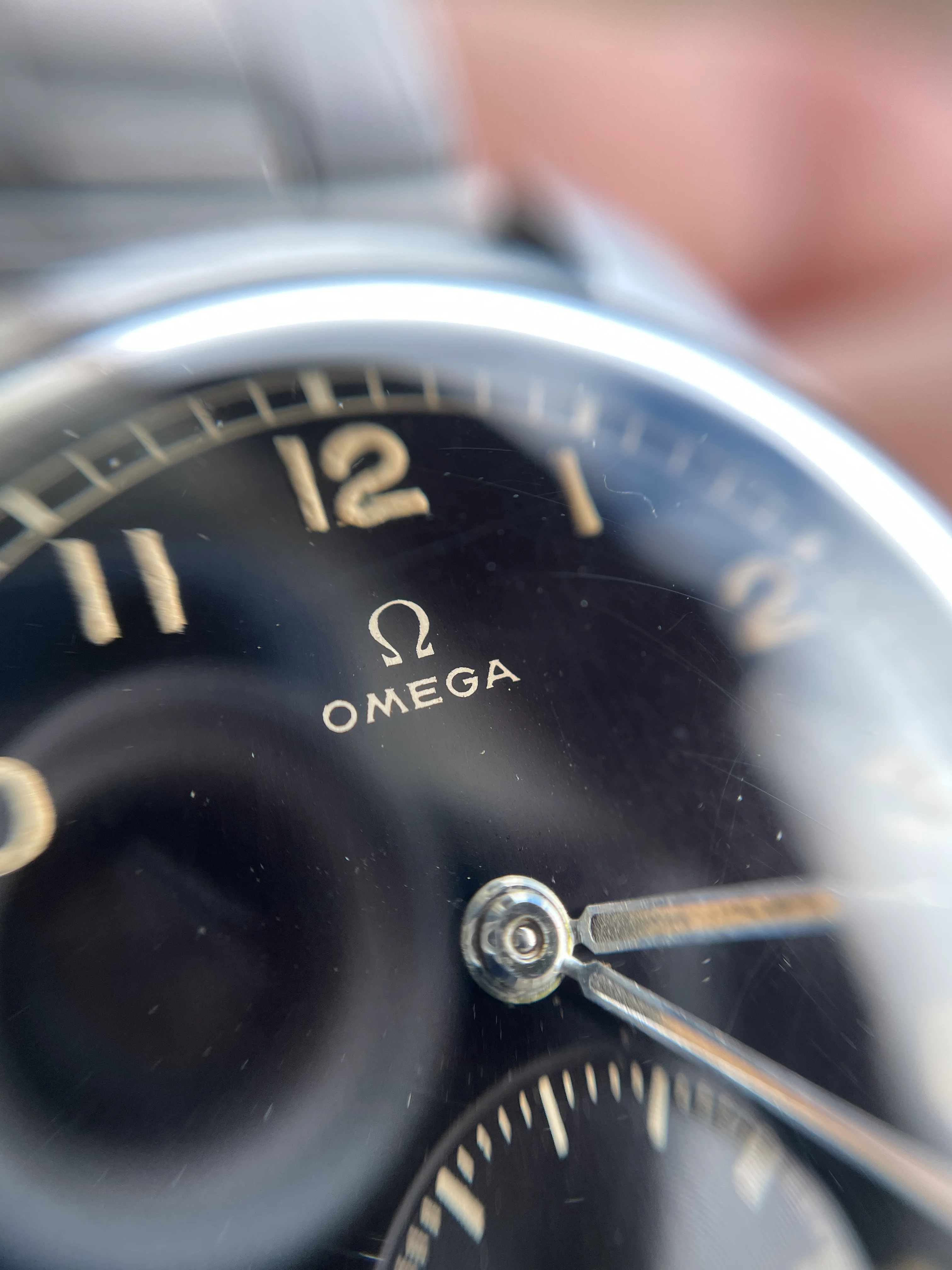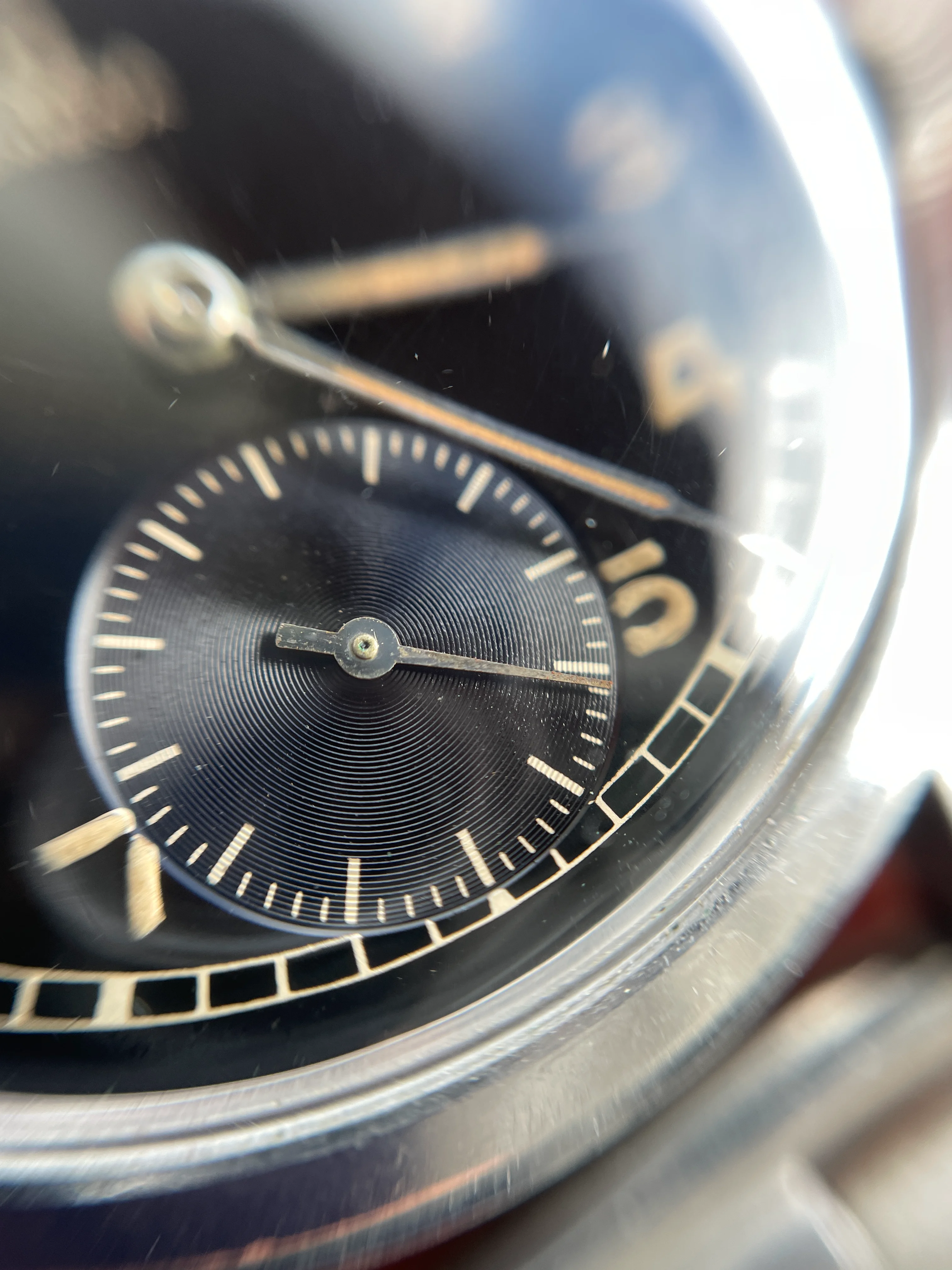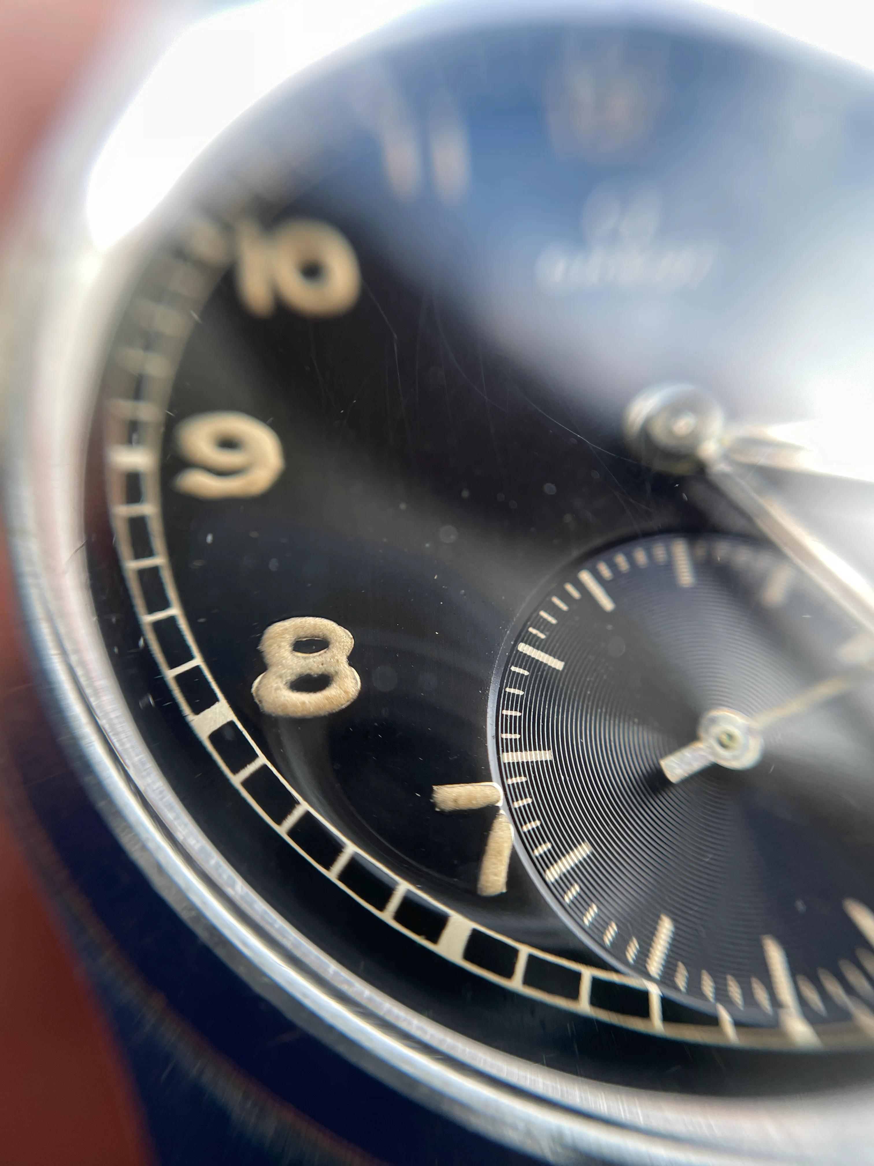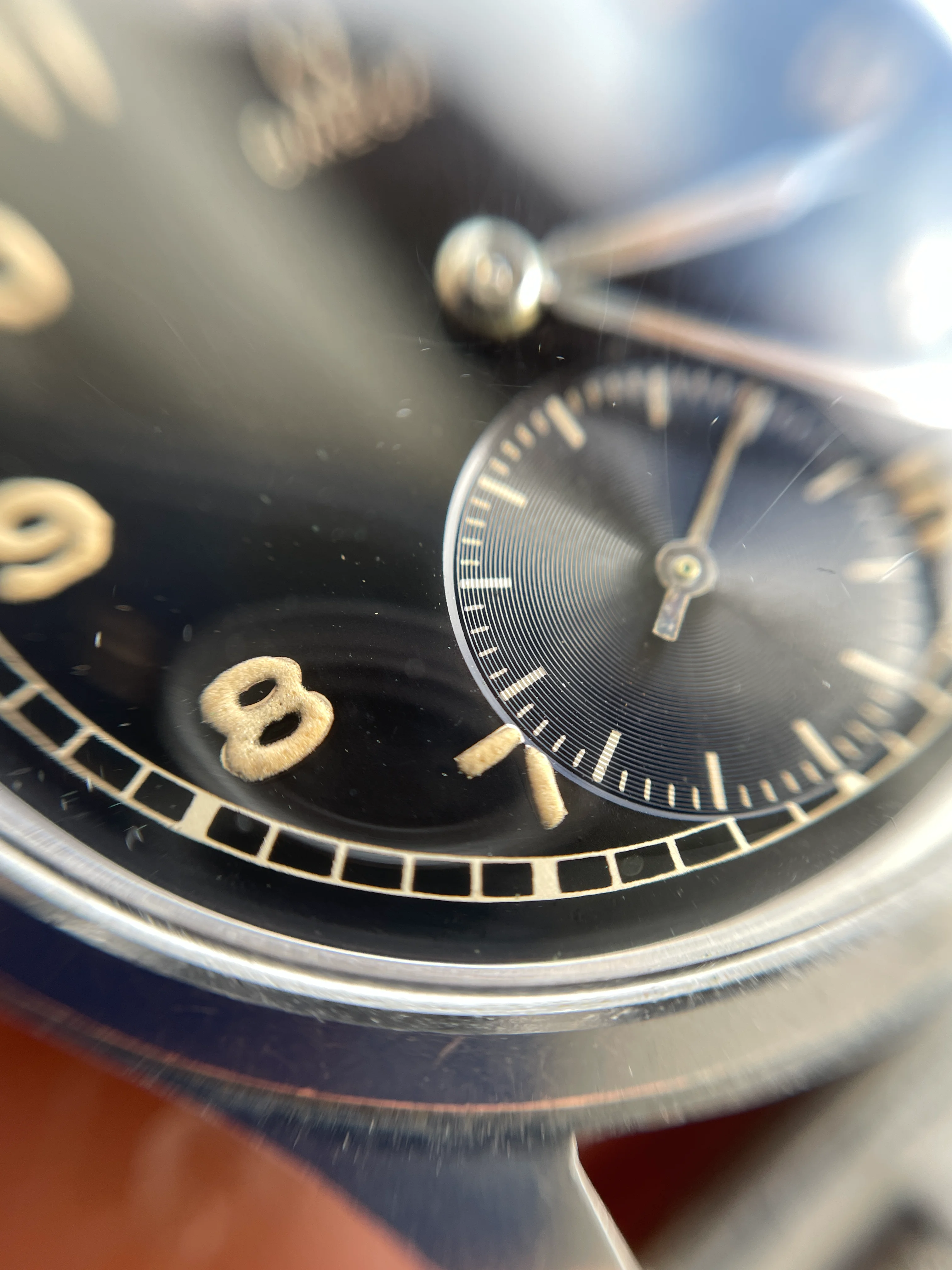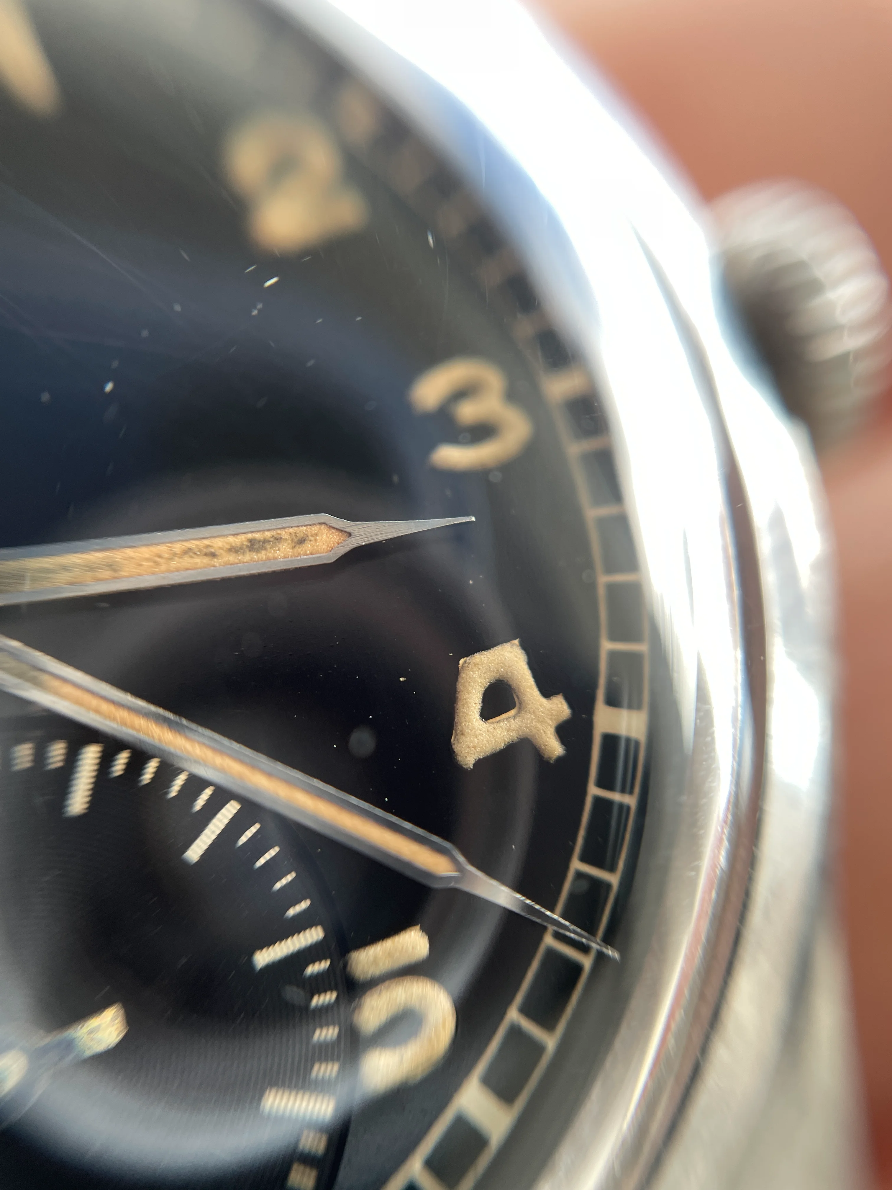 Dial is glossy black and will even look a little brown in sunlight, glossy black dials are very uncommon on the Suveräns and not many have survived this good. The lume is consistent with some minor flaws on the hands, some darker colour towards the center on and some inte the middle of minute hand.
