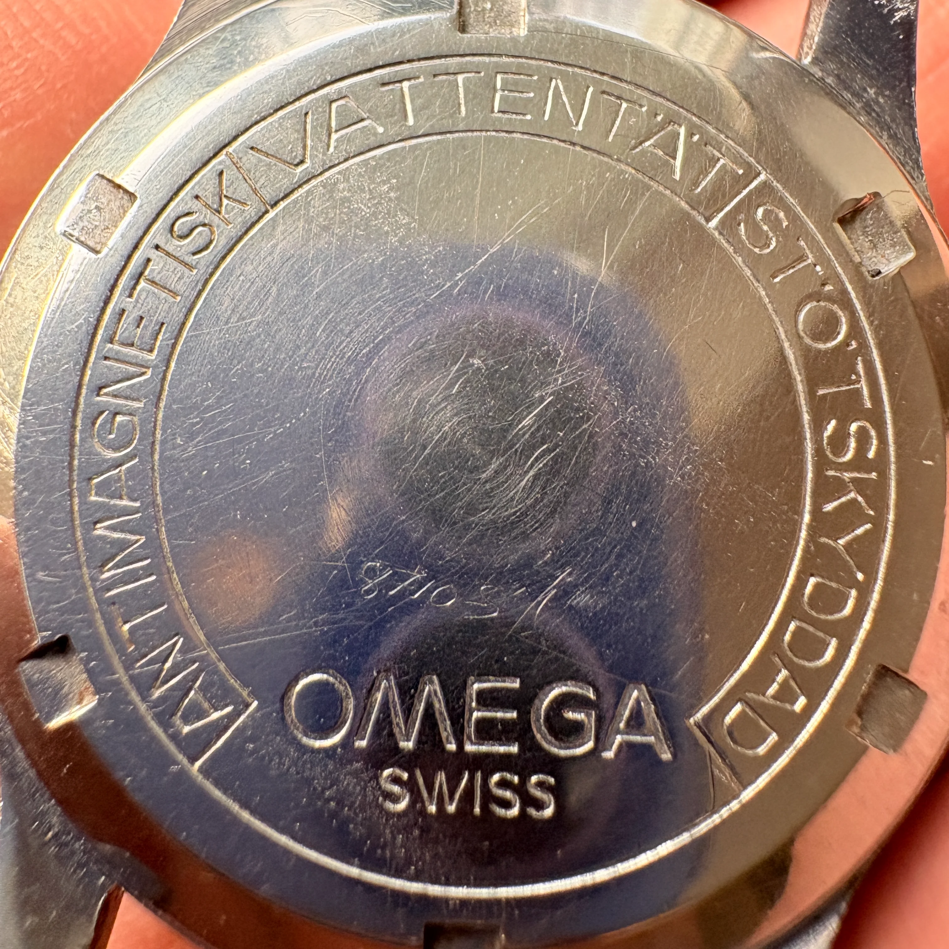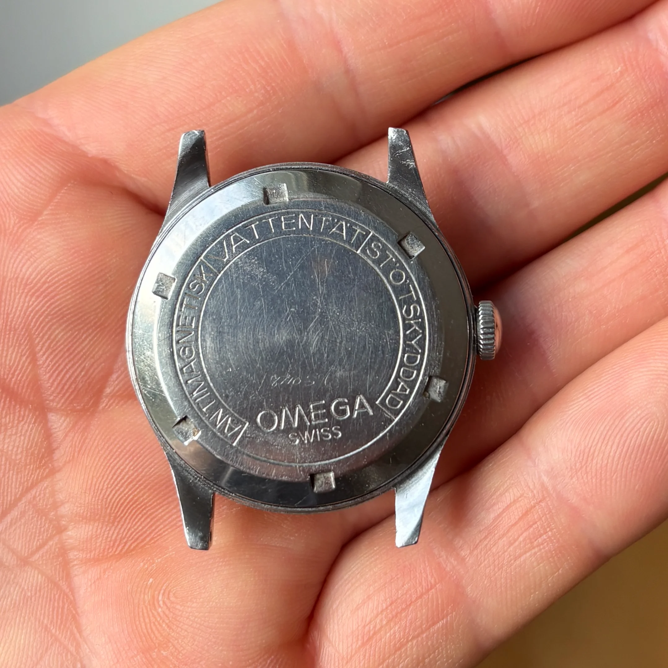 Therefore the Swedish text on the caseback ANTIMAGNETISK-VATTENTÄT-STÖTSKYDDAD meaning "ANTIMAGNETIC-WATERPROOF-SHOCKPROOF".