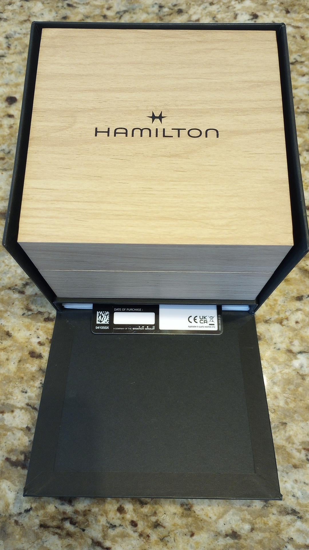 [repost due to imgur links not working. Still not working but added timestamp photo directly to post] Timestamp: https://imgur.com/gallery/yi4uVG2 Album: https://imgur.com/gallery/bHYwnp1 For sale is a very good condition Hamilton Murph 42mm with box and papers. I'm the second owner, purchased on eBay and was authenticated (eBay authentication card included); first owner most likely purchased from a gray market dealer. I've owned this for a little over a month and have worn it every single day. The bracelet is obviously somewhat broken in and there are some small scuff marks on the bezel and one barely noticeable scratch on the bezel (pictured) but otherwise the watch is in excellent condition and is consistently running at about +2 seconds / day. Asking $750 USD or best offer which includes shipping and insurance to continental USA only. I can accept PayPal for payment. I recognize that I am new here and have 0 flair (just made my first purchase here!) however I have been on eBay for 10 years and have 100% positive feedback there. I can provide logged in account verification, do a video call and show government issued photo identification, etc. Thanks for your consideration!