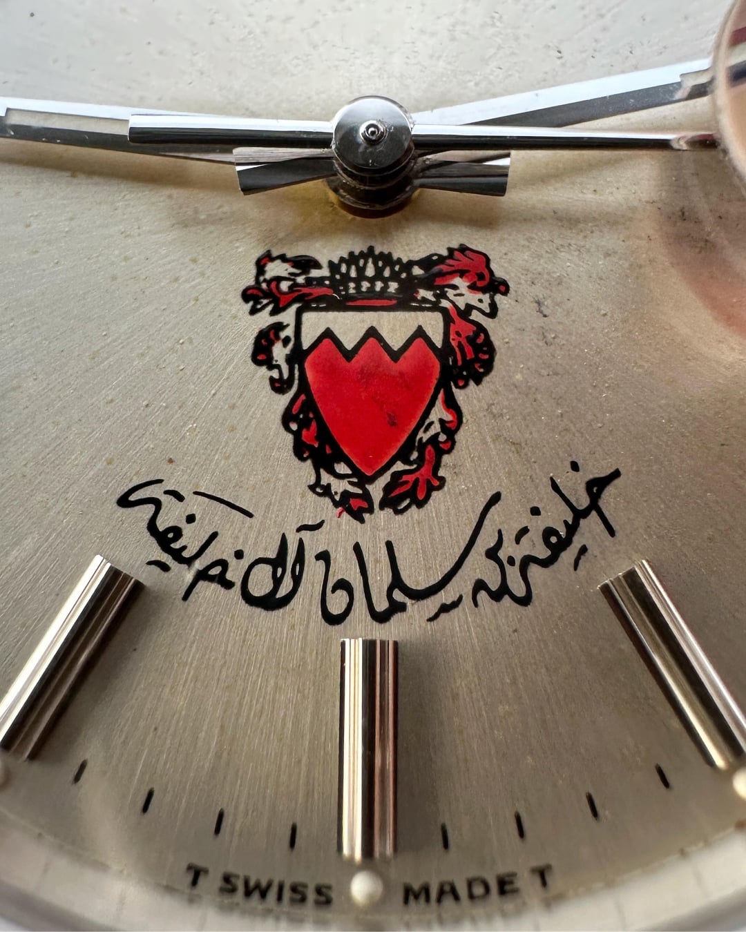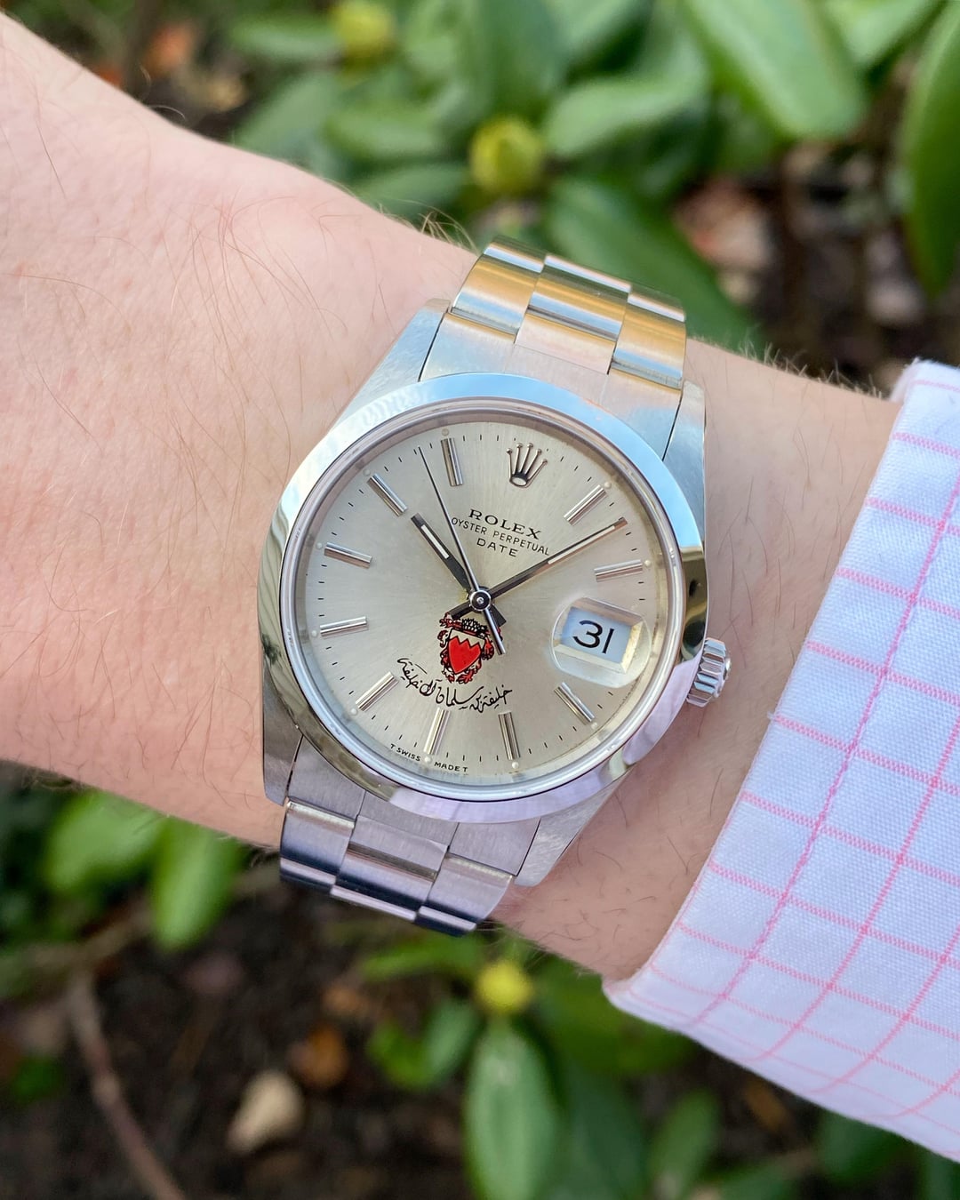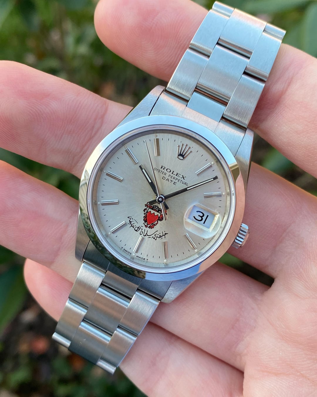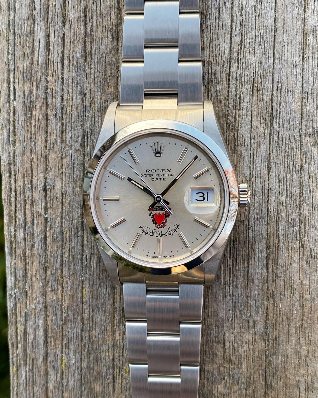 For sale is a mint condition 34mm stainless steel Rolex Oyster Perpetual Date. The Ref. 15200 is an L922,XXX serial example, circa 1989 production. The Oyster Date is fresh from service at Zimmerman Watch Repair, where it received a complete movement overhaul, case refinishing, and a new bracelet, with warranty coverage through late 2027. The 15200 is accompanied by records from its recent service, in addition to its original inner and outer boxes, booklets, COSC hang tag, booklet holder, polishing cloth, and its original 78350 bracelet. The Oyster Date features a brushed steel case with a smooth polished bezel and is mounted on a new, unworn brushed steel 78350 Oyster bracelet. The unworn 78350 bracelet is fully linked with 13 full-size links total and will comfortably fit a 7.3-inch wrist. The original 78350 bracelet included in the sale also contains full links and is stamped with an N3 clasp code, corresponding to a production date of March 1989. The Rolex features a rare silver sunburst factory logo dial with the Royal Bahrain Coat of Arms printed above 6 o’clock, with applied polished white gold index hour markers, polished tritium-coated hands, and a magnified date window aperture at 3 o’clock. The tritium lume plots and hands have acquired a uniform and even light cream-colored patina with age, and present beautifully. The movement used in the 15200 is the Rolex Caliber 3135, which features approximately 48 hours of power reserve. **About the Dial:** The factory logo dial found on this 15200 is exceptionally rare and was specially produced for Khalifa bin Salman Al Khalifa, who served as Prime Minister of Bahrain from January 1970 to November 2020. These dials were produced upon special request for Prince Khalifa and were primarily given out as diplomatic gifts, never having been available for commercial purchase. **Condition:** The case retains thick, symmetrical lugs with crisp factory brush lines. The mounted 78350 Oyster bracelet fitted at service remains unworn, with factory stickers present. The dial shows superb preservation throughout, with only light signs of age present, while the lume on the plots and hands remains fully original and untouched, presenting correctly under UV. Overall, the Oyster Date is in mint condition and is a true piece of both horological and geopolitical history, given its exceptionally rare Bahrain Coat of Arms dial. **Shall deliver for $11,450 with fully insured FedEx shipping included** **Time Stamp:** [**https://imgur.com/a/iYZJvHk**](https://imgur.com/a/iYZJvHk) **Pictures:** [https://imgur.com/a/VDsAt3L](https://imgur.com/a/VDsAt3L) All serial numbers on the watch and papers are fully visible but have been blurred in the photos for security purposes. **Instagram: thewatchguy** **Email:** [**[email protected]**](mailto:[email protected]) **Phone: 410-215-2269** **Feel free to message me, or reach out to me on my cell (410-215-2269) with any questions or inquiries.** **I am an established watch dealer with a substantial track record and extensive references from collectors and dealers alike across TRF, WUS, Facebook, Instagram, eBay, and other well-known enthusiast communities. I am always happy to provide references.** **My username on TRF & WUS is: tclassen**
