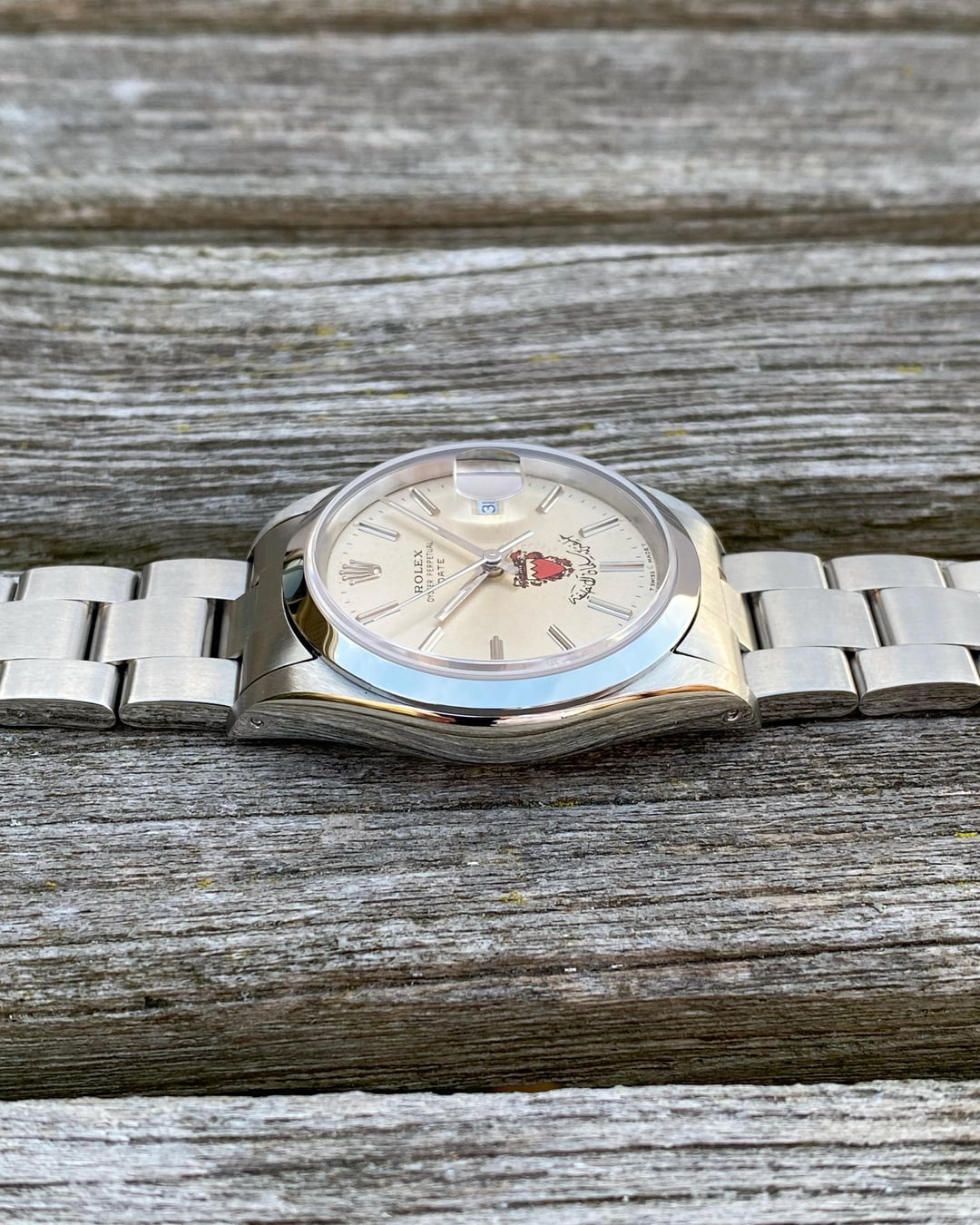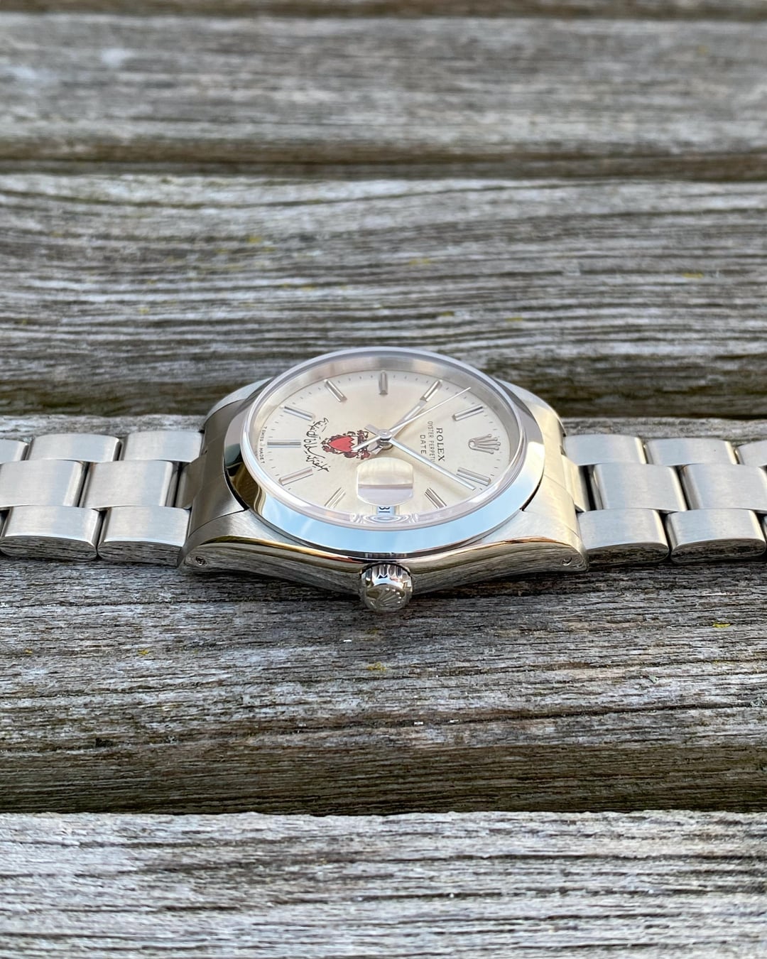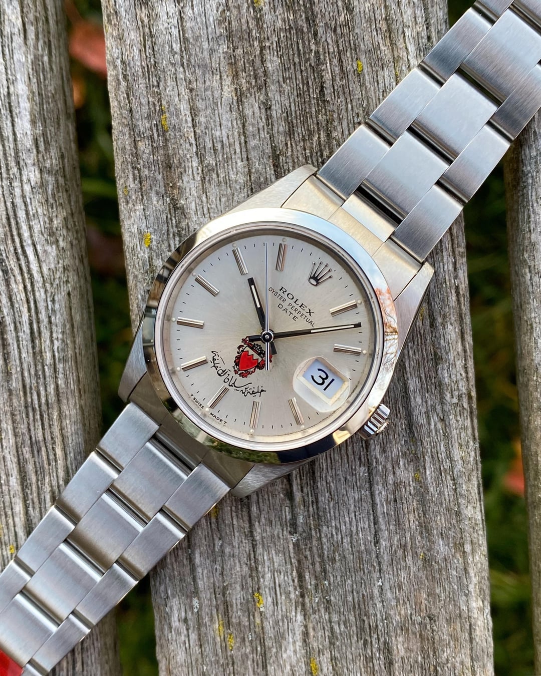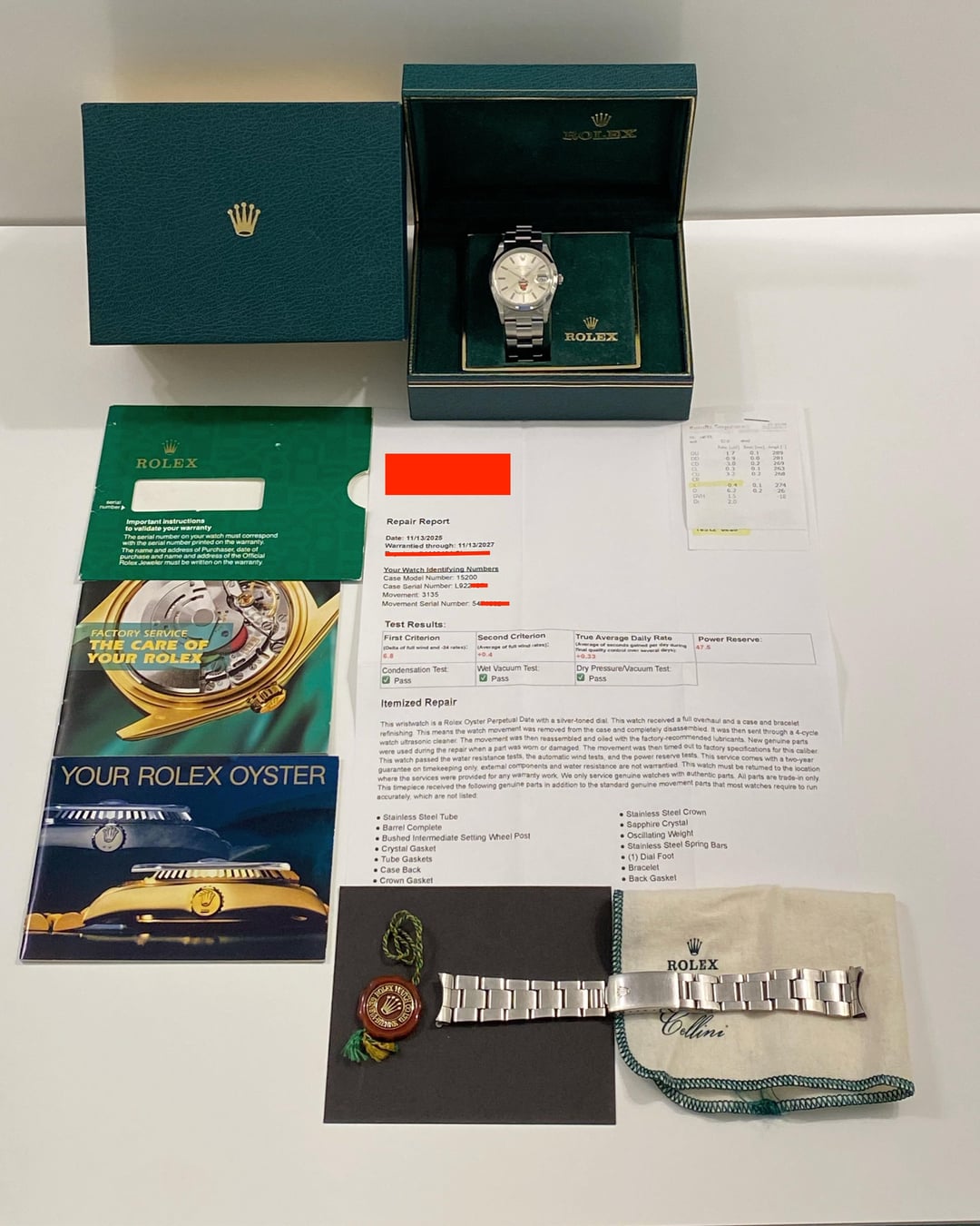 For sale is a mint condition 34mm stainless steel Rolex Oyster Perpetual Date. The Ref. 15200 is an L922,XXX serial example, circa 1989 production. The Oyster Date is fresh from service at Zimmerman Watch Repair, where it received a complete movement overhaul, case refinishing, and a new bracelet, with warranty coverage through late 2027. The 15200 is accompanied by records from its recent service, in addition to its original inner and outer boxes, booklets, COSC hang tag, booklet holder, polishing cloth, and its original 78350 bracelet. The Oyster Date features a brushed steel case with a smooth polished bezel and is mounted on a new, unworn brushed steel 78350 Oyster bracelet. The unworn 78350 bracelet is fully linked with 13 full-size links total and will comfortably fit a 7.3-inch wrist. The original 78350 bracelet included in the sale also contains full links and is stamped with an N3 clasp code, corresponding to a production date of March 1989. The Rolex features a rare silver sunburst factory logo dial with the Royal Bahrain Coat of Arms printed above 6 o’clock, with applied polished white gold index hour markers, polished tritium-coated hands, and a magnified date window aperture at 3 o’clock. The tritium lume plots and hands have acquired a uniform and even light cream-colored patina with age, and present beautifully. The movement used in the 15200 is the Rolex Caliber 3135, which features approximately 48 hours of power reserve. **About the Dial:** The factory logo dial found on this 15200 is exceptionally rare and was specially produced for Khalifa bin Salman Al Khalifa, who served as Prime Minister of Bahrain from January 1970 to November 2020. These dials were produced upon special request for Prince Khalifa and were primarily given out as diplomatic gifts, never having been available for commercial purchase. **Condition:** The case retains thick, symmetrical lugs with crisp factory brush lines. The mounted 78350 Oyster bracelet fitted at service remains unworn, with factory stickers present. The dial shows superb preservation throughout, with only light signs of age present, while the lume on the plots and hands remains fully original and untouched, presenting correctly under UV. Overall, the Oyster Date is in mint condition and is a true piece of both horological and geopolitical history, given its exceptionally rare Bahrain Coat of Arms dial. **Shall deliver for $11,450 with fully insured FedEx shipping included** **Time Stamp:** [**https://imgur.com/a/iYZJvHk**](https://imgur.com/a/iYZJvHk) **Pictures:** [https://imgur.com/a/VDsAt3L](https://imgur.com/a/VDsAt3L) All serial numbers on the watch and papers are fully visible but have been blurred in the photos for security purposes. **Instagram: thewatchguy** **Email:** [**[email protected]**](mailto:[email protected]) **Phone: 410-215-2269** **Feel free to message me, or reach out to me on my cell (410-215-2269) with any questions or inquiries.** **I am an established watch dealer with a substantial track record and extensive references from collectors and dealers alike across TRF, WUS, Facebook, Instagram, eBay, and other well-known enthusiast communities. I am always happy to provide references.** **My username on TRF & WUS is: tclassen**