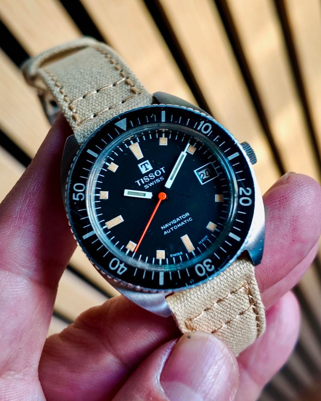 Tissot Navigator Skin Diver ref. 44646 circa 1972 Vintage Tissot is about as good as it gets from design to quality. This caliber 2481 movement is the same as the Omega 1481— both companies developed this in collaboration— and features a quickset push crown for the date. Overall excellent shape except for caseback scratches. Comes on a tan Barton band canvas strap Timegrapher, video, album: https://imgur.com/a/ALLTART Timestamp: https://imgur.com/a/xiNGtlp • 36mm case X 39h X 18 lug width X 11.5cc • no box or papers Box and papers: no * Video is the best way to view the watch if in-person test drive is not available. Due to the different characteristic of the cameras and gadgets used, the color of the watch you purchase may not be the same as shown on this website or on our Instagram. * will consider trades that make sense but please consider time, shipping, and trade value—not market. - local special: can possibly accommodate at ButterScotch in Downtown Long Beach by appointment - All sales final unless the watch is misrepresented or lost in transit (always fully insured) - Link to [feedback here](https://www.reddit.com/r/WatchExchangeFeedback/search?q=soycowboy&restrict_sr=1&sort=new) & [watchcharts here](https://watchcharts.com/repcheck/user/soycowboy?source=reddit&type=feedback) Asking a *negotiable* **$1111** via bank wire, Zelle, venmo, or possibly Apple-pay with super strong references or if I know you. Price includes fully insured Fedex shipping in the USA— hand delivery in long Beach with drinks or coffee on me ;).