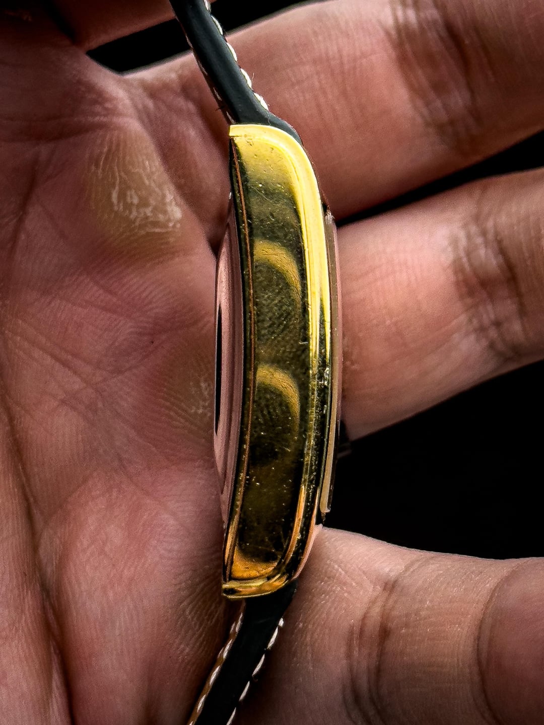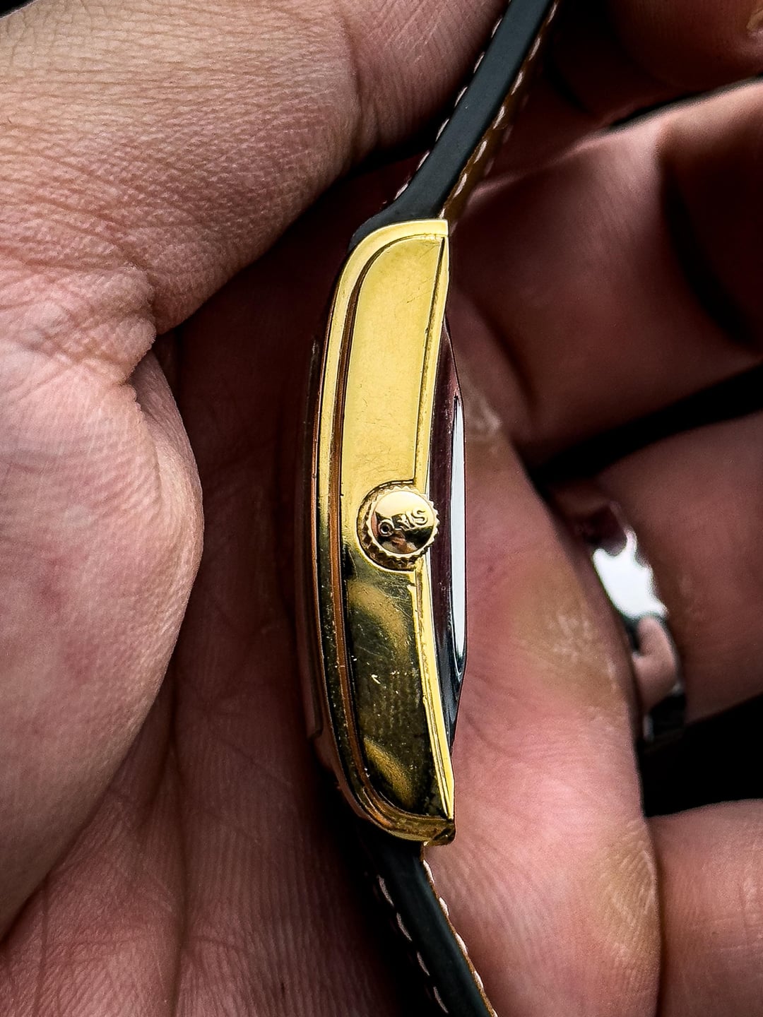 Up for sale is the 1990s Oris 7460B Moonphase Tank in good serviced condition. Images: https://drive.google.com/drive/folders/17uT8zZZdgIs6mEEvHkkwcgXfjHFUbr_c Video: https://drive.google.com/file/d/1rHH8_1bz6RoRFNdi39f8UxrFoSjpVQaE/view?usp=drivesdk Timestamp: https://drive.google.com/file/d/1FL0NJJzNZwUhhXEKQ1FSyI7ucWgRIcUX/view?usp=drivesdk The Oris 7460B Moonphase is a refined vintage timepiece from the 1990s that perfectly captures the charm and ingenuity of Oris during its creative peak. Known for their distinctive complications and classic styling, this model stands out with its rare moonphase and pointer date display housed in a compact, rectangular case — a delightful departure from the usual round designs of the era. The watch features a 26mm Gold plated case with a 38mm lug-to-lug length, offering just the right wrist presence while maintaining a distinctly elegant profile. Its polished surfaces and soft rectangular lines give it a graceful, vintage tank aesthetic, ideal for those who appreciate subtle sophistication. The champagne guilloché dial is a highlight — beautifully textured, it plays with light to reveal depth and warmth. Gold-tone applied markers and dauphine hands complement the dial perfectly, while the pointer date and moon phase complications add a romantic and functional touch. Together, they showcase the unique personality and mechanical creativity that Oris has long been known for. This example remains in good condition for its age, showing scratches here and there which is fitting for its age. The dial is clean and crisp, the crystal is clear and free of scratches. It has been recently serviced and is keeping great time at +/-10s with amplitude of ~290. The watch comes fitted on the custom leather straps with yellow gold buckle. Although it doesn’t come with original box and papers, a standard watch box will be provided upon purchase. Price: $1350 + $60 flat shipping fee (via UPS/DHL with tariffs and duty fee covered). Payment via PayPal F&F or G&S (+4.6% fee paid by the buyer), Wise or Revolut. Not accepting trades. Feel free to message me with any questions or if you're interested. Have a great day! Check out my other watches on Instagram: @jasonswatchcorner