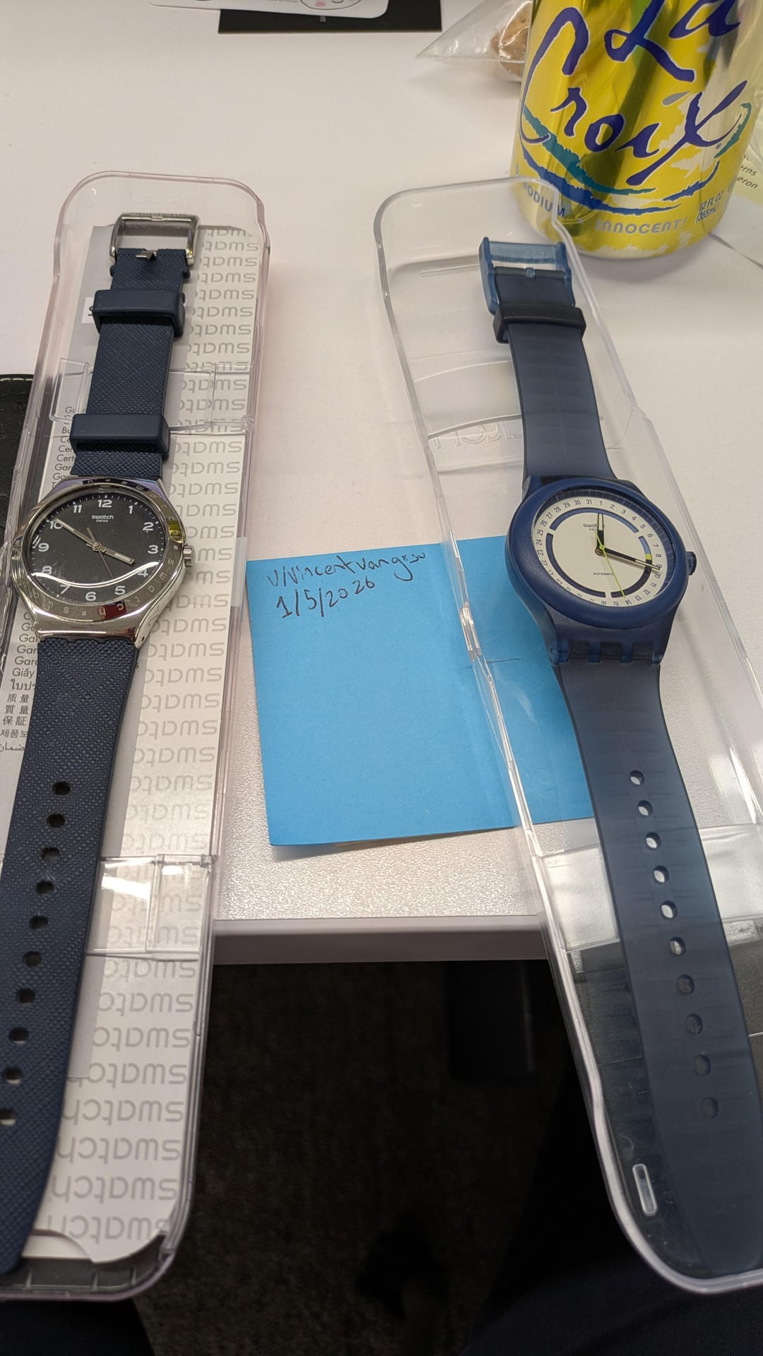 Selling two Swatches in decidedly B-/C+ condition. Swatch x Hodinkee Sistem51 automatic. Has some small scratches on the front glass -- not deep enough to feel with a fingernail and can likely be buffed out. Winds and runs. No box or tag. $50 firm Swatch Inkwell YWS102 Quartz. Small mark on bezel by the 5 o' clock marker. Small scuffs on glass. Brand new 377 battery installed 2 months ago. Comes with original plastic box, which has a small crack. $50 OBO Buy separately or as a bundle for $80 including CONUS shipping via USPS. Bundle price is firm. Can take any additional pictures or videos requested. Can use other shippers on request but will request added payment for other services. Venmo, PayPal, or Zelle.