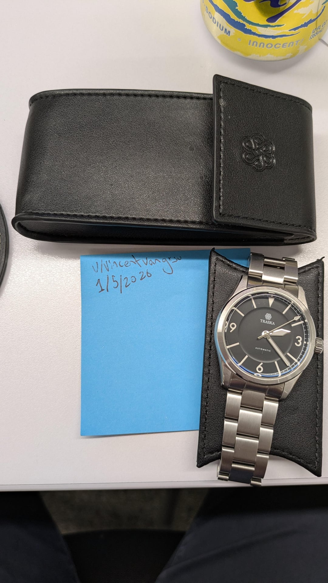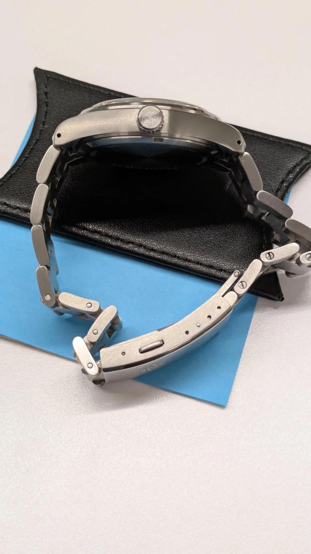 1st edition of Traska Summiteer with black dial. In good shape. Movement keeps good time, well within tolerance. Generally seems to be about -/+ 8s. Comes with full links installed, as well as a Traska branded leather case. Haven't measured the bracelet, but I was wearing with 3 links removed to fit my 7.5in wrist. There are some scratches on the clasp and one tiny scratch in the crystal, which I attempted to document. It is visible in picture 4 (watch turned sideways with 6 o' clock to the left, the scatch runs horizontally and can be seen to the left of the A in "Automatic"). I will say it is insanely difficult to spot if you're not looking for it and even if you know where it is. Looking for $305 shipped CONUS. Price is firm. I accept Venmo, PayPal, and Zelle. Please comment before sending DM, and feel free to ask for any questions or pictures you'd like. Happy to do a video call if needed.