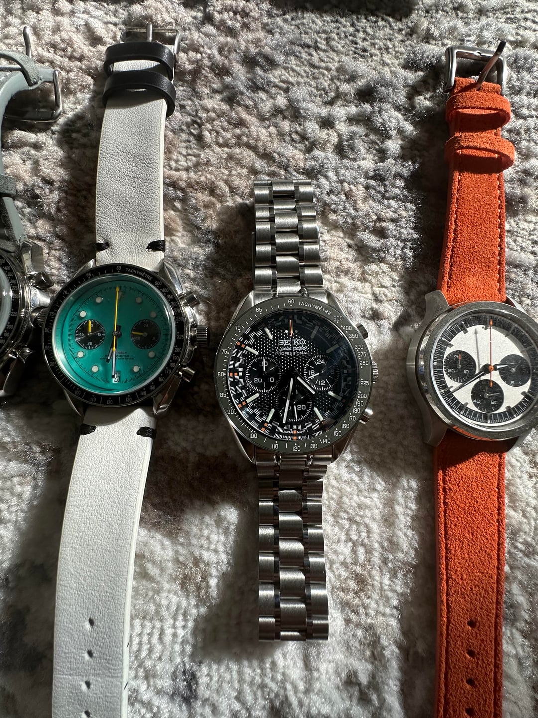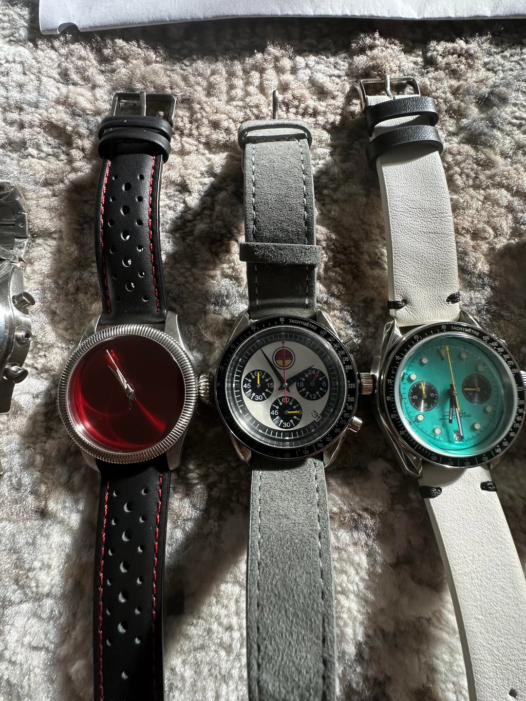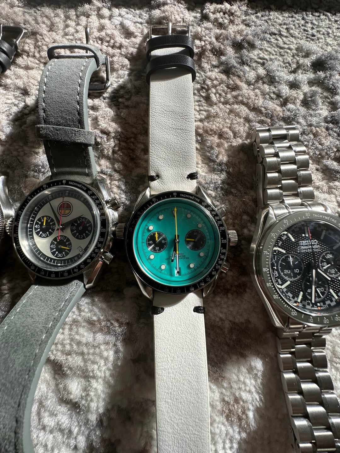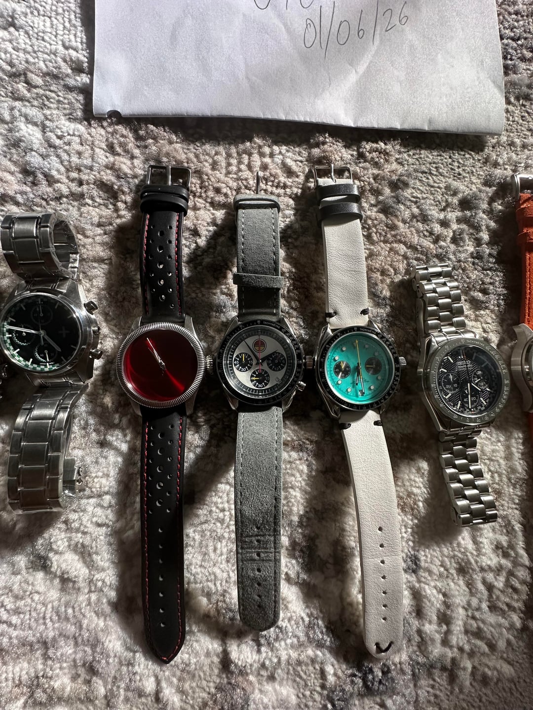 1. Pagani Design day/date Daytona- $30 + Shipping. No extra links. A few minor scuffs. 39mm *SOLD* 2. Brand new modded black and green dial mecaquartz Chronograph- all links included- $60 + shipping. 38mm 3.Oxblood sterile dial NH35 watch - 39mm- $90 + shipping 4. Sunset/white dial modded speedy chronograph- gray suede strap- mecaquartz- $60- 40mm 5. Tiffany blue speedy chronograph - 40mm - $50 6. Seiko dial speedy watch- 39mm -$80 7. Sterile dial chronograph with orange suede strap- $70