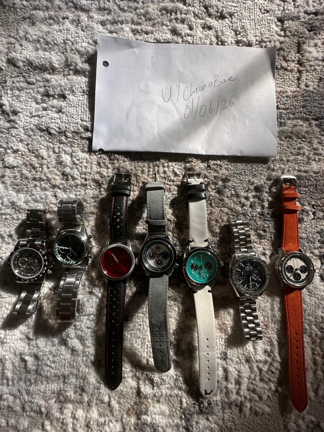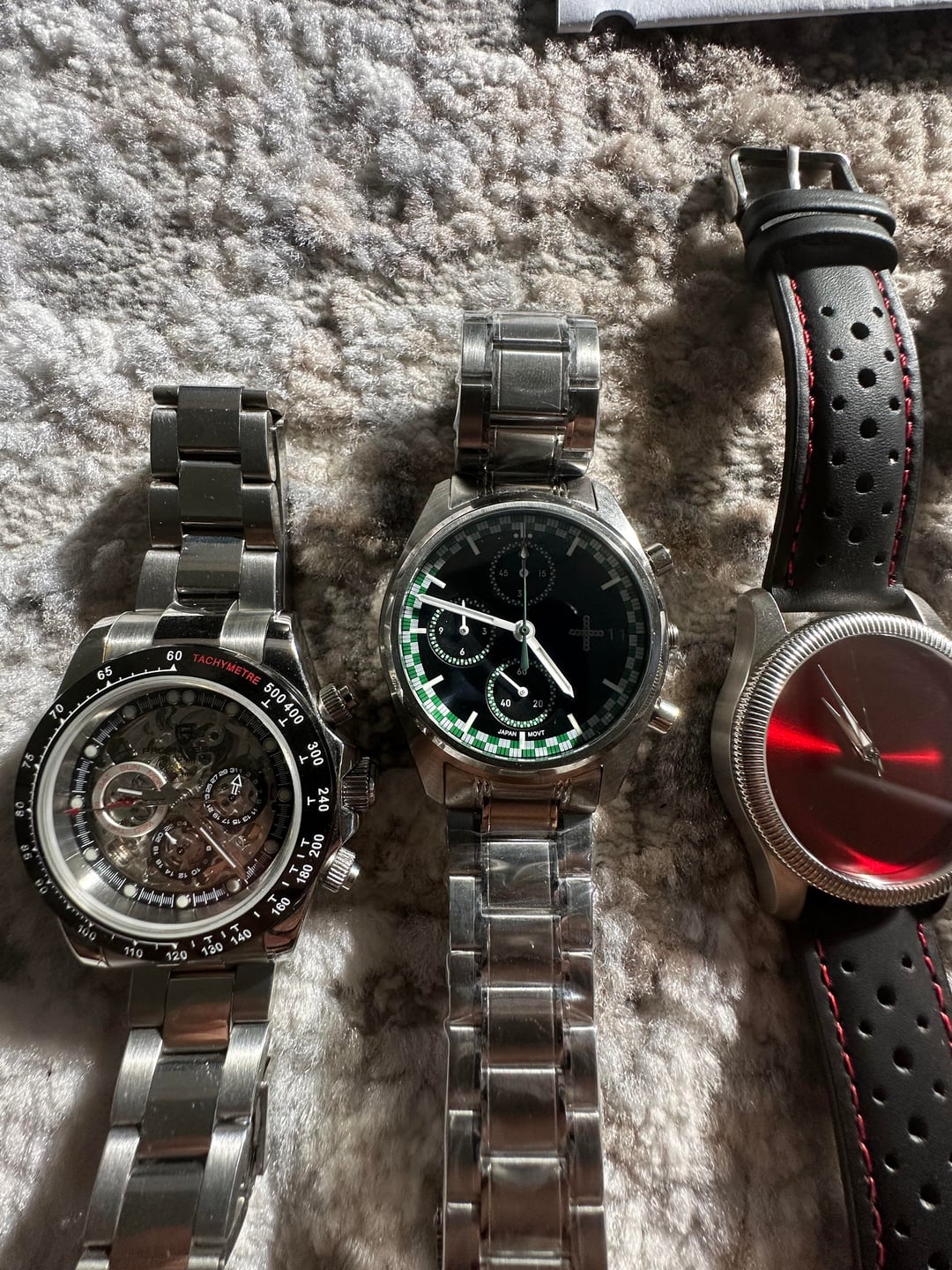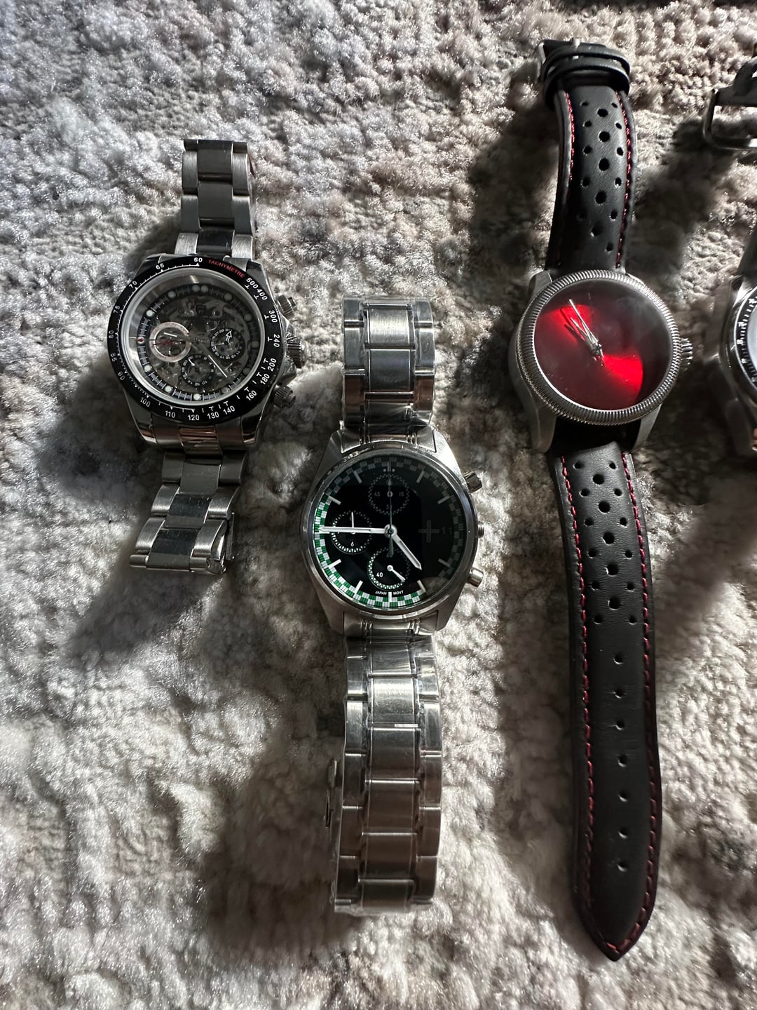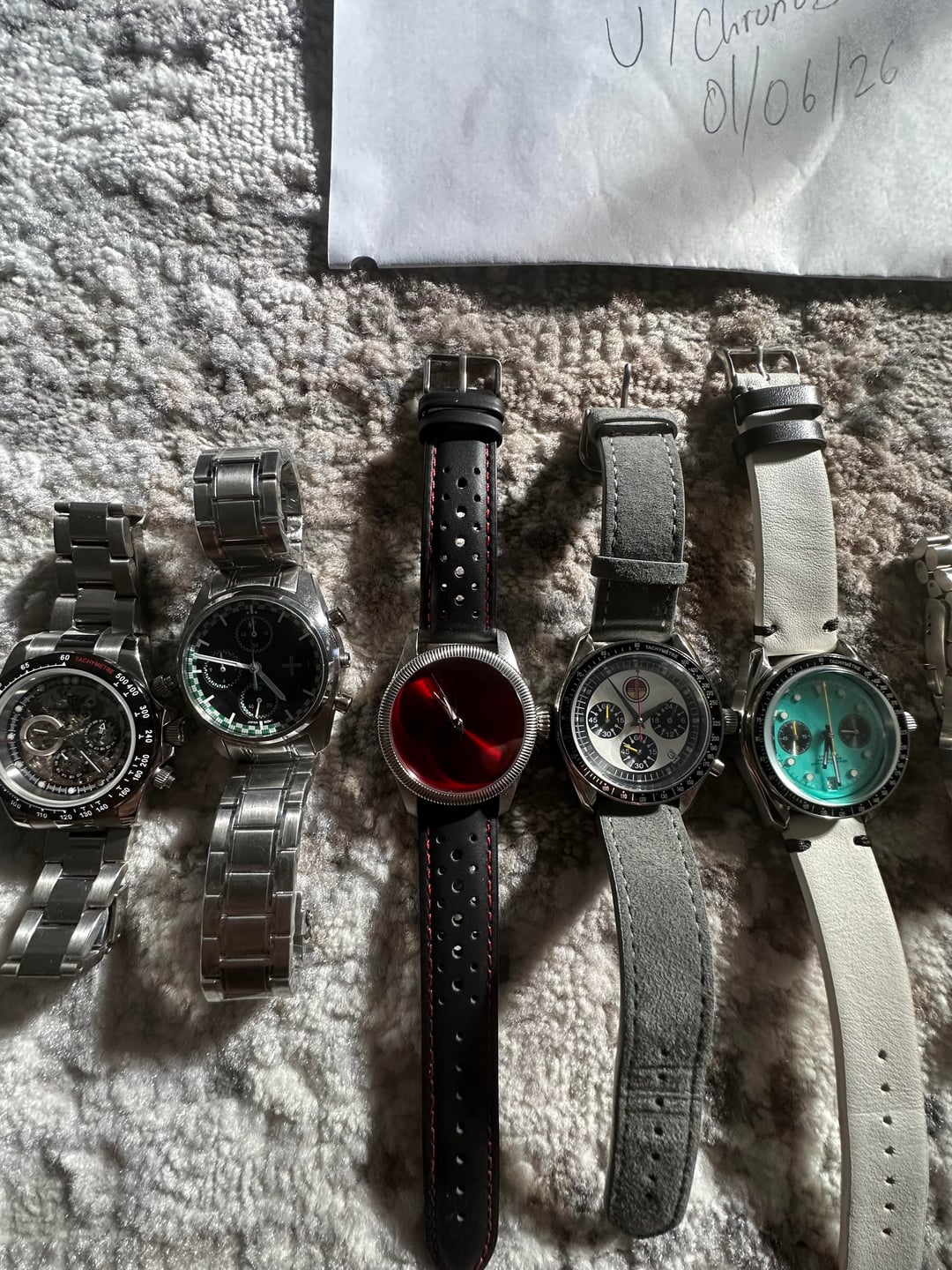 1. Pagani Design day/date Daytona- $30 + Shipping. No extra links. A few minor scuffs. 39mm *SOLD* 2. Brand new modded black and green dial mecaquartz Chronograph- all links included- $60 + shipping. 38mm 3.Oxblood sterile dial NH35 watch - 39mm- $90 + shipping 4. Sunset/white dial modded speedy chronograph- gray suede strap- mecaquartz- $60- 40mm 5. Tiffany blue speedy chronograph - 40mm - $50 6. Seiko dial speedy watch- 39mm -$80 7. Sterile dial chronograph with orange suede strap- $70