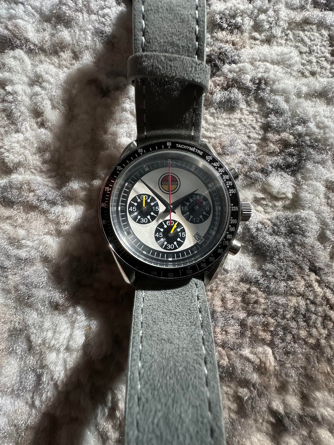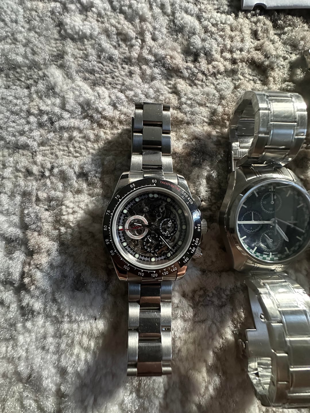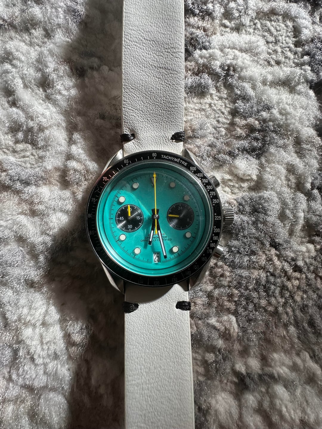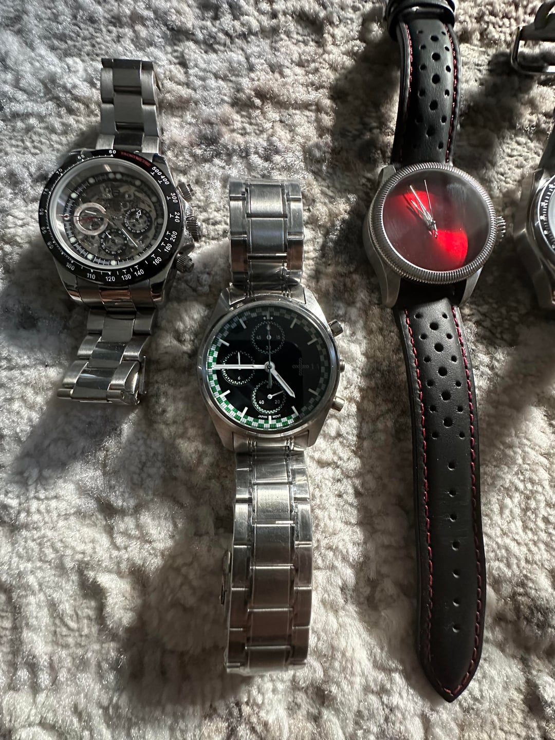 1. Pagani Design day/date Daytona- $30 + Shipping. No extra links. A few minor scuffs. 39mm *SOLD* 2. Brand new modded black and green dial mecaquartz Chronograph- all links included- $60 + shipping. 38mm 3.Oxblood sterile dial NH35 watch - 39mm- $90 + shipping 4. Sunset/white dial modded speedy chronograph- gray suede strap- mecaquartz- $60- 40mm 5. Tiffany blue speedy chronograph - 40mm - $50 6. Seiko dial speedy watch- 39mm -$80 7. Sterile dial chronograph with orange suede strap- $70