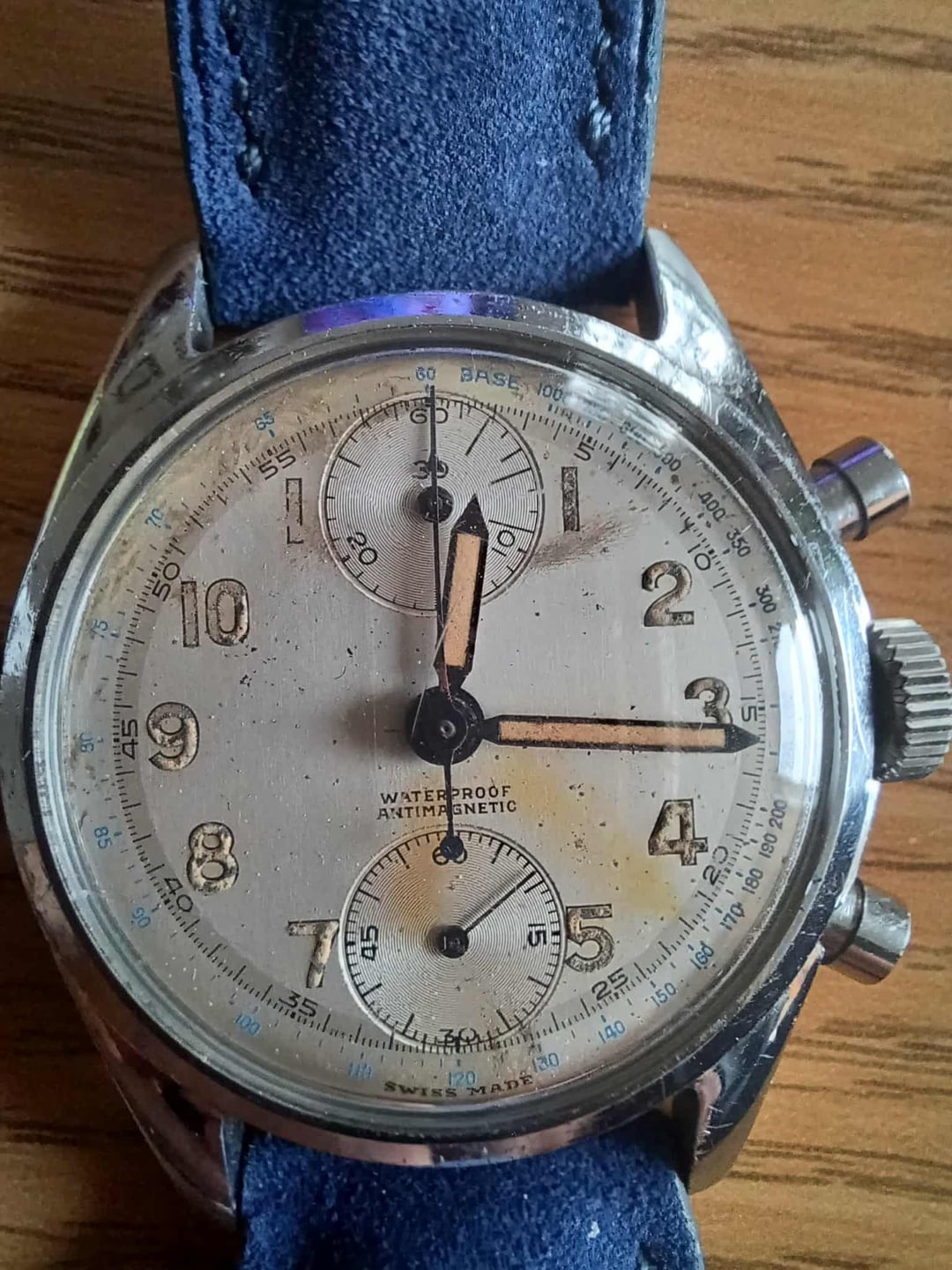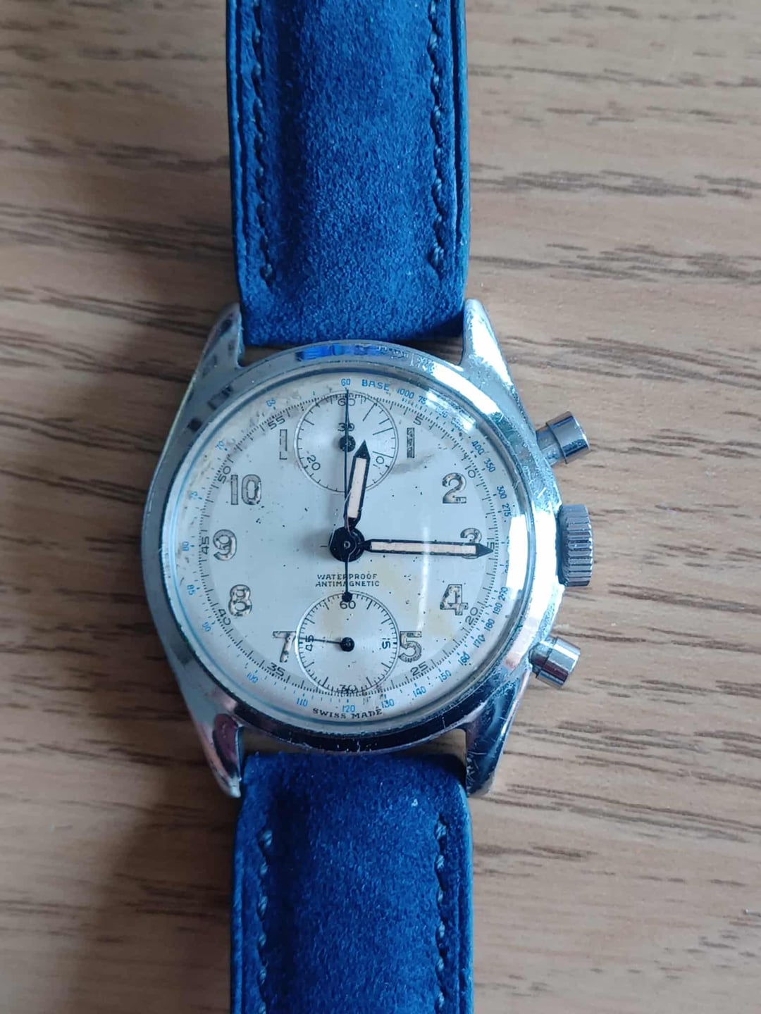 £850 + shipping Paypal payment Swiss watchmaking Lotron Watch Beautiful collector's watch from Lotron in steel - original dial (not reconditioned or refinished) - original movement. Good condition. Year of manufacture of the watch around 1940 steel back and chrome-plated housing Original dial with luminous Arabic numerals and external seconds track. Marked waterproof antimagnetic under the hand shaft. Two auxiliary dials. Small second at six. 30 minute counter at twelve - time hands blued with luminous material - chronograph hands also blued. Additional work cover Hand-wound caliber Venus 170 - original condition - signed Lotron Watch - Seventeen 17 Jewels swiss. \- beautiful masterly quality. Working, Worn & in very good condition In the screwed back cover outside in capital letters swiss made staybrite steel back 3002 wateroroof antimagnetic The watch is in its original condition; it has not been refinished and therefore has visible signs of wear on the dial. Watch diameter 35mm - with crown 37mm - weight 54.8g Blue leather strap Interesting sought-after collector's watch in good used original condition. Any questions please ask
