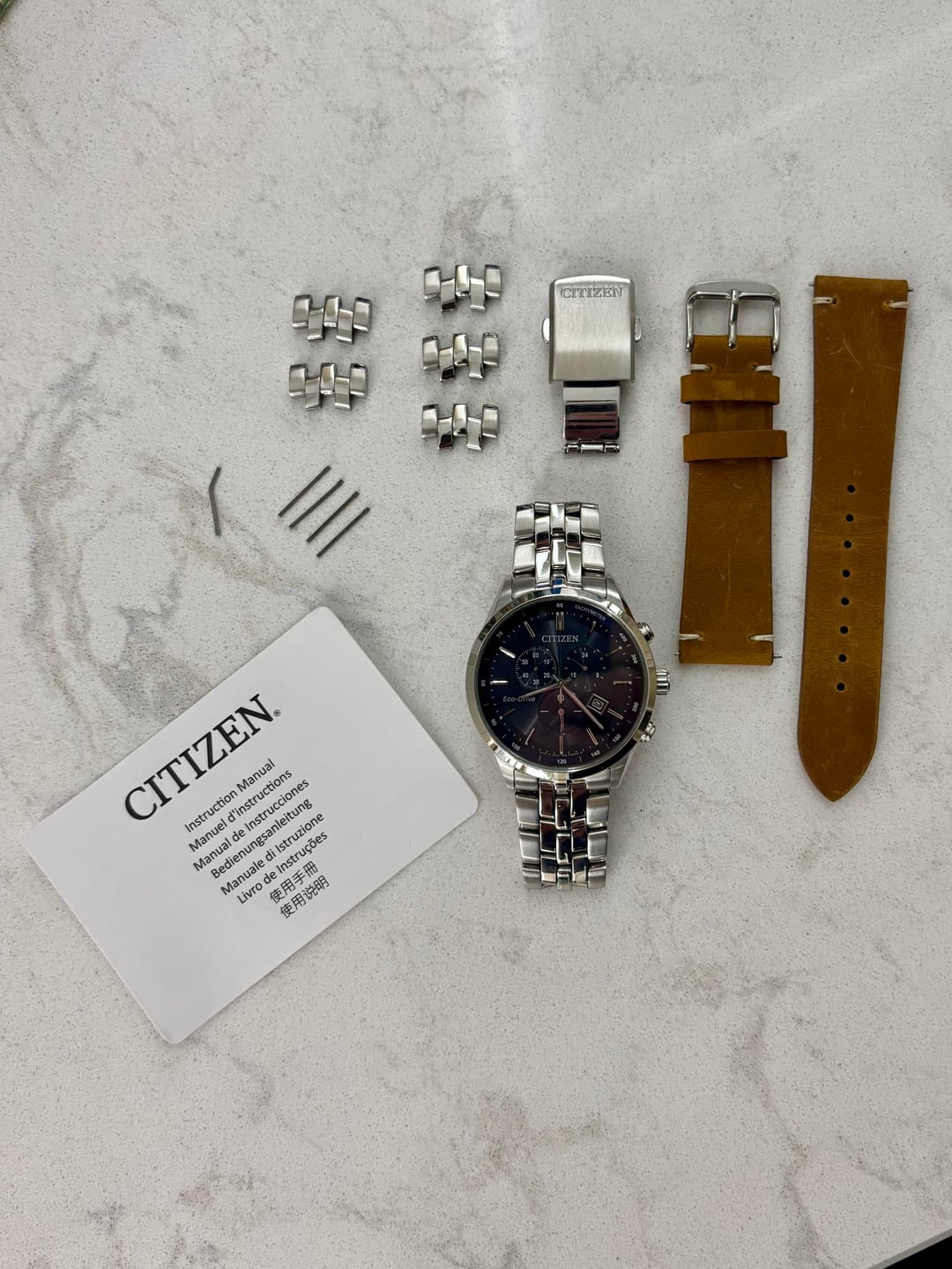 Up for sale is my Citizen AT2140‑55L Eco-Drive Chronograph. The watch is in excellent condition and has been lightly worn. Timestamp / Imgur Album: https://imgur.com/a/L6lLoCn Payment via PayPal G&S, $220 shipped via USPS Priority Mail Details: 42mm stainless steel case, scratch-free Sapphire crystal, upgraded milled clasp with 6 positions of microadjust. Dial color is a beautiful deep blue. Sale includes original clasp, links, and pins. One pin was damaged during sizing, and will be included in sale. Also included is an aftermarket brown leather strap (difficult to find 21mm lug width). Watch is in excellent condition and functions perfectly. Watch was purchased new in last 12 months and was very lightly worn. Box and manual included. No warranty card. Happy to answer questions or provide additional photos—thanks for looking!