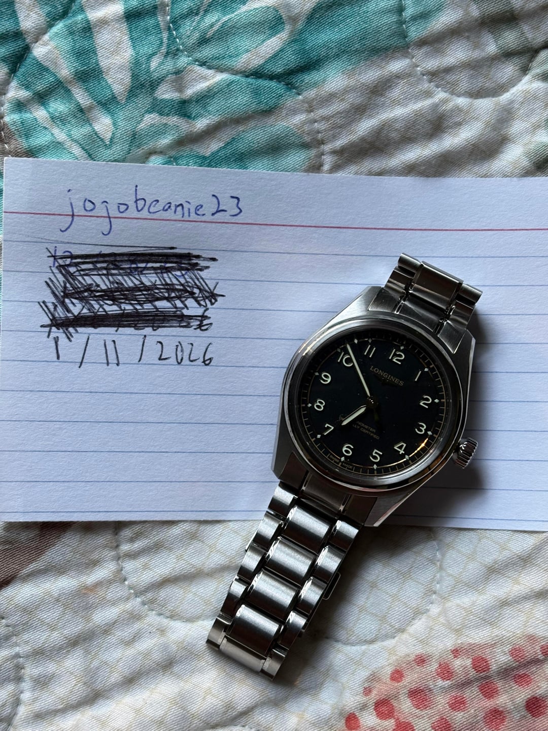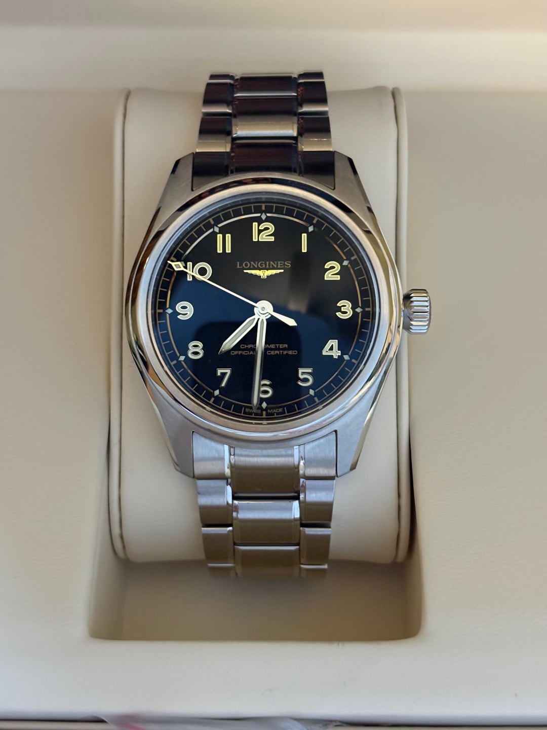 Longines Spirit Pilot For sale the updated Longines Spirit Pilot. Without the 5 stars on the dial. Picked it up as a Christmas gift for myself, wore it through the holidays and decided its not for me. 39 mm diameter, 11.5 mm thickness, microadjust bracelet, Chronometer certified, full links, box and papers Slight desk diver marks on the clasp, clean crystal and bezel Price: $2500 + shipping, no trades please Zelle, Venmo, PayPal F &F Shipping: FedEx 2 day, CONUS Please comment here before PMing Thanks for looking!