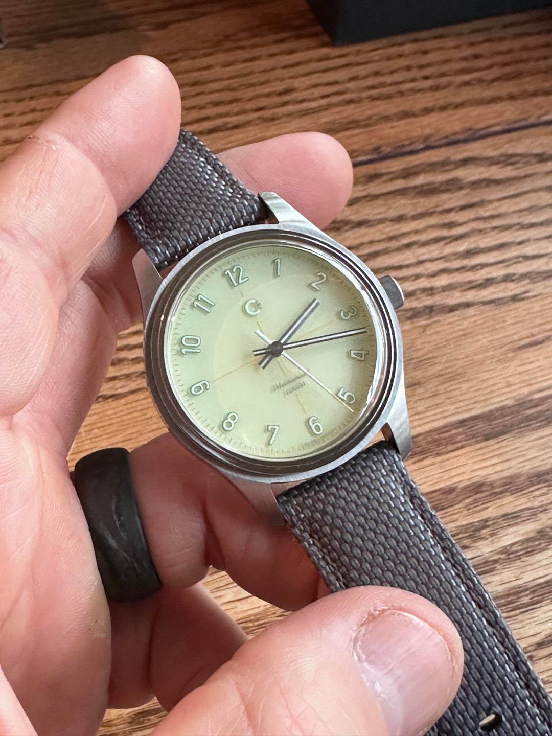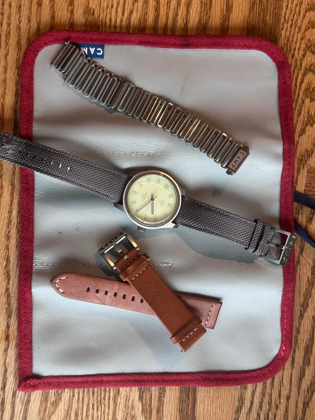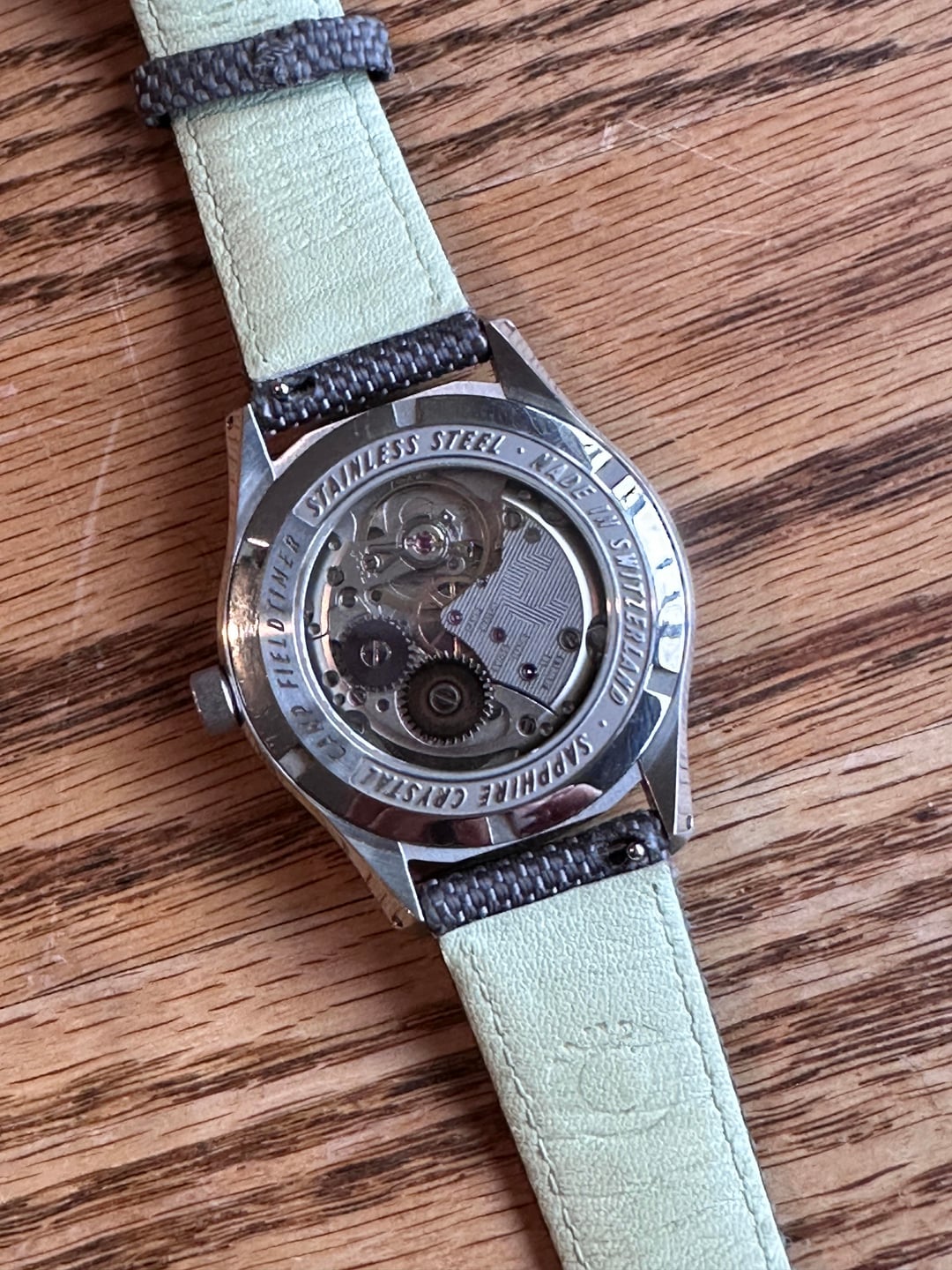 Selling my gently worn Camp Fieldtimer in Florida Green. This watch is designed so thoughtfully: art deco/midcentury lines with a Motorsport DNA. The lacquer dial offers a ton of visual depth. The color is wonderfully versatile: mint at time, creamy white at others, and often a subtle mossy green. The hand wound movement is a joy to wind. I don’t want to sell this piece but I’m making a move for a GS. Complete kit. Comes with a travel roll and three strap options: canvas, leather, and bonkclip. The Sellita movement is creatively decorative and running as it should. Asking $700 + $20 for shipping in CONUS. Open to trades specifically for Oris and Autodromo.