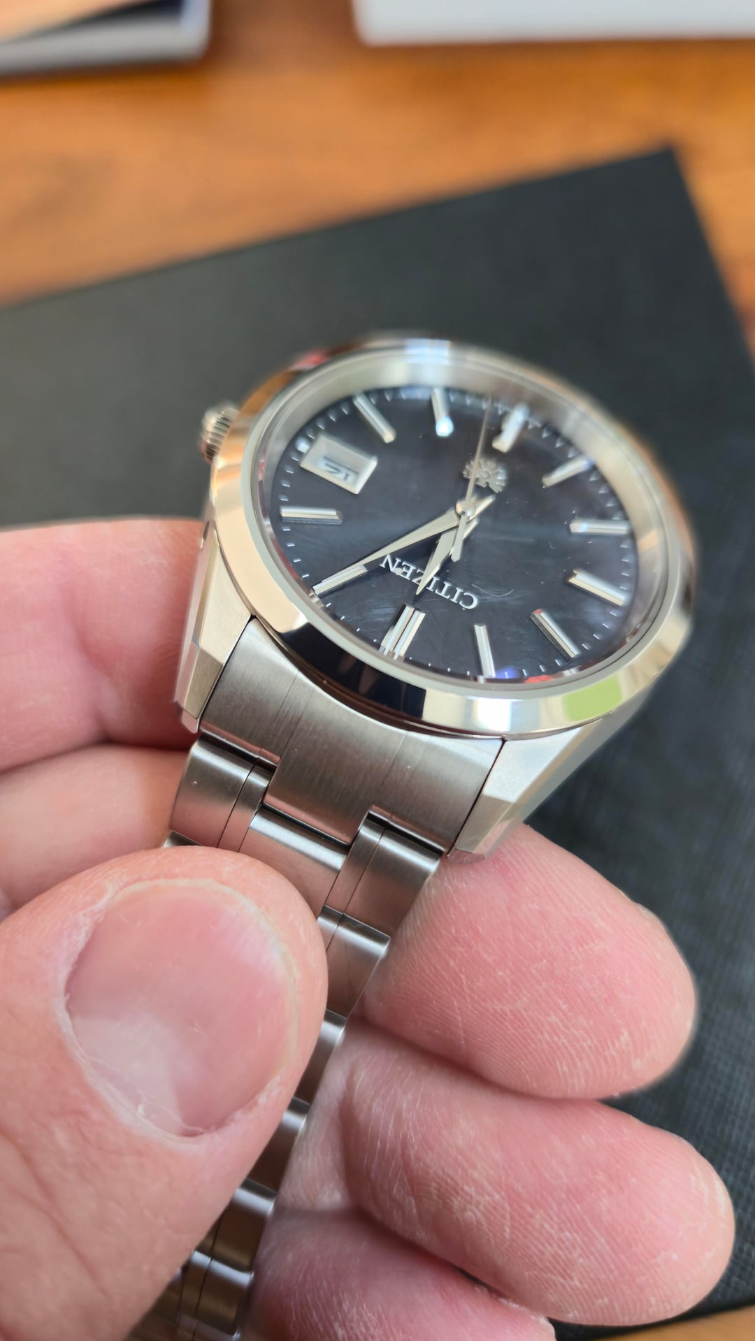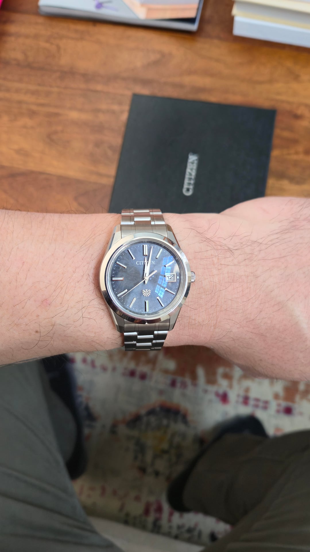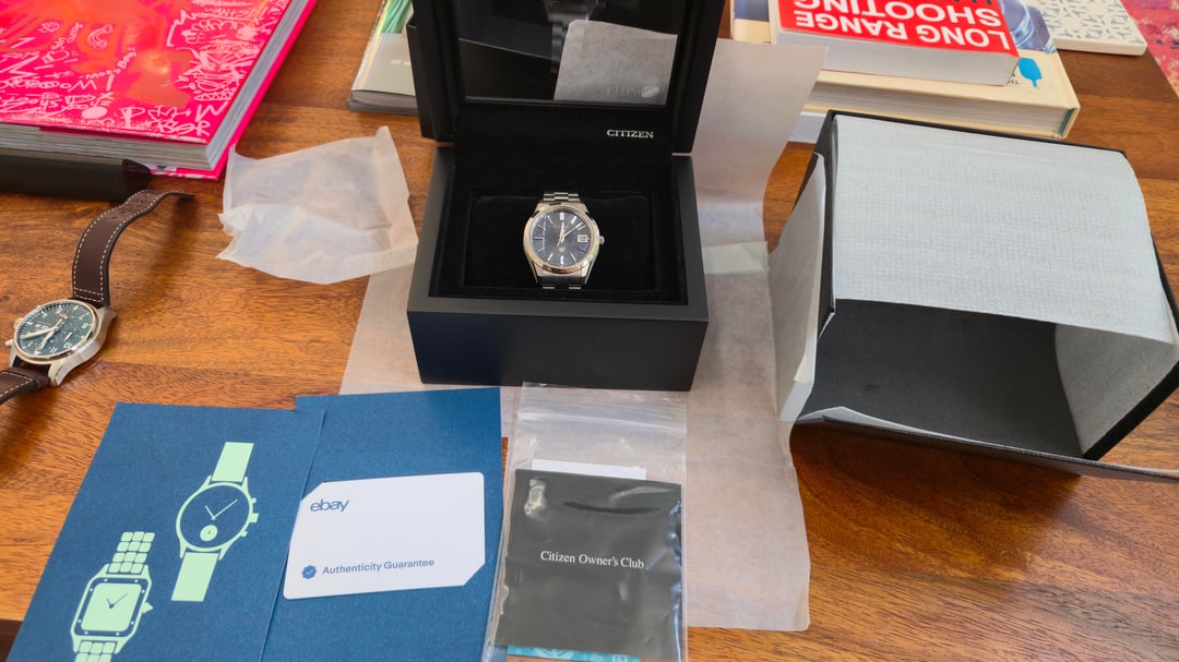 Hello all, newcomer here, I wanted to start off my WatchExchange participation with a listing for sale. Sorry for the repost, forgot to include username/timestamp picture and picture of the box. I have a Citizen "The Citizen" AQ4100-57E watch for sale. I bought it new off ebay from a highly rated Japanese seller, with ebay authentication. It's a quartz movement with stellar finishing, rivaling that of Grand Seiko. I'm selling because I took a risk buying without trying, and when it arrived it just wears too small on my 7.5" wrists. I tried getting over it, but truth be told I've only worn this watch 3 times and the condition shows. Citizen website details: [https://www.citizenwatch.com/us/en/product/AQ4100-57E.html](https://www.citizenwatch.com/us/en/product/AQ4100-57E.html) \- Case: 38.3mm Two Tone Super Titanium \- Bracelet: Titanium \- Movement: A060 Eco-Drive" Original Ebay seller: [https://www.ebay.com/str/himeannesshop](https://www.ebay.com/str/himeannesshop) I would rate the condition 9.5/10. There are very hard to see marks on the clasp where the "Citizen" logo is, I tried my best to take pictures. We all know good pictures magnify flaws but hopefully my pictures show how good the condition is. The plastic is still on the rear case. Asking $2400 shipped, with me paying for Paypal G&S. Comes with original box, papers, and ebay authentication guarantee certificates. Happy to show more pictures or do a video call showing the watch, or whatever verification method that helps ease of mind.