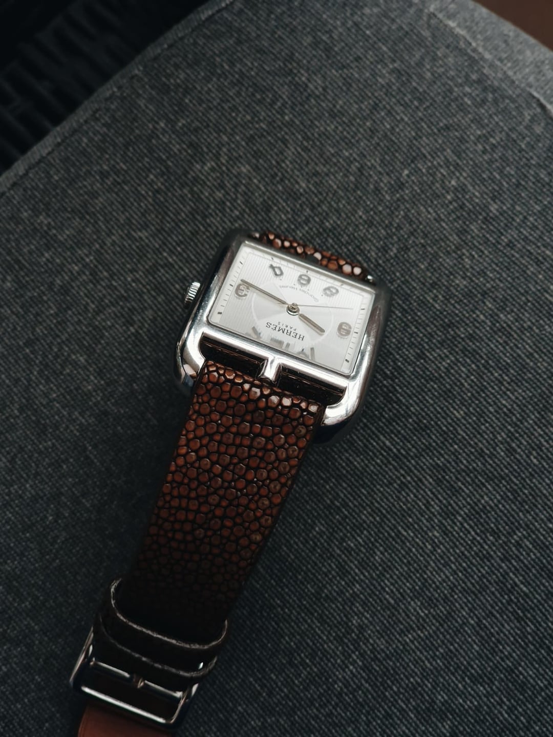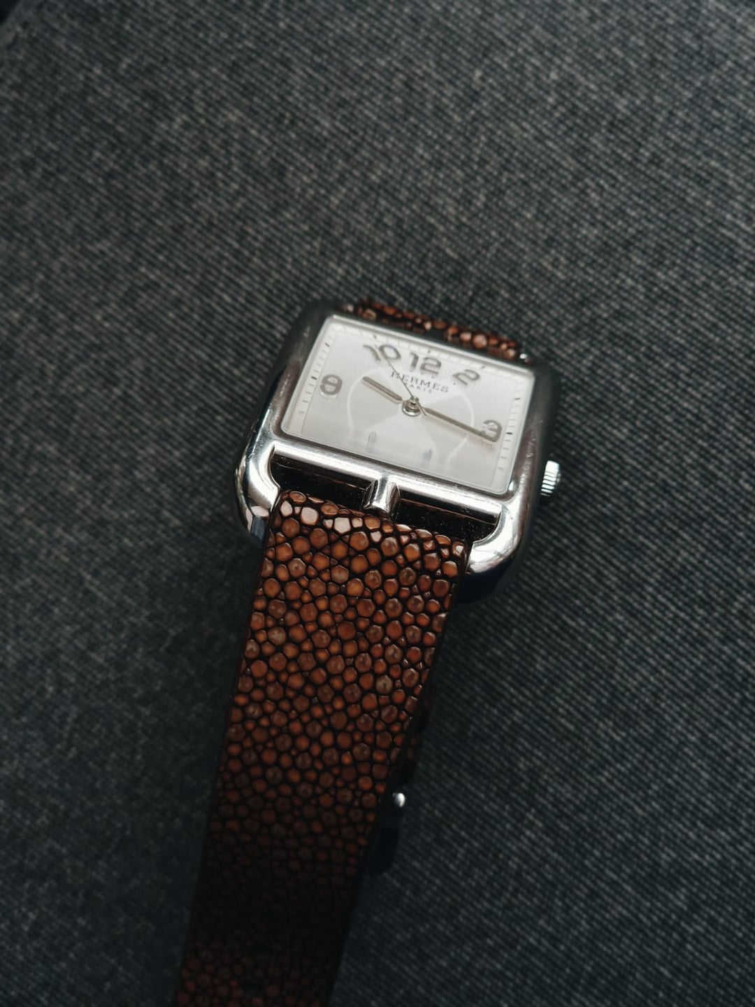The Cape Cod is Hermès’ most iconic modern design, first sketched in 1991 with its “square inside a rectangle” case shape and signature anchor-chain lugs. The Grandes Heures takes that familiar form and adds an almost whimsical complication: time that doesn’t flow evenly. Instead of advancing at a steady rate, the hour hand speeds up through some sections of the dial and lingers longer in others, stretching and compressing time in a way that’s completely unique. The result is less about precision and more about the *experience* of time. The system developed by Vaucher is based on the caliber H1928 and uses oval wheels to rush or slow the hour hand, while minutes and seconds run at a steady pace. From what I’ve read, it seems buyers could customize which hours they’d like to run faster or slower. This reference comes in a stainless steel case with a silver dial, Arabic numerals, and large Cape Cod proportions that still wear comfortably across wrist sizes. Playful, design-driven, and distinctly Hermès, a watch for collectors who appreciate horology with a sense of artistry. **Condition:** Very good. Some markings on the case and caseback. The movement and its functions work flawlessly, although I don’t know its service history. The stingray strap and buckle are aftermarket. Please see the pictures for full condition and clarity. **Case Size:** 36.5mm x 49.3mm stainless steel case with a thickness of 12mm and a lug width of 23mm. **Crystal:** Sapphire **Movement:** Automatic movement made by Vaucher, based on the caliber H1928. It has a unique complication that changes the speed of the hour hand. Service history is unknown, but all functions work perfectly. **Other Information:** * Aftermarket stingray strap and buckle. **Price:** Asking $2,450. Please add $120 for worldwide shipping. Payment methods include Wise, ACH transfer, Revolut, Bitcoin (On-Chain or Lightning), or PayPal G&S for buyers with solid references. Add +7.5% for currency conversion fees on the latter. Portugal has suspended all local post shipments to the US, but I can still ship with UPS ($120). US buyers may have to pay a 15% tariff on arrival. Established seller with over 220 transactions – buy with confidence! Make sure to follow me on Instagram (@daily.worn) to check out the newest additions. Happy to answer serious inquiries. No trades, no lowballs. [Pictures](https://imgur.com/a/kaboeDJ) [Timestamp](https://imgur.com/a/PFVVQ6m)