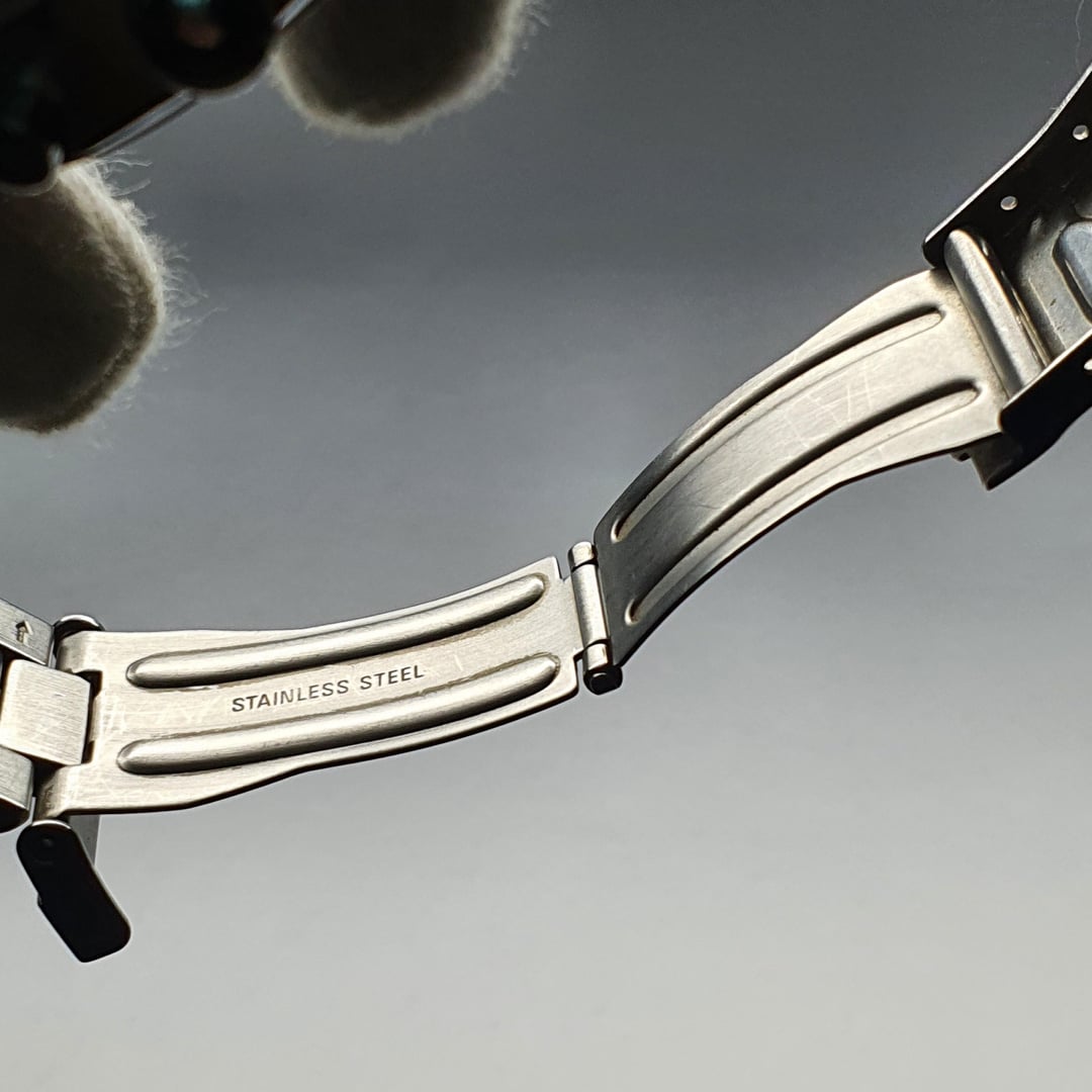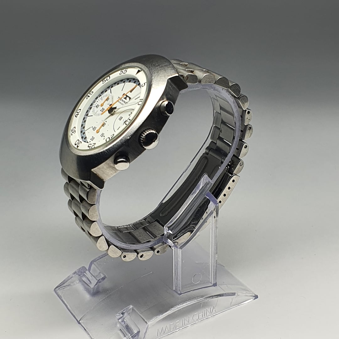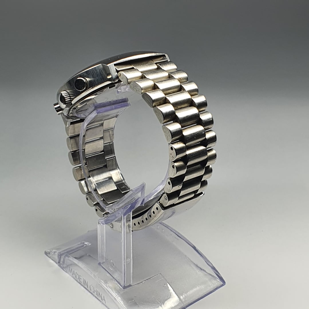 Hey WatchEx! For sale is this vintage Technos '70s-Style Chronograph. Technos was founded in Switzerland by Joseph Gunzinger and was trademarked in 1924 by his son when he took over the company. During the quartz crisis, like many Swiss brands, Technos found themselves in financial trouble and in 1970 the company was sold to General Watch Co. who transferred Technos to a new premises where they also integrated Certina in 1980. Japan was one of Technos' largest markets so in 1982 it was sold to its long-time Japanese importer, Heiwado & Co. This watch, reference number TGM690, was produced during Heiwado & Co ownership and made exclusively for the Japanese domestic market. Judging by the case back design, it points to a '90s release before the company and all its rights were sold again in 2002 to Technos Relógios S.A. who represented Technos watches since 1956 in Brazil, where Technos now thrives. The design looks like it was inspired by their own genuine Swiss-made 1970s chronograph ref.10767 and other '70s space-age chronographs. The dial has a retro, checkered minute track, evocative of racing. The monochrome hands are very much in the Seiko style from the mid '70s like the 6138-0020 or the 6139-7080. The orange chronograph hands pop nicely as the accent. The internal bezel is raised from the dial while the subdials have concentric circle texturing. The subdial on the right is a 24h dial. Due to the 40mm diameter, the stainless steel case has a lot of presence without being overbearing. I have a relatively small wrist at 6 inches as reference. The case features radial brushing and high-polish pushers and crown. The single domed crystal gives some nice vintage distortions at extreme angles. It houses the SII (Seiko) calibre VD54B movement that feels good when setting the time. All the time keeping and chronograph functions are working with no issues. The original stainless steel presidential-style bracelet has solid links and a secure double locking clasp that can accommodate up to roughly a 17.5cm wrist. The condition is great with minor general wear. Brand new battery installed. Looking for $220 net (buyer pays Paypal or Wise fee) + shipping Dimensions are: 40.2mm x 49mm x 11mm Lug Width 22mm (according to my callipers) Bought in Japan. \*Returns accepted but all return postage costs are the buyer's responsibility in all circumstances and any re-import fees that I have to pay when receiving the watch will be deducted from the refund amount.