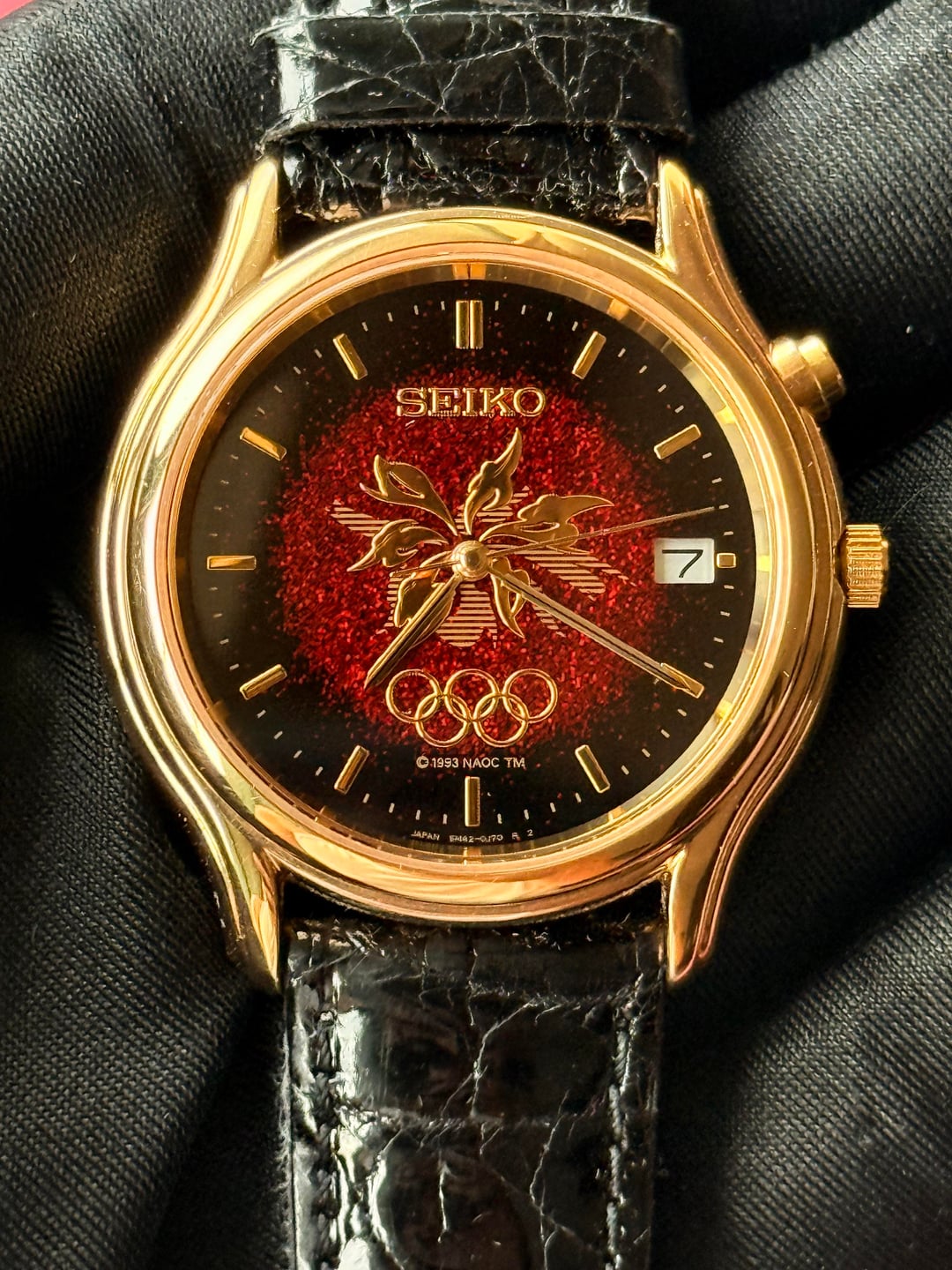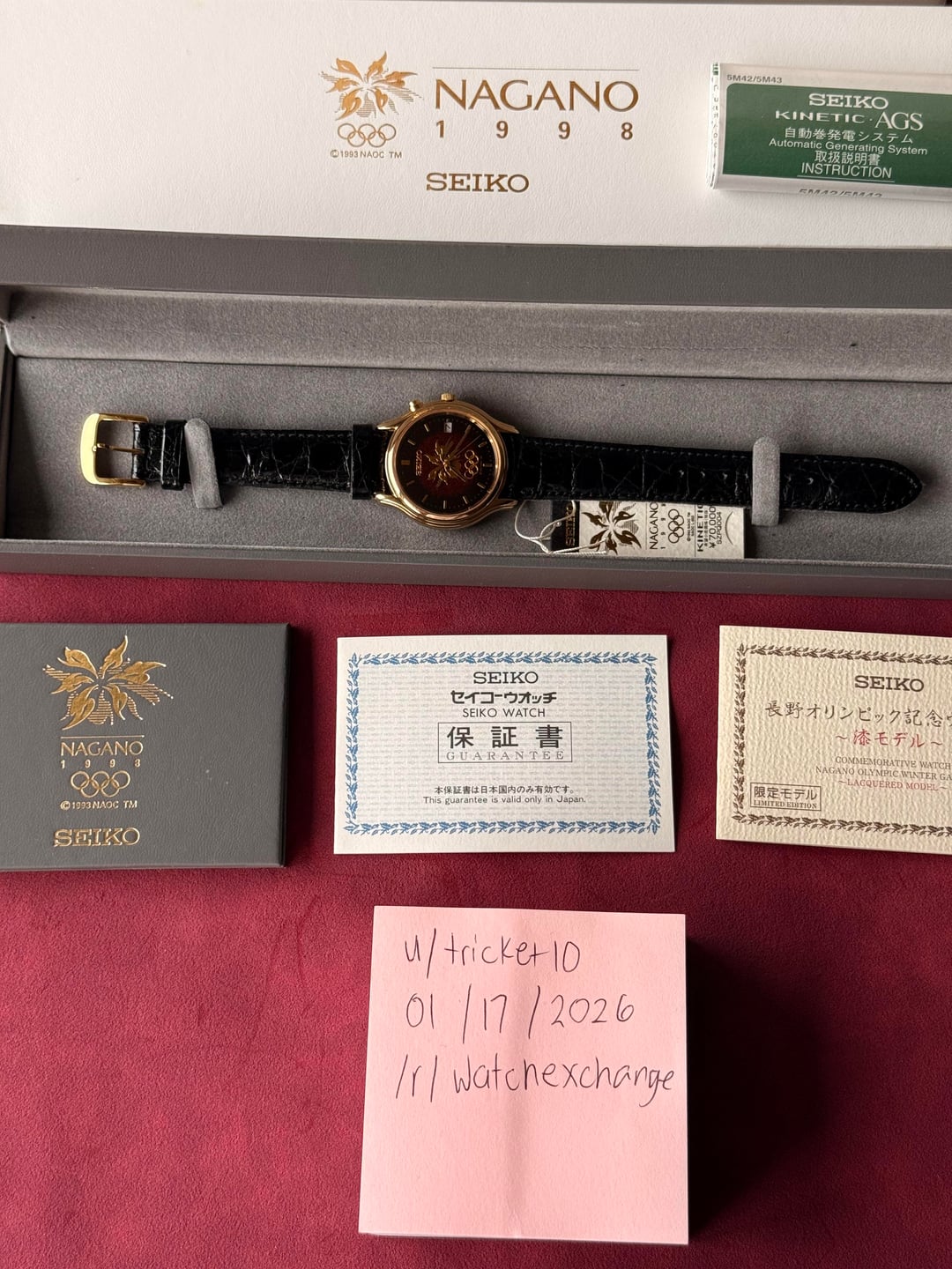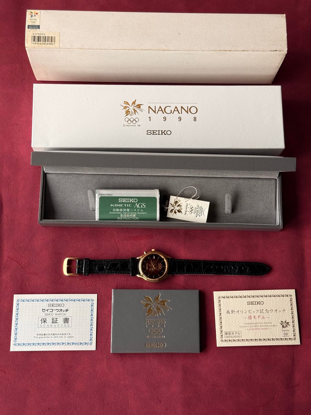 **Seiko SZPQ004 1998 Nagano Winter Olympics** PRE OWNED **PRICE: 499 USD (Net to me)** This is a special commemorative watch released by Seiko to honor the 1998 Nagano Winter Olympic Games, where Seiko served as the official timekeeper for the Olympics. It is limited edition and especially hard to see in this condition with complete packaging. This watch features a beautiful black-red lacquer dial and a gold plated case. **CONDITION: 9.5/10** • Watch is in very good condition aside from the strap which shows wear due to age. **PACKAGE:** • Seiko special double box • Manual and warranty card • Tags • Watch itself with original leather strap **SPECS:** • 5M42 kinetic movement • 34 mm case size **SHIPPING:** Watch will be coming from the Philippines I can ship the watch via FedEx/DHL at your expense. **PAYMENT:** Preferred: Wise (USD wire transfer) Other options:| Local PH bank transfer | Paypal (Buyer shoulders fees) *This item is being sold in its current condition, without any personal warranty provided by me. Returns or refunds will only be considered if there is an undisclosed issue on my part. Please feel free to inquire if you require additional photos, videos, or if you have any further questions before deciding to purchase the watch. Just chat/message me here for inquiries. Thank you!*