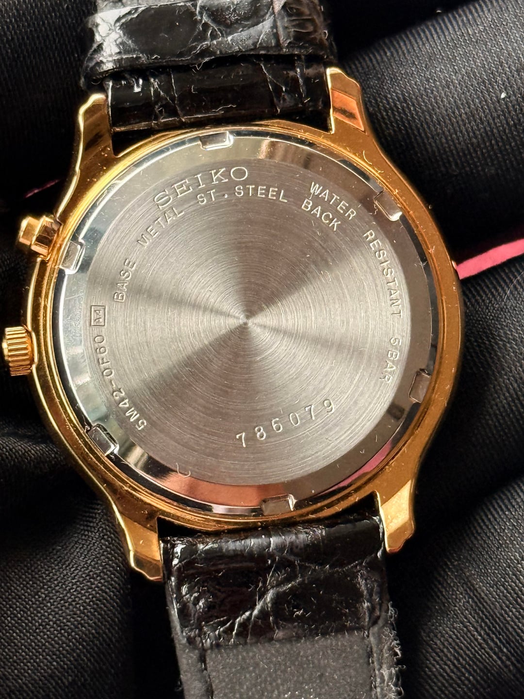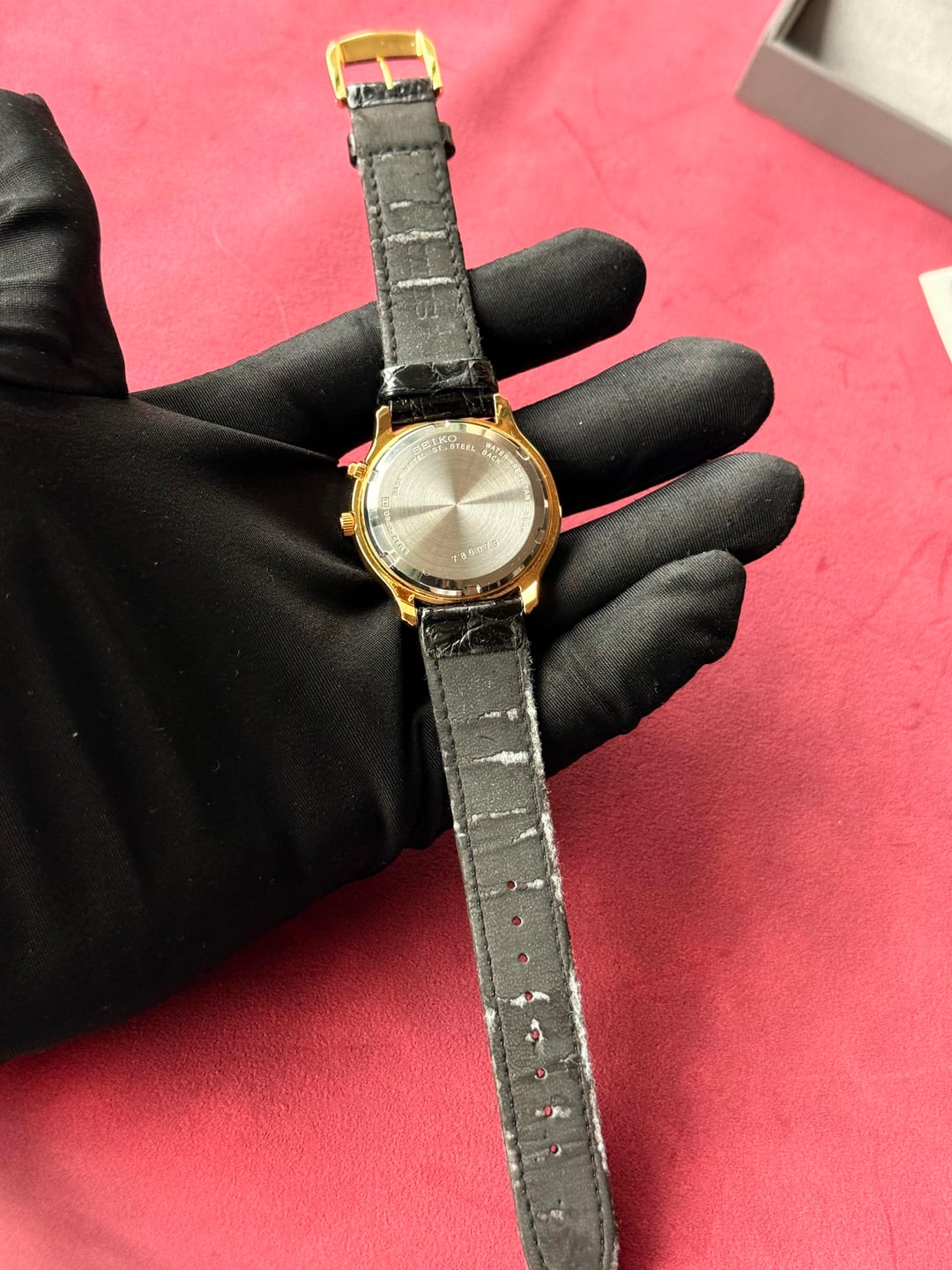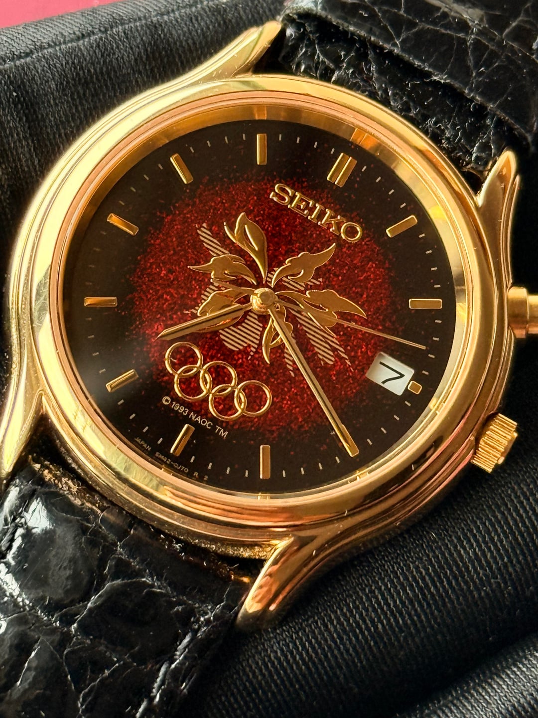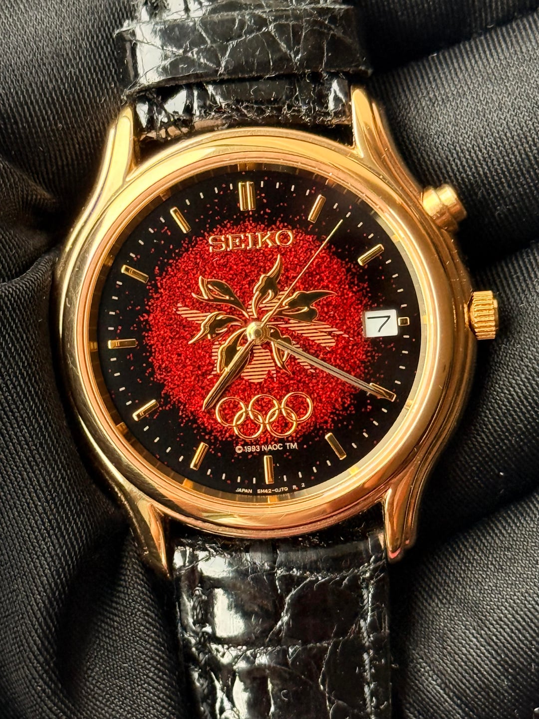 **Seiko SZPQ004 1998 Nagano Winter Olympics** PRE OWNED **PRICE: 499 USD (Net to me)** This is a special commemorative watch released by Seiko to honor the 1998 Nagano Winter Olympic Games, where Seiko served as the official timekeeper for the Olympics. It is limited edition and especially hard to see in this condition with complete packaging. This watch features a beautiful black-red lacquer dial and a gold plated case. **CONDITION: 9.5/10** • Watch is in very good condition aside from the strap which shows wear due to age. **PACKAGE:** • Seiko special double box • Manual and warranty card • Tags • Watch itself with original leather strap **SPECS:** • 5M42 kinetic movement • 34 mm case size **SHIPPING:** Watch will be coming from the Philippines I can ship the watch via FedEx/DHL at your expense. **PAYMENT:** Preferred: Wise (USD wire transfer) Other options:| Local PH bank transfer | Paypal (Buyer shoulders fees) *This item is being sold in its current condition, without any personal warranty provided by me. Returns or refunds will only be considered if there is an undisclosed issue on my part. Please feel free to inquire if you require additional photos, videos, or if you have any further questions before deciding to purchase the watch. Just chat/message me here for inquiries. Thank you!*