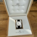 Die Uhr hat ein braunes IWC Kroko-Lederarmband und eine Platin-Dornschließe. Sie kommt mit Box, Booklet und blanko Servicekarte.