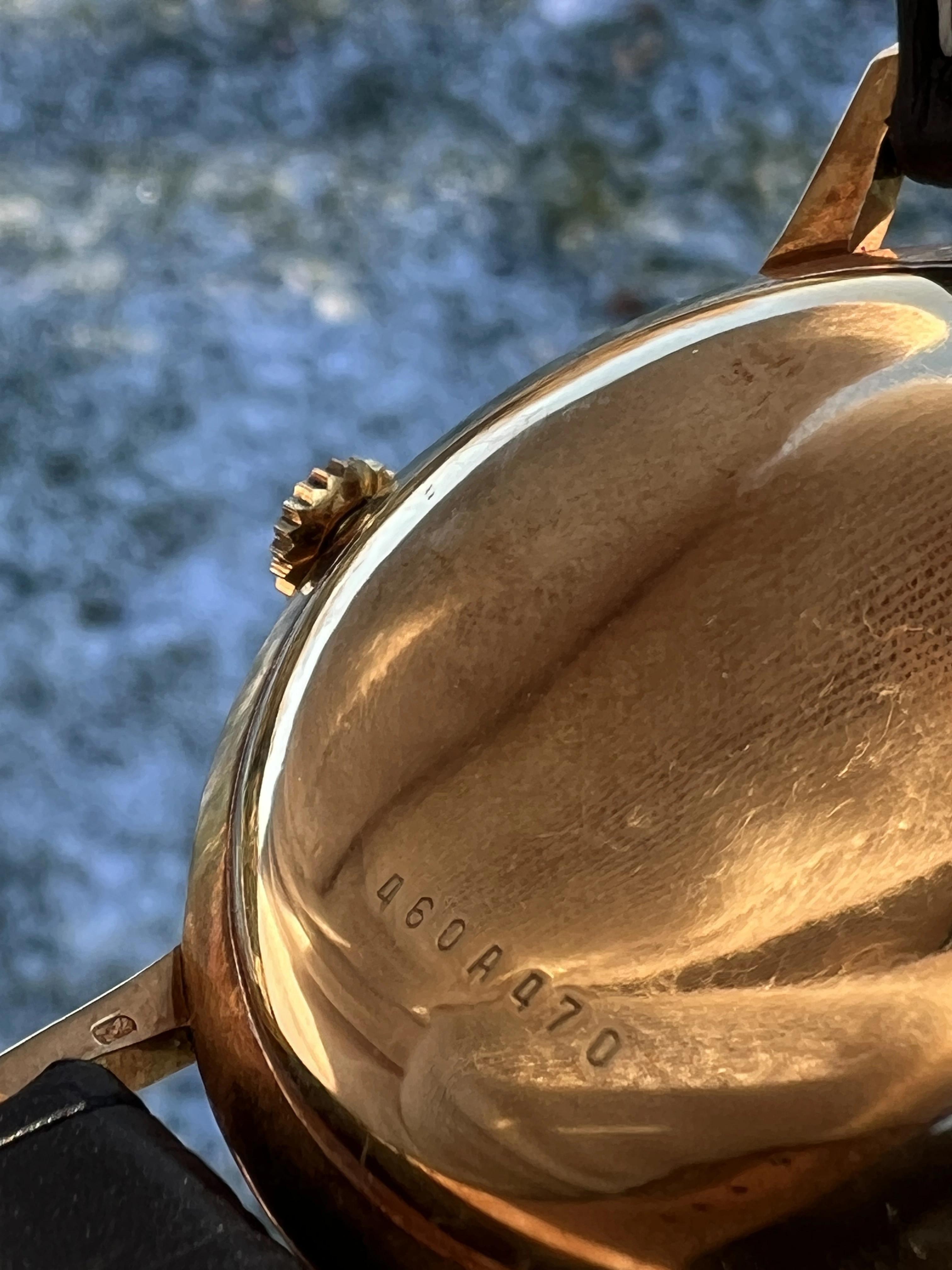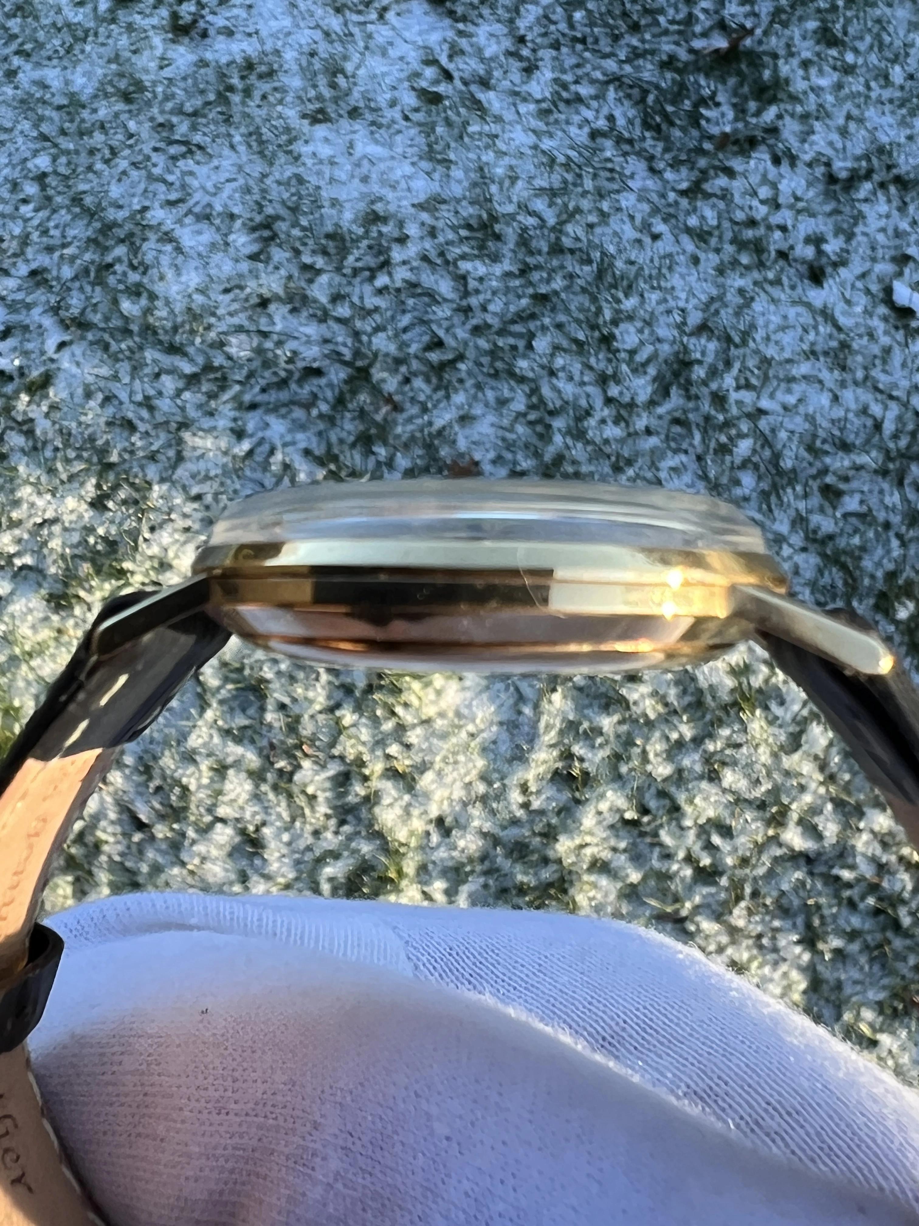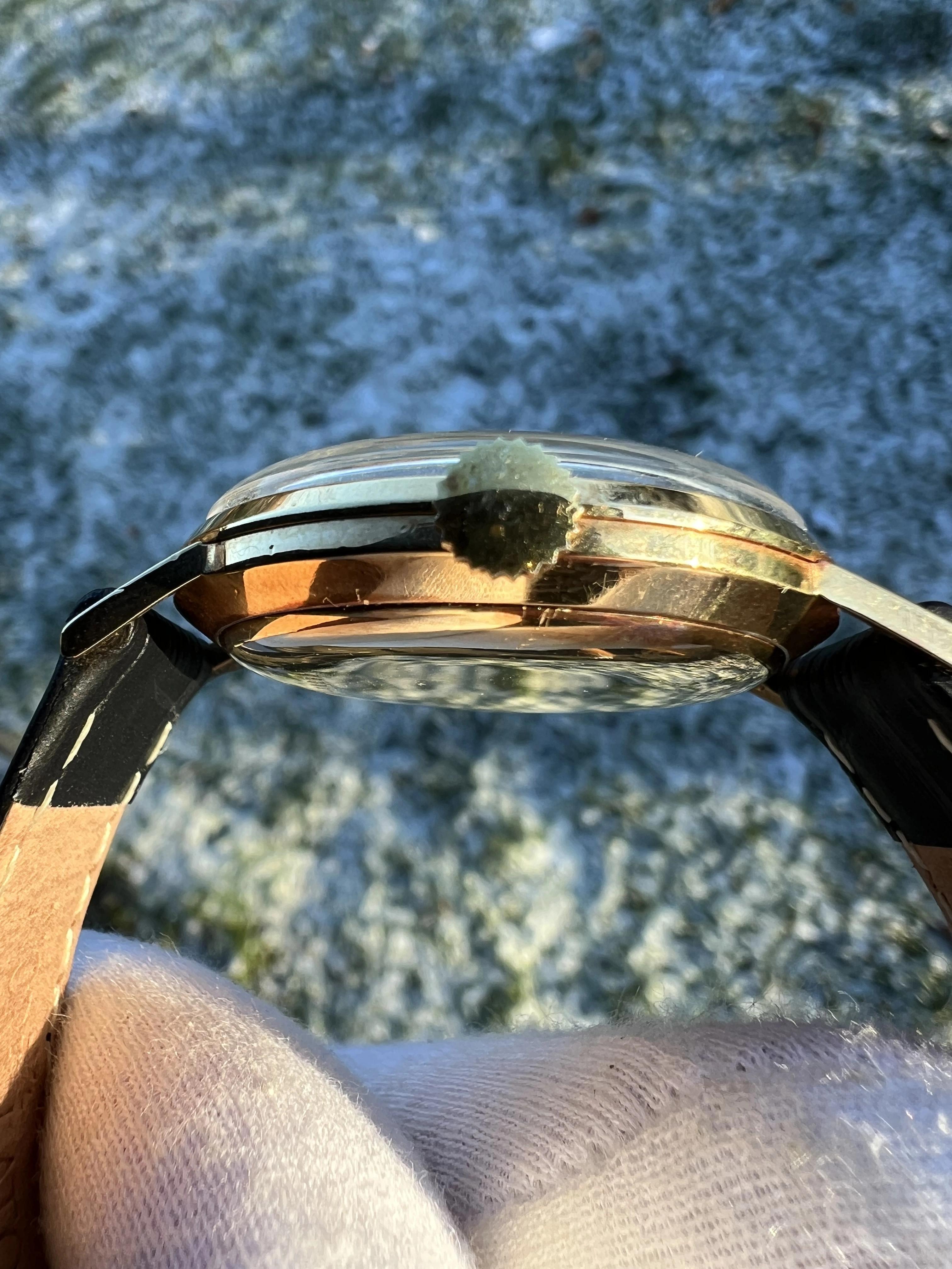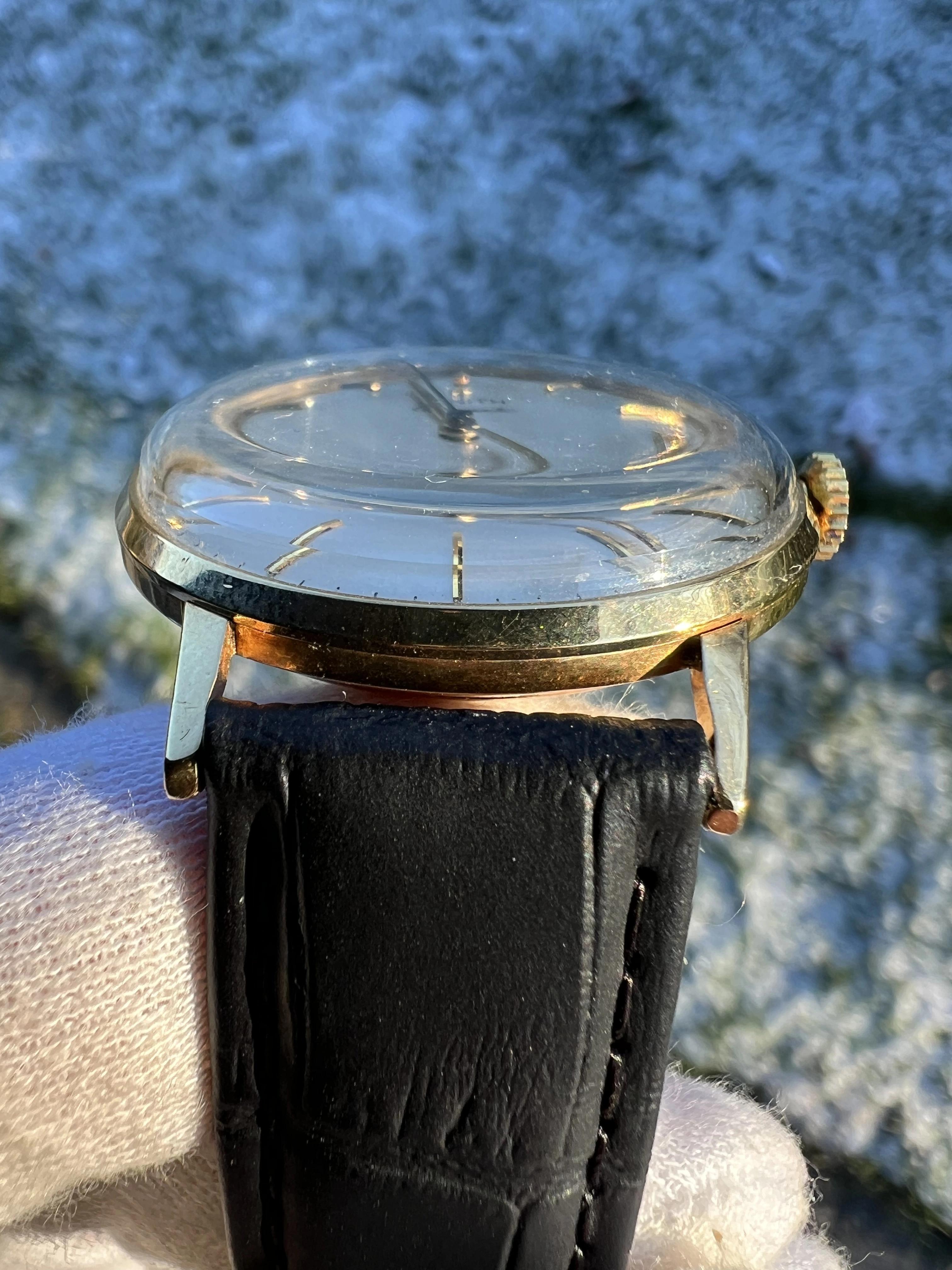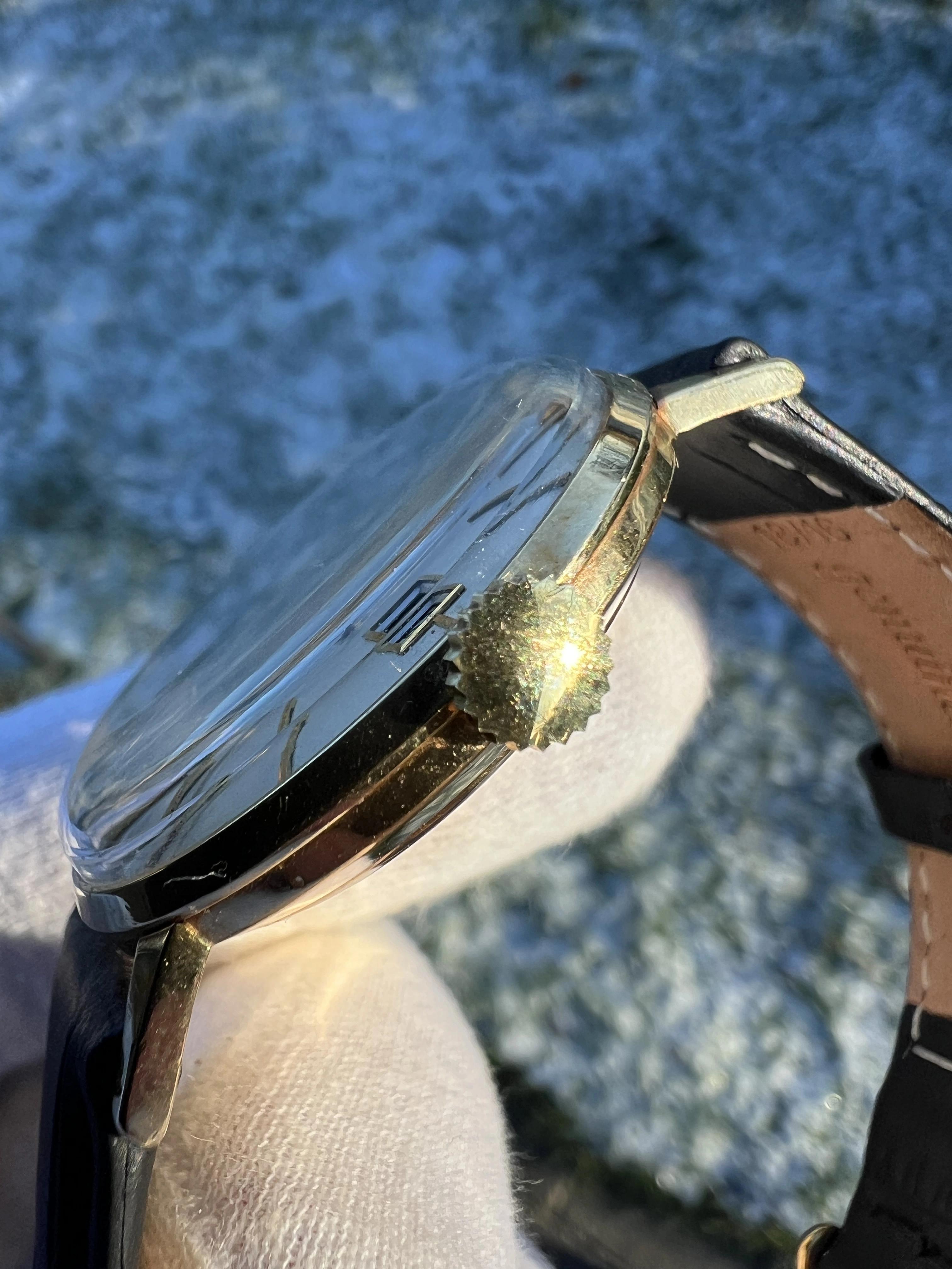 The watch features a clean sunburst, silver dial with date window at 3 o’clock. The dial and hands are original and untouched and especially the blued steel second hand is a nice detail. Not sure if the crown is original, or a later replacement.