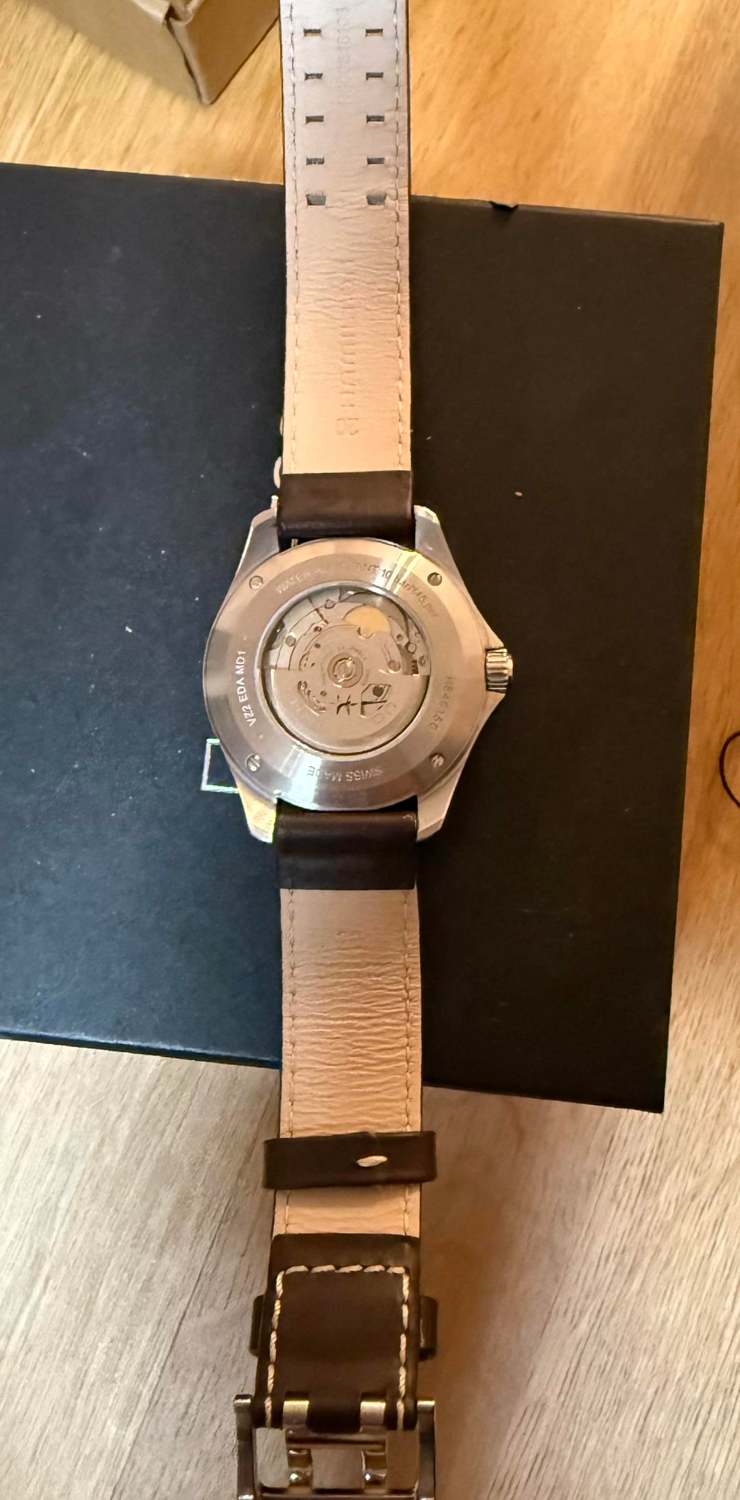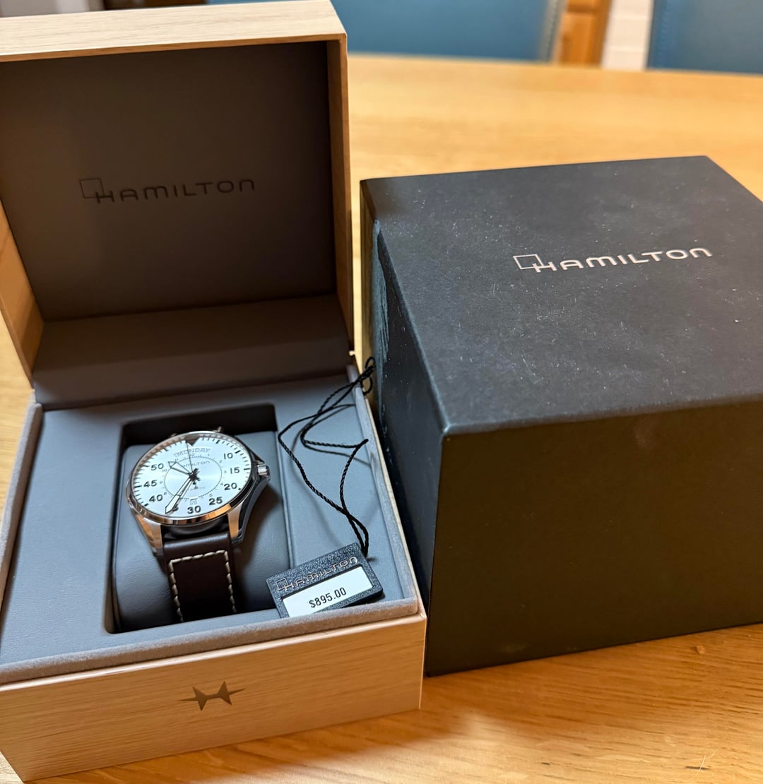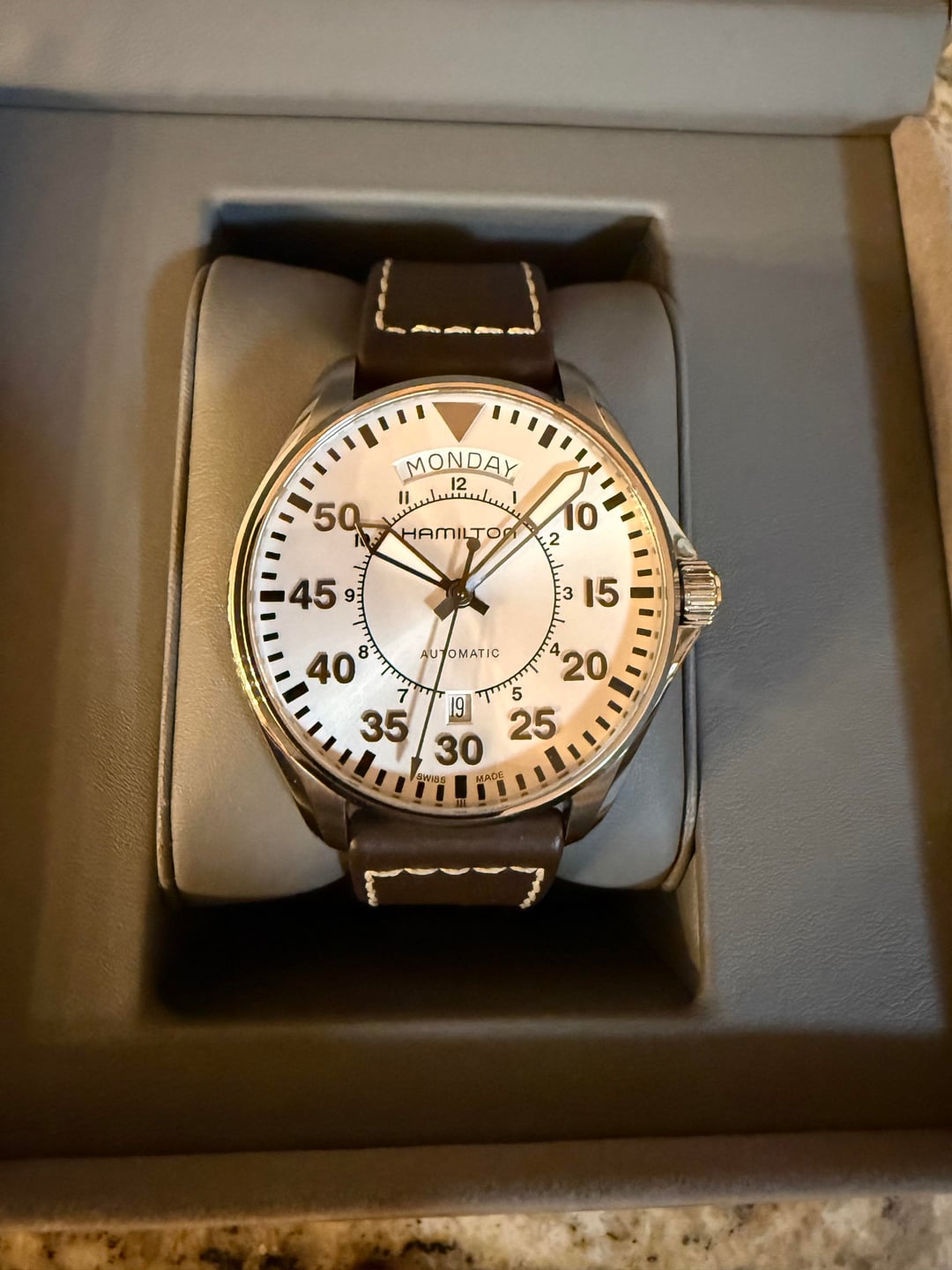 Up for sale is an awesome watch from Hamilton, the Khaki Aviation Pilot Day Date Automatic, reference H64615555. This watch is in excellent pre-owned condition, I’ve worn it only a handful of times. The strap is also in great condition. Watch will come with original box, tag and manual. - Reference: H64615555 - Size: 42mm - Lug width: 20mn - Dial color: Sunburst silver - Movement: Automatic - Strap: Original strap - Watch with box, tag and manual Price: $675 shipped in the continental U.S. I can take Zelle and PayPal F&F/Venmo. This is my first listing on this forum so hopefully I included all the necessary information! I am happy to answer any questions you may have.