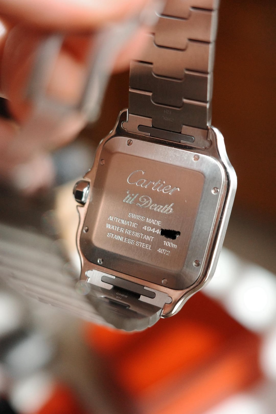 Selling my nearly unworn Cartier Santos Large ref. WSSA0064. This watch was my wedding watch, hence the subtle caseback engraving ’til death in the Cartier font (just tell your friends you’re a hardcore Cartier fan). It was only worn one time, so it is in excellent condition. My wife has given me the green light to buy something else that I can wear more on the daily. It was purchased new from Jomashop, so comes with their Warranty through 8/2027, as well as the Cartier Warranty through 6/2032 (see photos). Sale includes: \- Watch \- Alligator strap and clasp (unworn) \- Extra links \- Jomashop warranty card \- Cartier tool \- Box (latch is broken, doesn’t stay closed) I am happy to FaceTime to verify. I accept Zelle, but will also consider listing it on eBay at a higher price to offset their fees. Price - $7,500 shipped insured