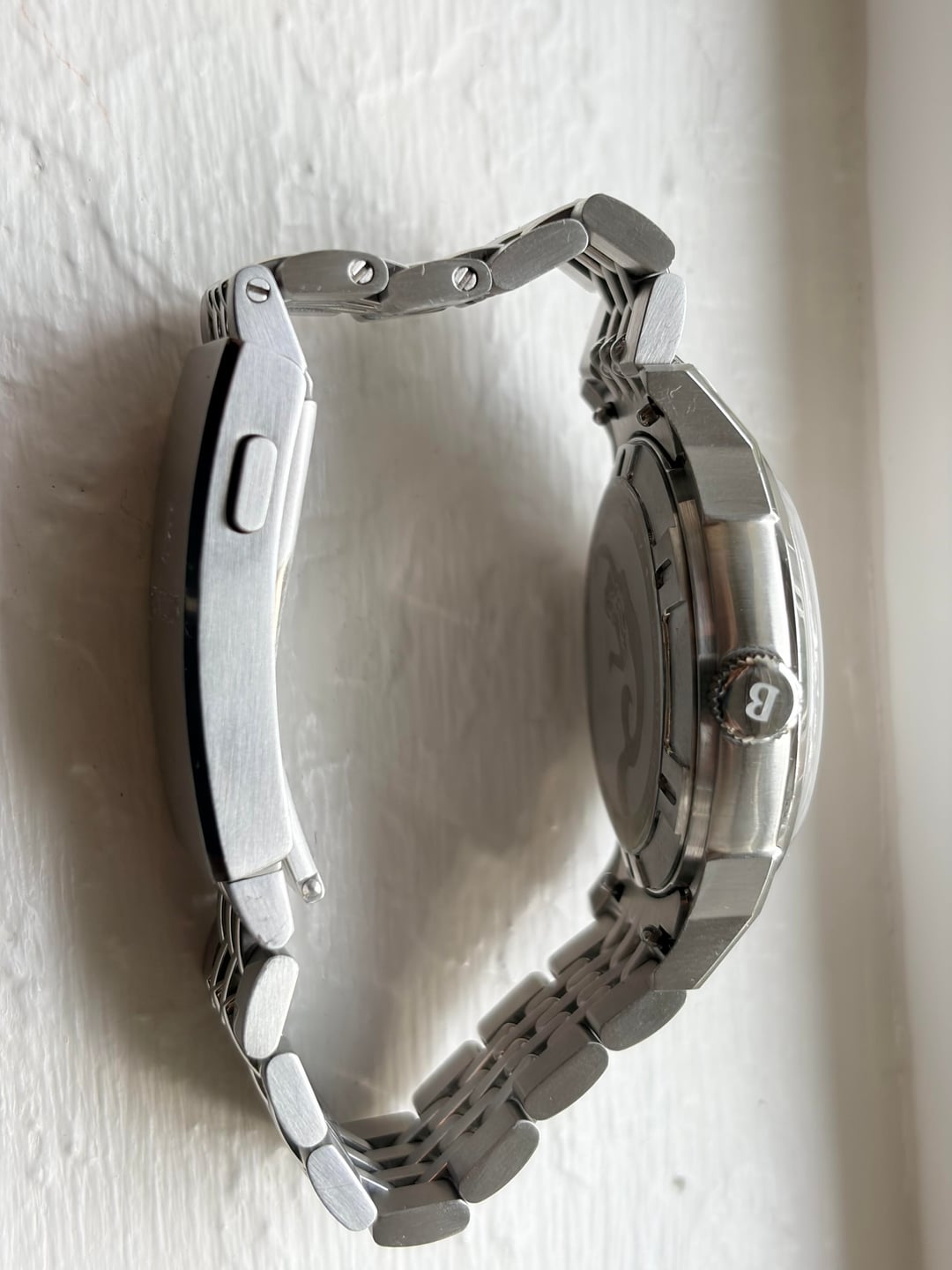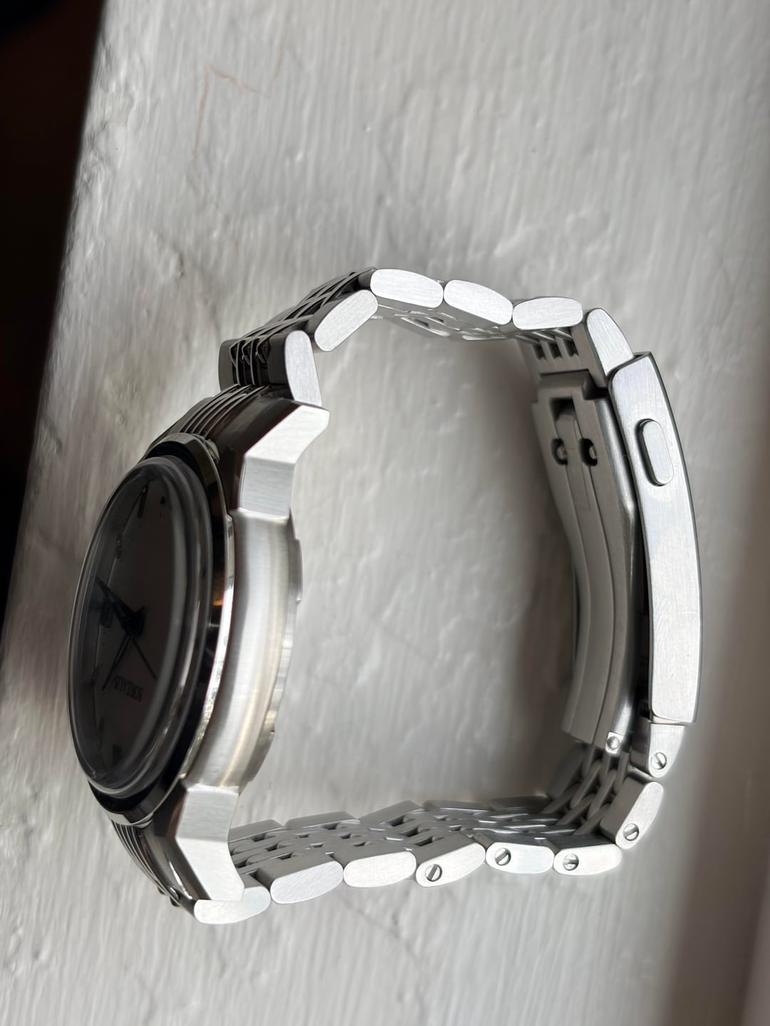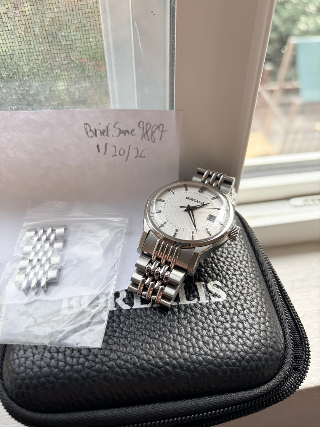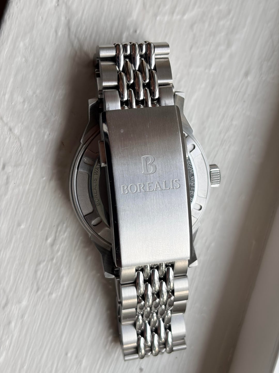Selling my Borealis Lusitano with the white textured pie-pan dial. This is a lovely vintage-inspired piece that offers 3 real benefits for the price, I think: an excellent automatic Miyota movement for the price, a genuinely useful on-the-fly micro-adjust clasp, and a well-proportioned, mid-century style dial that wears beautifully. Asking $225 OBRO. **Condition:** Near mint. Crystal and dial are flawless to my naked eye, but please inspect pictures carefully. Runs well and keeps solid time per my observation **Why this one stands out:** * Miyota 8315 automatic with hacking and a 60-hour power reserve — uncommon value at this price point * Beads-of-rice bracelet with milled clasp and on-the-fly adjustment * Vintage-inspired pie-pan dial in a very wearable modern size **Specs:** * Case: 38.6mm brushed & polished 316L stainless steel * Thickness: 12.1mm * Lug to lug: 46.3mm * Lug width: 20mm * Movement: Miyota 8315, automatic, hacking, 21,600 vph, \~60hr power reserve * Crystal: Domed sapphire with underside AR * Dial: White textured dial, applied markers, dauphine hands, framed date @ 3 * Lume: Swiss Super-LumiNova BGW9 (hands) * Bracelet: Beads of rice, solid links, screw pins, on-the-fly micro-adjust clasp * Water resistance: 50m / 5 ATM * Caseback: Solid screw-down with mermaid artwork * Crown: Signed, push/pull **Included:** Full set — original box, all bracelet links, and warranty card. Selling to consolidate the collection. Happy to provide additional photos or answer questions. Priced to sell.