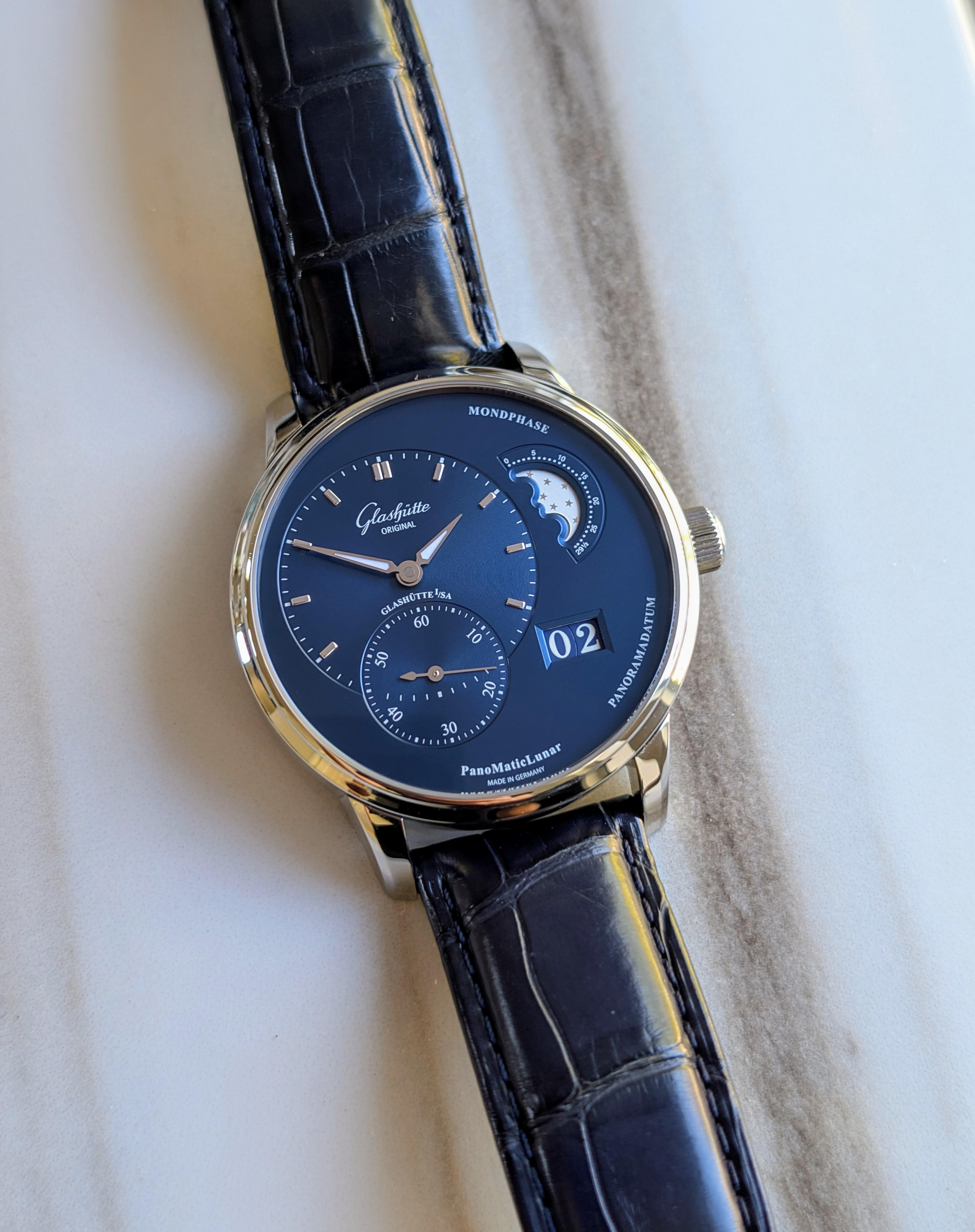 **Glashütte Original PanoMaticLunar - Radiant Blue Dial** Distinct and striking, PanoMaticLunar offers moonphase display and Grande date in a beautiful configuration on a striking blue dial. 40mm stainless steel case with navy alligator strap on a deployment buckle. Features time, panorama date and moonphase. Glashütte Original manufactured movement Calibre 90-02: Glashütte three-quarter plate with stripe finish, balance bridge hand-engraved, duplex swan-neck fine adjustment, skeletonised rotor and 21-carat gold oscillation weight, bevelled edges, blued screws. Comes with boxes, booklets and stamped papers dated 2023. Excellent condition. Reference 1-90-02-46-32-35 More pics: [https://imgur.com/a/3rIqX55](https://imgur.com/a/3rIqX55) $7,300 plus shipping 🛫 All watches shipped FedEx fully insured. Local pickup available in Los Angeles area. 💬Positive feedback from hundreds of successful transactions across the watch community, including WUS, Chrono24, eBay, Facebook, and Reddit. I’m always happy to connect by phone or video call to answer questions or verify details. Zelle, Venmo and wire accepted. ⭐150+ five-star reviews on Chrono24 — buy with confidence. ⌚I have a wide range of exceptional watches available, with new pieces added every week.