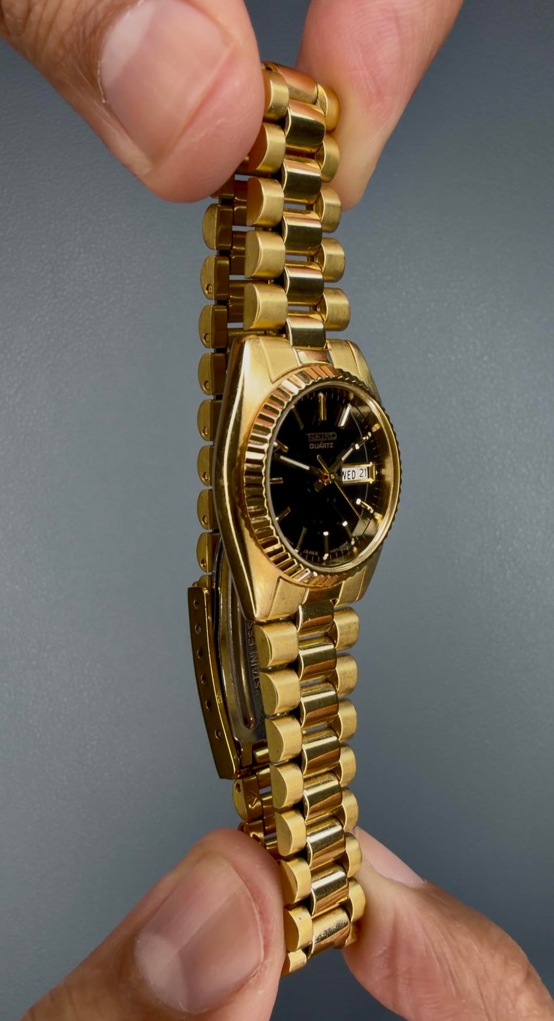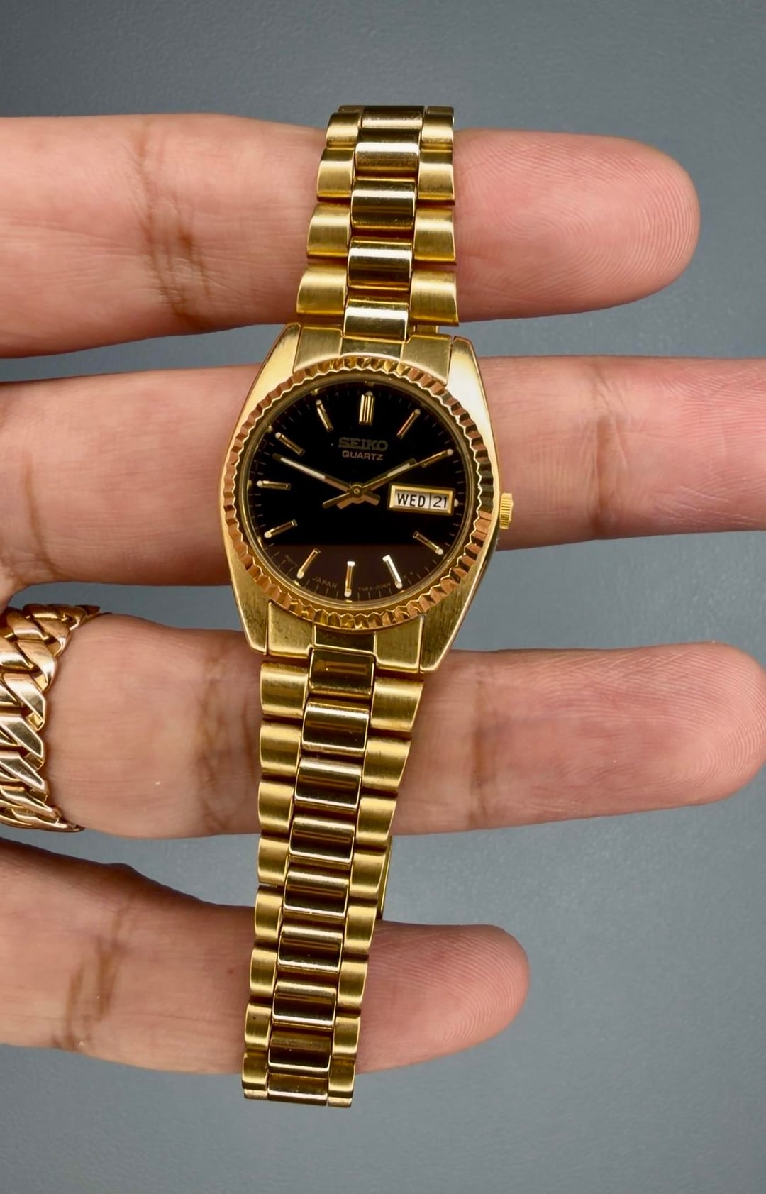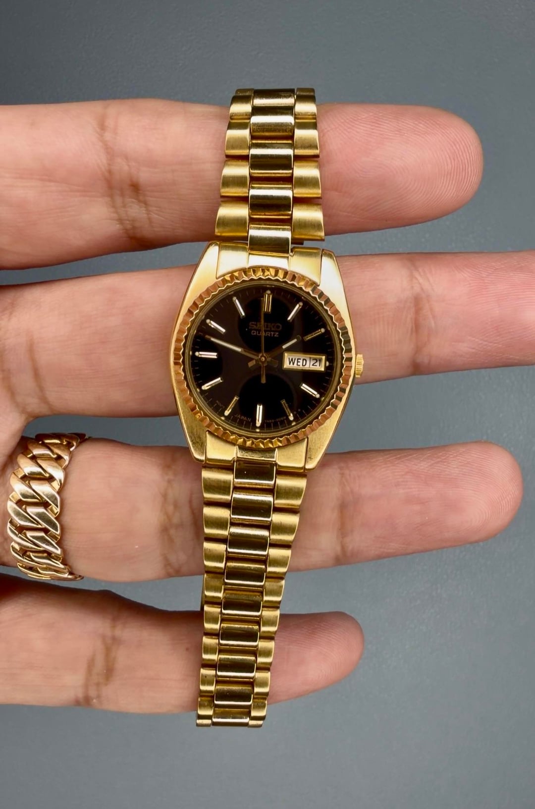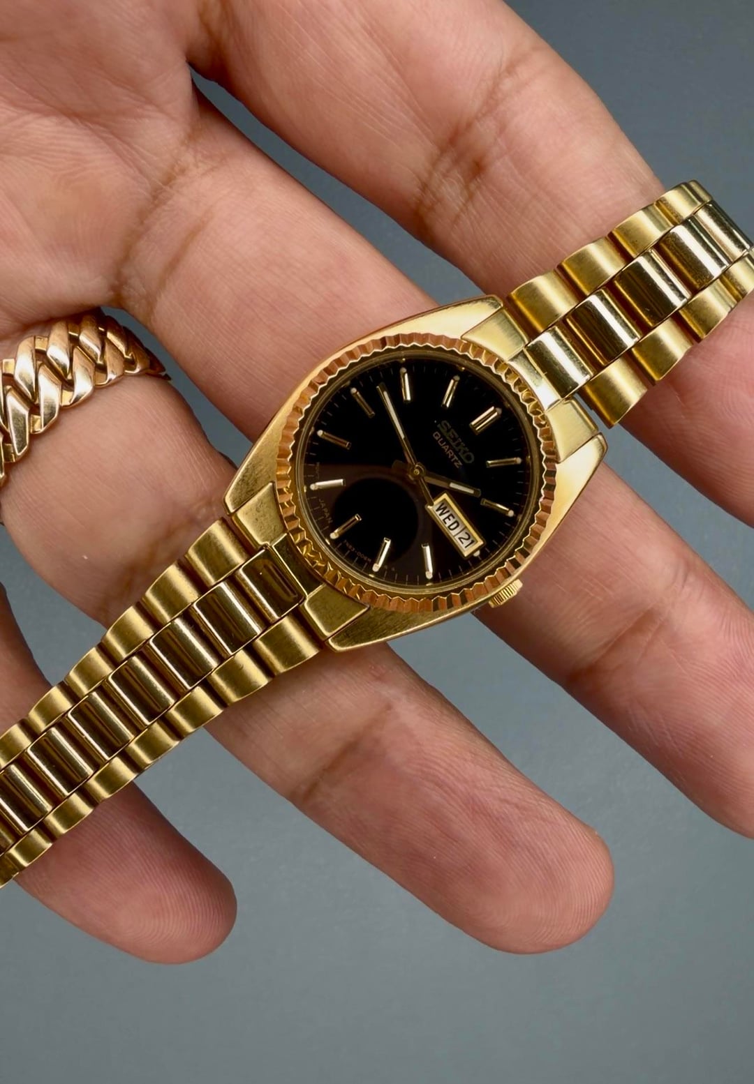 Ladies Seiko 7N83 in Gold W/ Black Dial - $99 -Details: A beautiful lightly used gold Seiko with a president style bracelet, smooth bezel, day and date function, and black dial, in lightly used condition! Barely prices me marks on the crystal, see for yourself in the photos! A perfect gift for your wife, gf, or any other important woman in your life! A watch that will elevate any lady’s wardrobe! Watch only. -$99 Shipped -I accept Venmo, CashApp, Zelle, and PayPal (+4% if using G&S) -Movement: Quartz -Case size: 23mm -Timestamp: https://imgur.com/a/8cW7aIs -Location: Downtown Los Angeles -IG: ColeccionDeLosSantos -TikTok: Chris.DeLosSantos