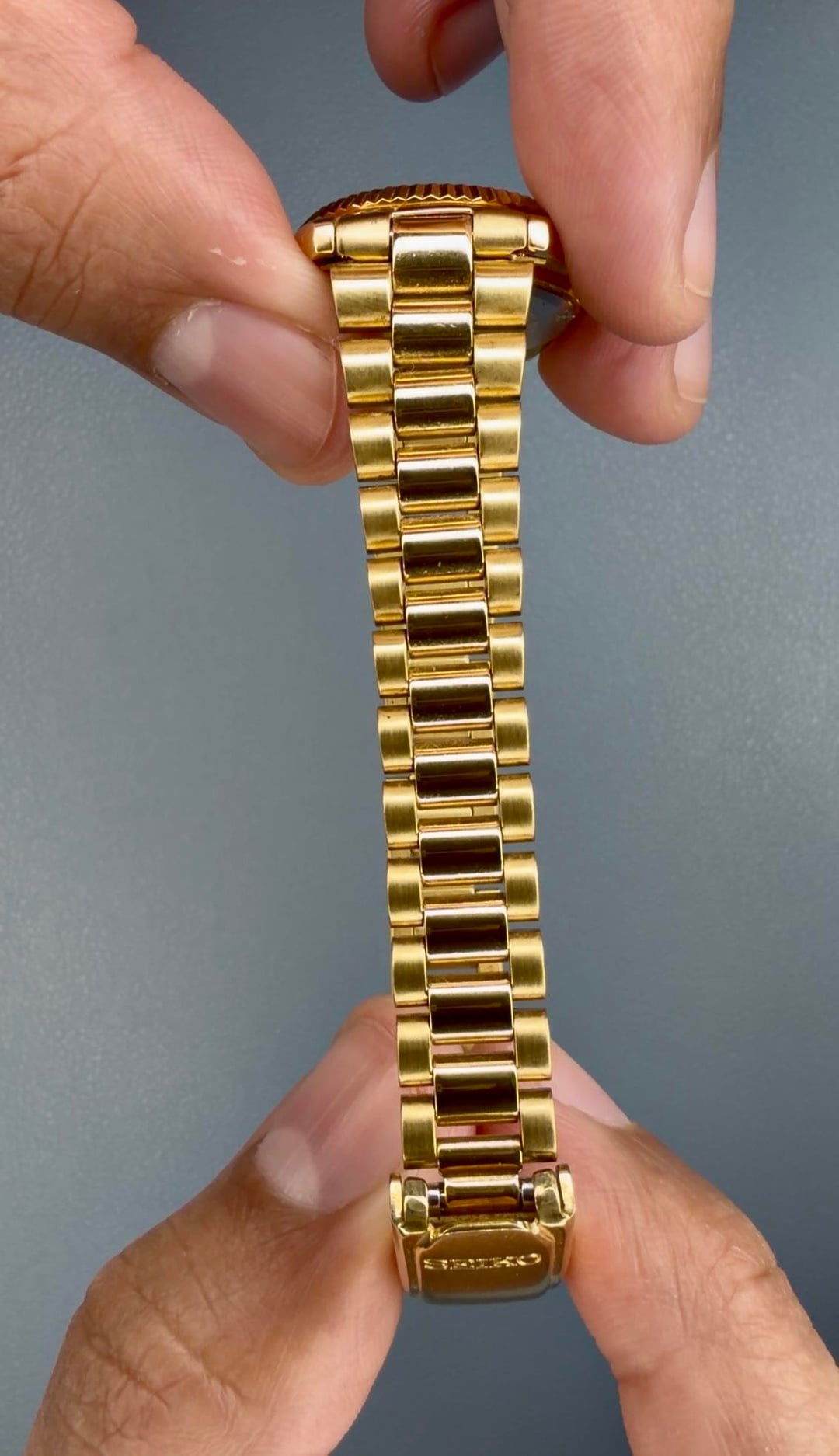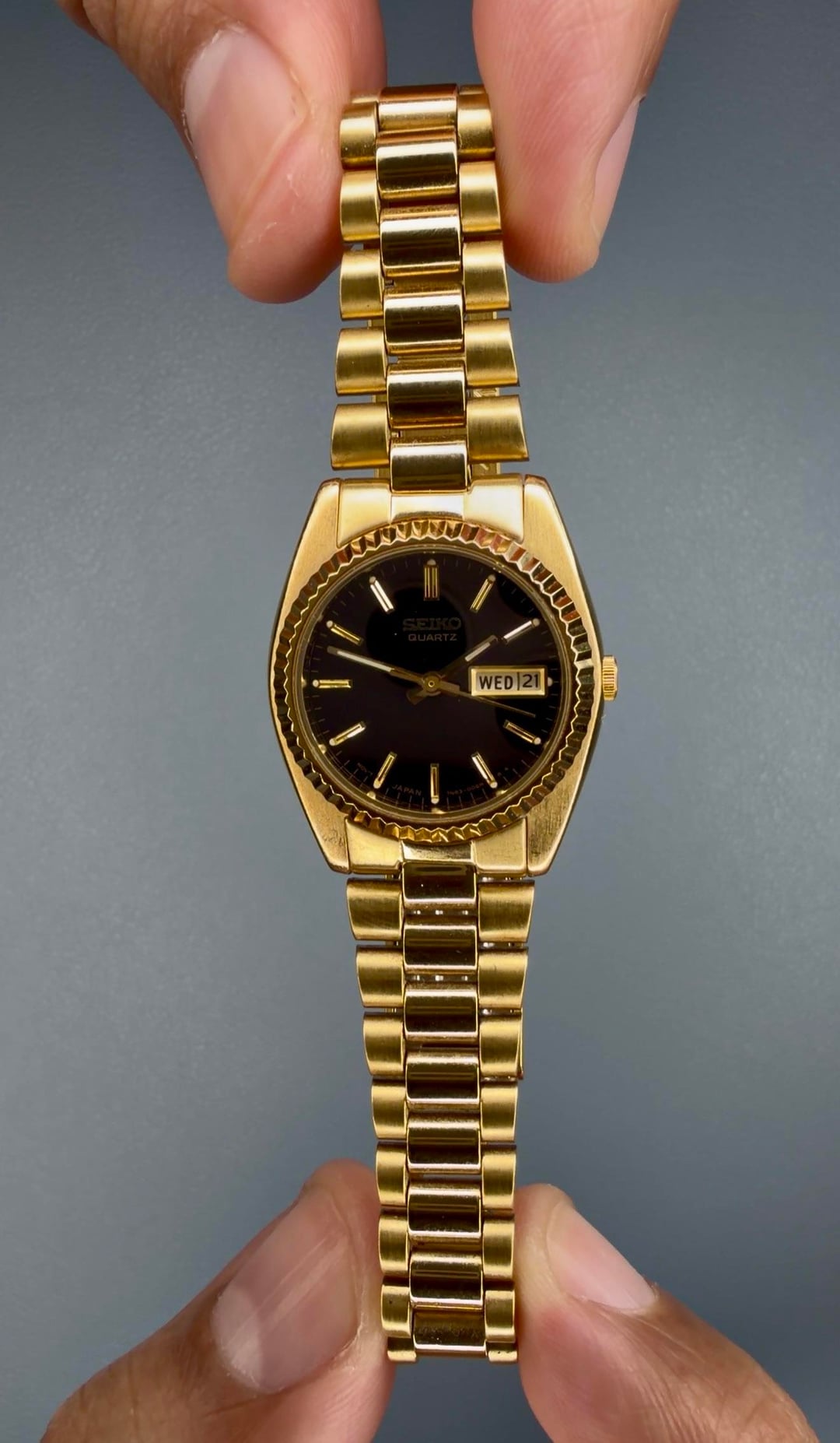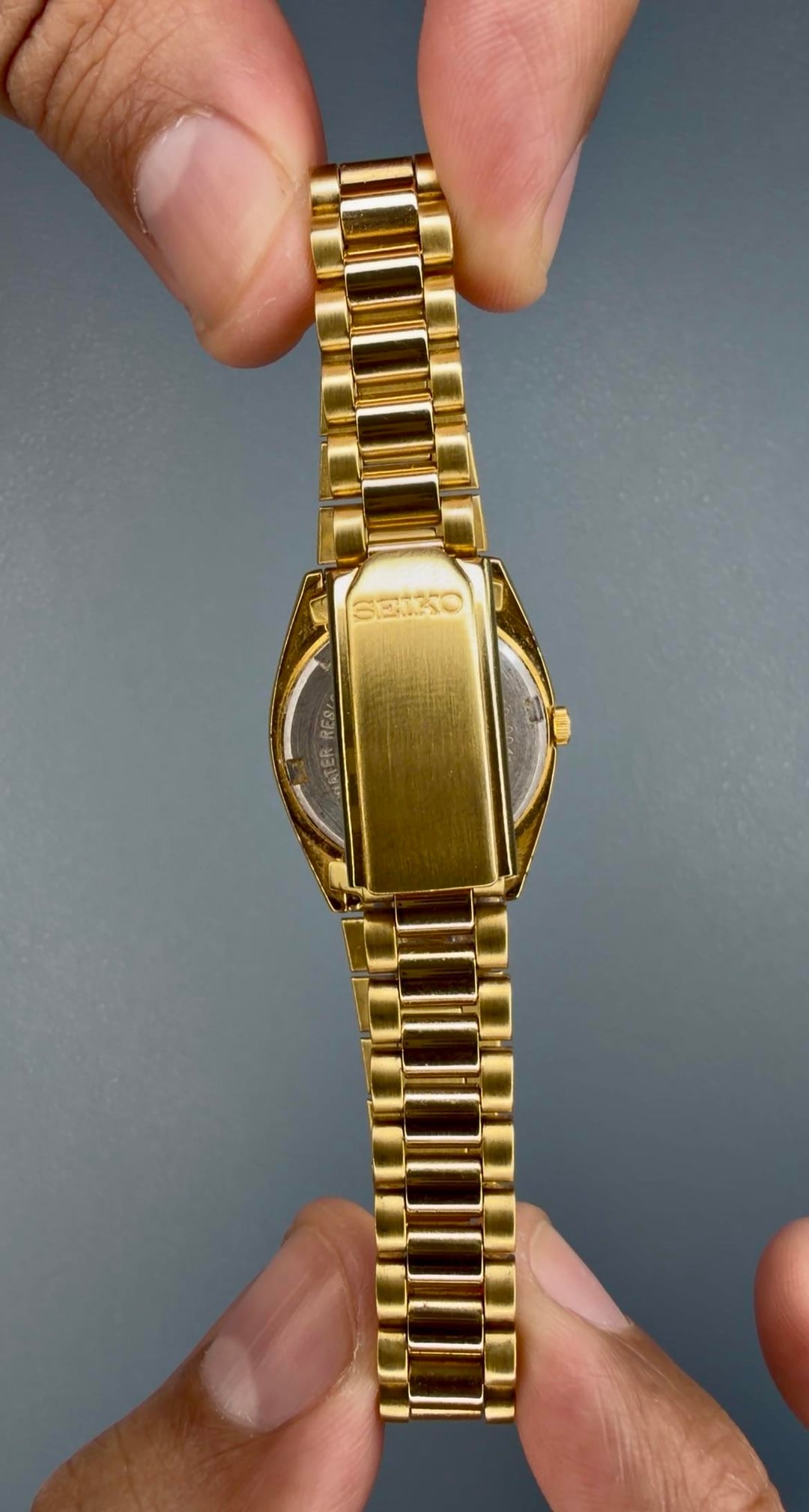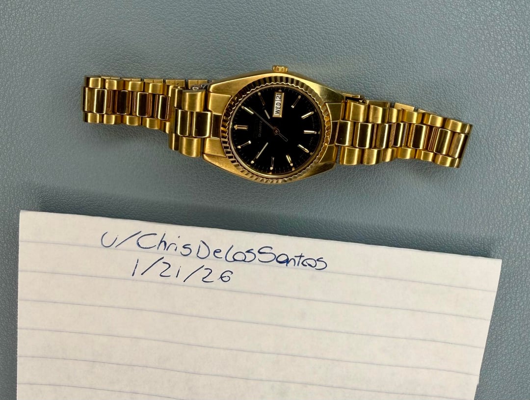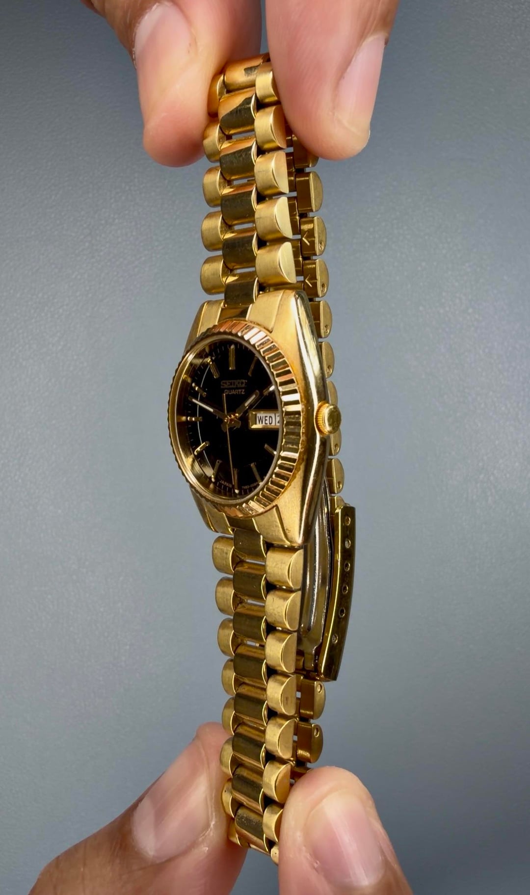 Ladies Seiko 7N83 in Gold W/ Black Dial - $99 -Details: A beautiful lightly used gold Seiko with a president style bracelet, smooth bezel, day and date function, and black dial, in lightly used condition! Barely prices me marks on the crystal, see for yourself in the photos! A perfect gift for your wife, gf, or any other important woman in your life! A watch that will elevate any lady’s wardrobe! Watch only. -$99 Shipped -I accept Venmo, CashApp, Zelle, and PayPal (+4% if using G&S) -Movement: Quartz -Case size: 23mm -Timestamp: https://imgur.com/a/8cW7aIs -Location: Downtown Los Angeles -IG: ColeccionDeLosSantos -TikTok: Chris.DeLosSantos