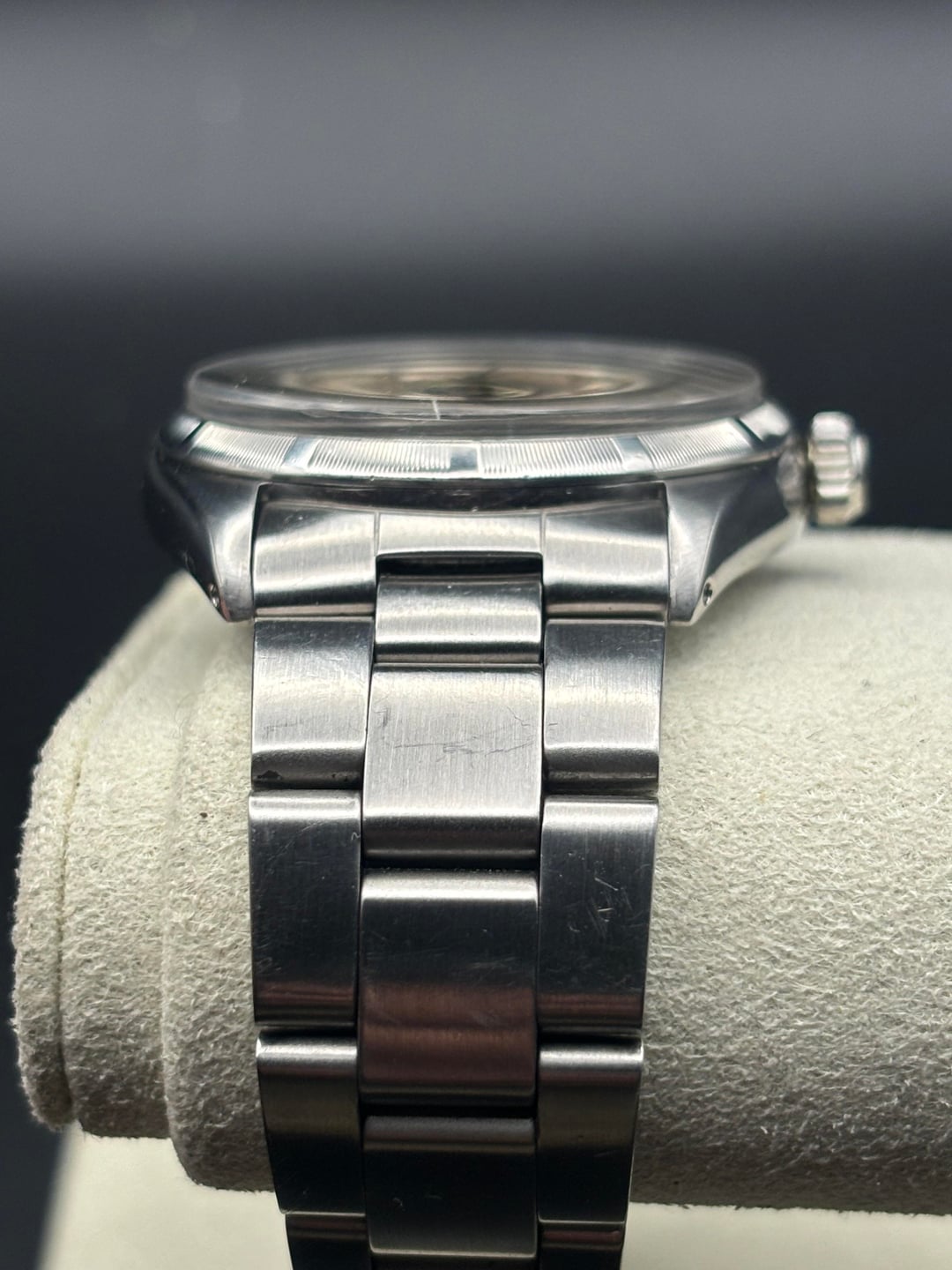 Offered here is a classic vintage Rolex Oyster Perpetual reference 1003, estimated to date to around 1966. This is a timeless, no-date Rolex with the clean proportions and understated design that made the 1003 such an icon among vintage collectors. The watch is in very good condition for its age, showing honest vintage wear throughout. The bracelet and clasp display light to moderate surface scratches and hairlines, consistent with decades of careful use—nothing unexpected for a watch approaching 60 years old. The case remains well-shaped, and the engine-turned bezel retains crisp definition. The silver dial has aged beautifully with natural patina, giving the watch excellent vintage character. Hands and indices complement the dial nicely, and the overall presentation remains very attractive on the wrist. Overall, this is a strong example of a reference 1003, offering classic Rolex aesthetics, mechanical reliability, and authentic vintage charm. A great choice for collectors looking for a wearable, honest vintage Rolex in very respectable condition for its age. 2️⃣.2️⃣k & L FIRM!
