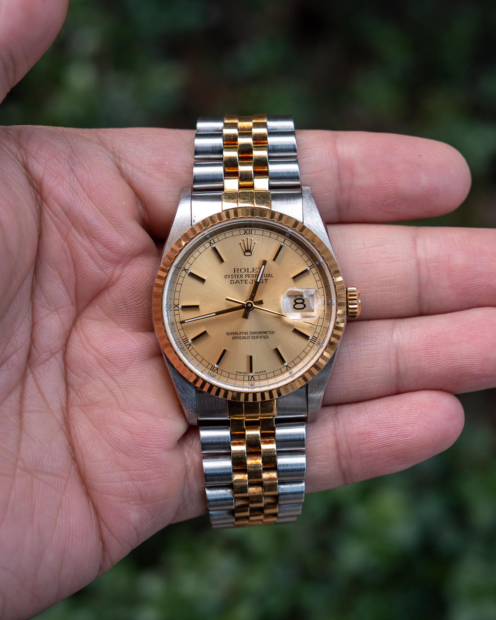 | 1990 Rolex DateJust 36mm CHAMPAGNE 18K Yellow Gold Stainless Steel JUBILEE 16233 collectorswatches (8975) |