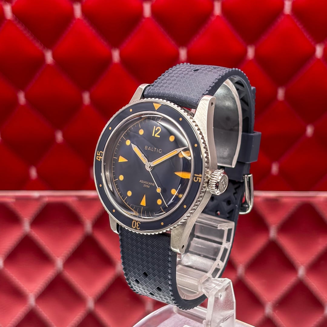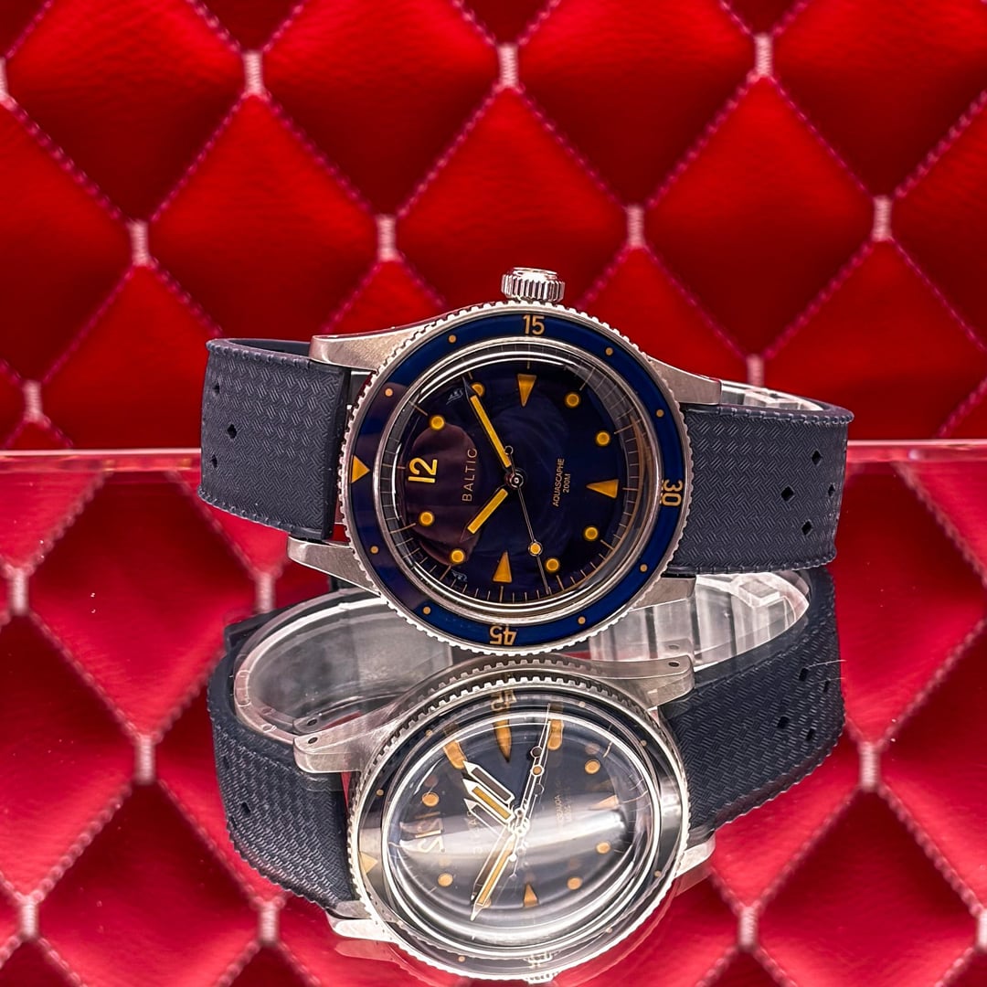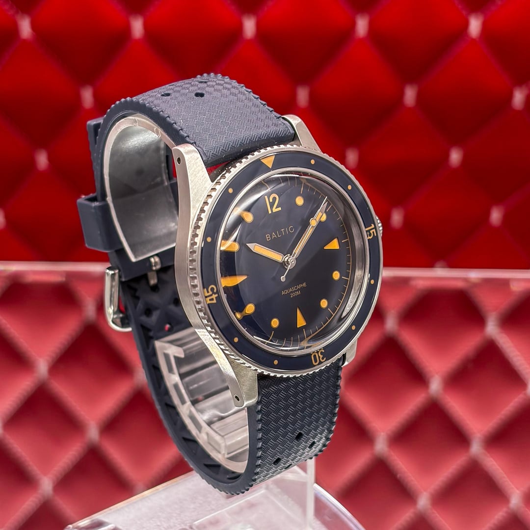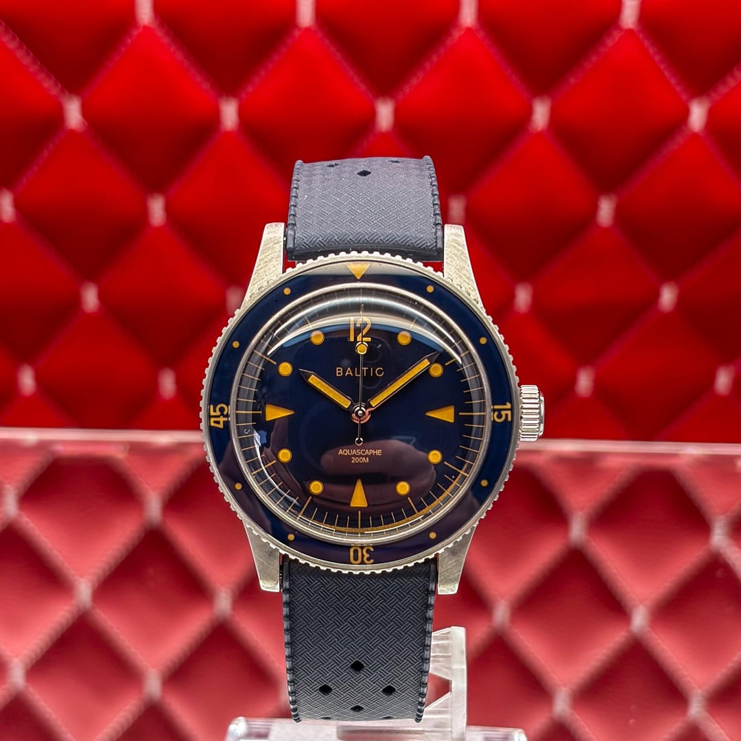 🏒🥅🚨 \[WTS\] Baltic Aquascaphe Classic - Blue Gilt - 2025 Full Set Offering this iconic Baltic Aquascaphe Classic in the highly sought-after Blue Gilt colorway. This is widely considered one of the best vintage-inspired divers on the market, perfectly capturing the aesthetic of 1950s dive watches while offering modern build quality. The combination of the deep blue grain dial and the gilt (gold) accents gives this watch an incredible warmth and presence. It features a sapphire bezel insert and a double-domed sapphire crystal that creates beautiful distortions at different angles. The watch is in great pre-owned condition and is ready for a new home. It’s a versatile piece that looks just as good on a leather strap as it does on the included rubber or a beads-of-rice bracelet. 💰 Price: 💲605 USD Condition & Photography Please review all photos for the most accurate representation of this watch's condition. Our macro photography is designed to capture every detail, including the smallest imperfections, ensuring you can buy with complete confidence. Shipping & Service We ship fully insured overnight via FedEx for your peace of mind. We are happy to arrange a video call to show the watch and answer any questions—just reach out anytime. We guarantee the authenticity and accuracy of all our timepieces. Your satisfaction is our highest priority, and we strive for a smooth, transparent, and 100% positive transaction. As a dedicated hockey coach and passionate timepiece collector (@pucks\_timepieces), I've spent years immersed in the world of horology. I now combine this passion with my hockey-playing daughters, and together we create the unique presentations you see here. Our photography is inspired by contemporary artists like KAWS, Banksy, Joan Cornellà, Death NYC, and Shepard Fairey. This artistic approach adds a distinctive, creative character to how each watch is presented. When you purchase from me, you can expect a seamless experience. I'm highly responsive and happy to provide extra photos or details to ensure you feel great about your purchase. Timestamps: https://drive.google.com/file/d/19peey\_rYJCx8dJighrKy5URXQuICvoKF/view?usp=sharing & https://drive.google.com/file/d/1BiAMFAXyYQq3MwJeGXZFlq4mv4cWzfQK/view?usp=sharing