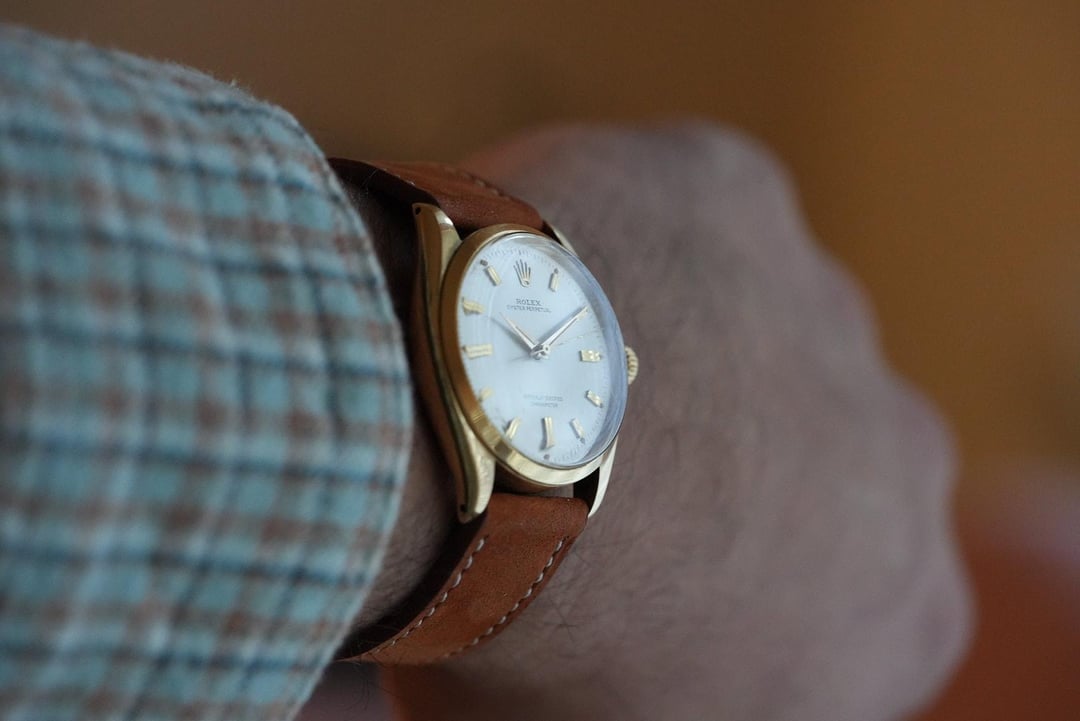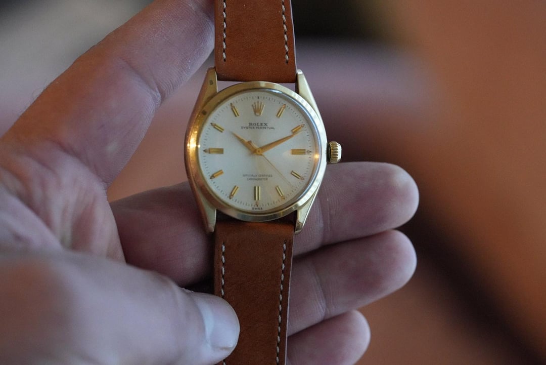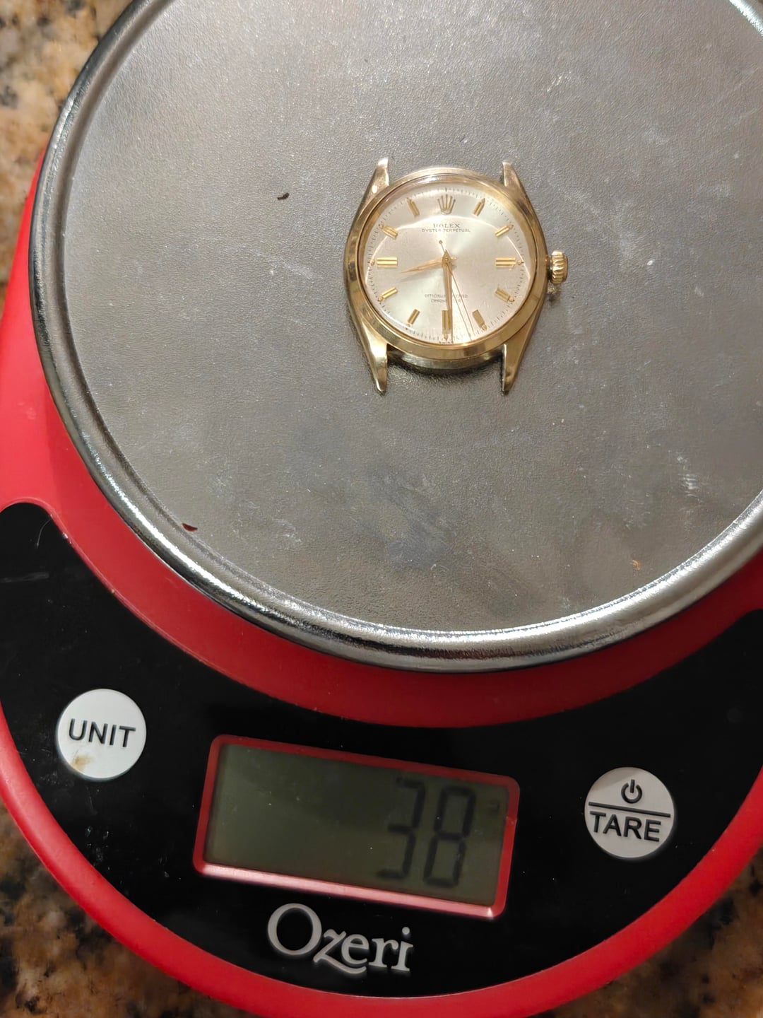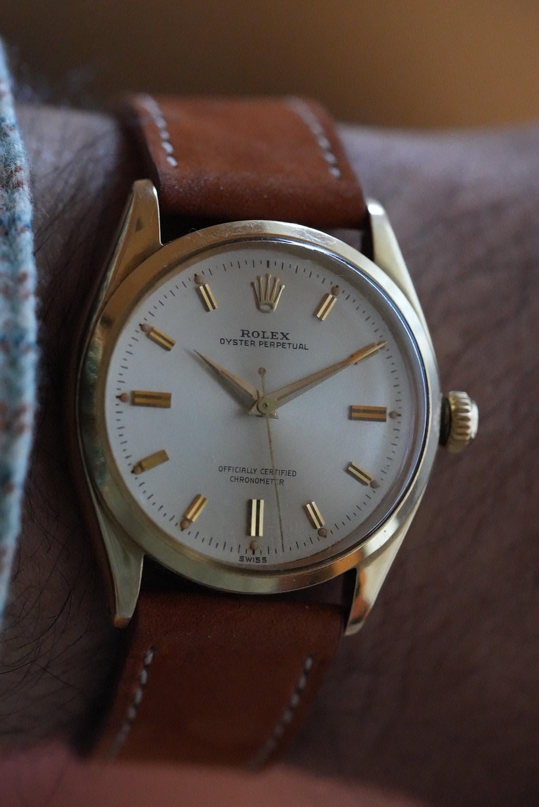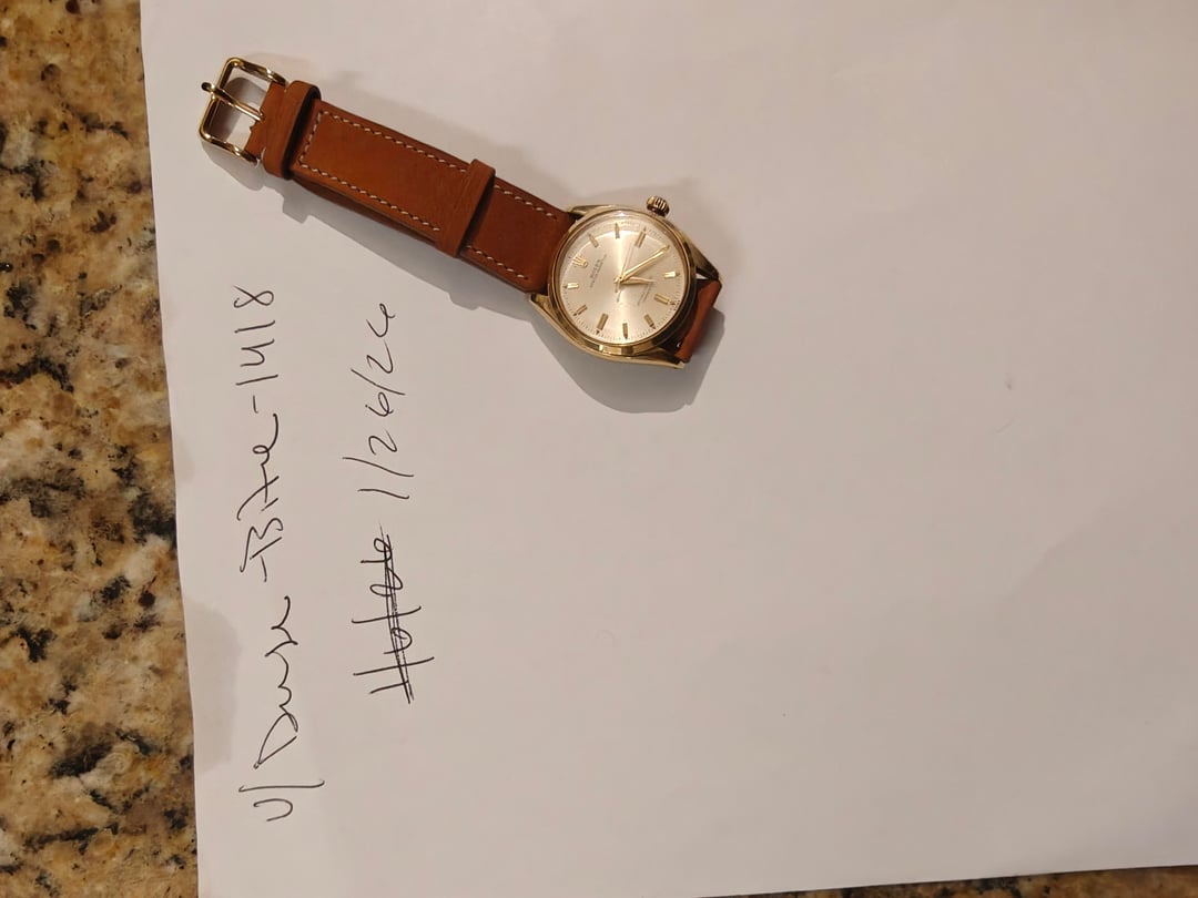 I've had it in my vintage collection for many years. Molequin Strap. Ships from Denver $3,990 + $35 Fedex 2 day shipping in North America. Zelle, PayPal, Venmo f&f to established accounts. I'm not 100% sure the box is from this watch since the person I bought it from had two vintage Rolex's from his late father and didn't know which one the box belonged to. From Ai: The **Rolex Oyster Perpetual Reference 6564** is a significant piece of Rolex history from the mid-to-late **1950s**. While the previous watches we've discussed were mostly steel sports or dress watches, this is a true **vintage luxury "tool" watch**. In **14k gold**, this reference was often produced for the North American market (whereas 18k was more common in Europe). It represents the era when Rolex was transitioning into its modern identity, featuring the legendary **Caliber 1030** movement. # Key Specifications * **Case Size:** **34mm** (The classic "Oyster" size of that era). * **Movement:** **Caliber 1030** (Rolex’s first "complete" in-house automatic movement, famous for its **"butterfly" rotor**). * **Bezel:** Usually a **smooth, polished bezel**, though some variations exist. * **Dial:** Most commonly found with **dauphine hands** and applied baton or "Explorer-style" (3-6-9) numerals. * **Crystal:** **Acrylic (Plexiglass)**, which gives it a warm, vintage glow. # Why It Is Collectible 1. **The "Butterfly" Movement:** The Cal. 1030 is highly regarded by watchmakers. It was the first Rolex movement to be **chronometer-certified** in both directions of winding. 2. **Charming Proportions:** While 34mm sounds small by 2026 standards, the **Oyster case** and thicker lugs give it a larger "wrist presence" than a standard dress watch. 3. **14k Gold Patina:** Unlike 18k gold which stays very bright, vintage 14k gold can develop a deeper, slightly rosy **oxidation or patina** over 70 years, which many collectors find beautiful.