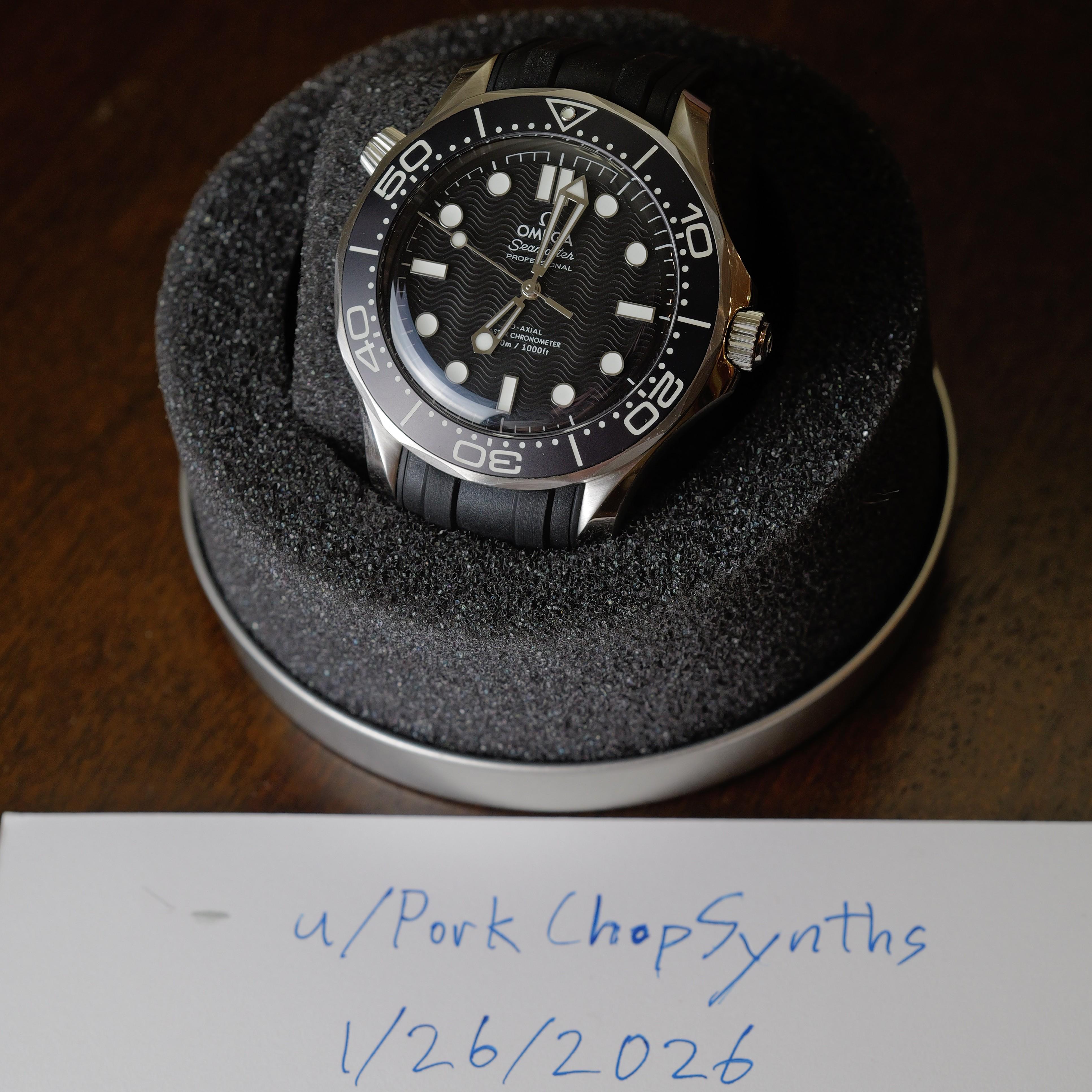 Album with additional photos: [https://imgur.com/a/omega-seamaster-diver-300m-2026-01-26-R1U91y5](https://imgur.com/a/omega-seamaster-diver-300m-2026-01-26-R1U91y5) Price: $4999 shipped within CONUS Condition: 9/10, while I've worn this watch quite a lot, the rubber strap hides really any sign of wear, and I believe there are still some of the stickers within the clasp mechanism. The only noticeable wear I can see is slight scuffs on the very edge of the lugs on the polished portions, which I tried to highlight in the photo. I absolutely love this watch and found it fit my smaller wrist better than I expected, but I haven't been wearing it as much as when I first got it. Includes: Original box, papers, all cards, instruction manual, and an eBay authentication card. As a bonus, I ordered two different aftermarket mesh bracelets in case I wanted to go for that look, but I never installed them. One has a clasp mechanism just like the Omega version, and the other has a far thinner clasp mechanism. I used to frequent this subreddit, but now that I'm focusing a lot more on my musical gear and related endeavours, I'm parting with some of my watches. I have some transaction history under this account at [r/Synths4Sale](https://www.reddit.com/r/Synths4Sale/) and can share my Reverb account, eBay account, and provide other references. I'm also happy to take any additional photos or schedule a video call to show any or all of my watches for sale. Discounts can be provided if you're interested in more of my watches, so be sure to see if I have posted any others for sale! Thank you!