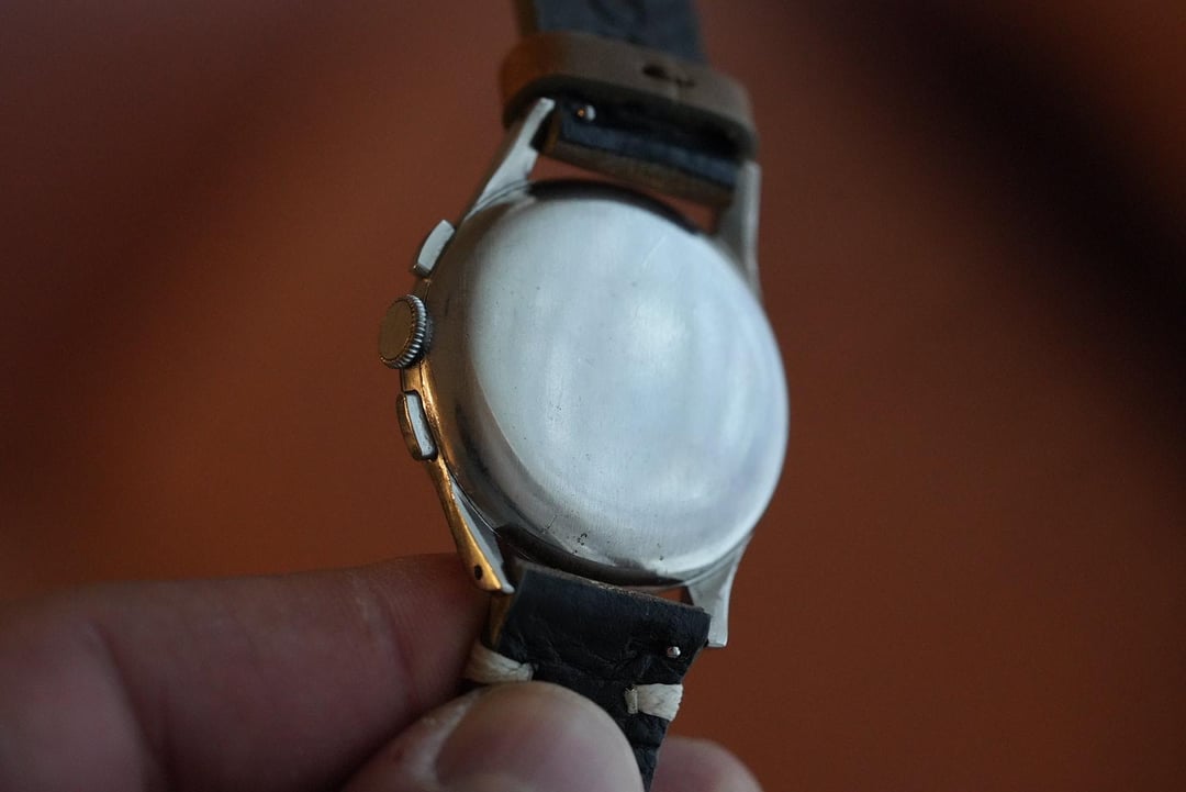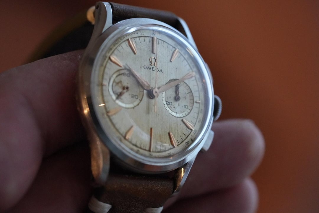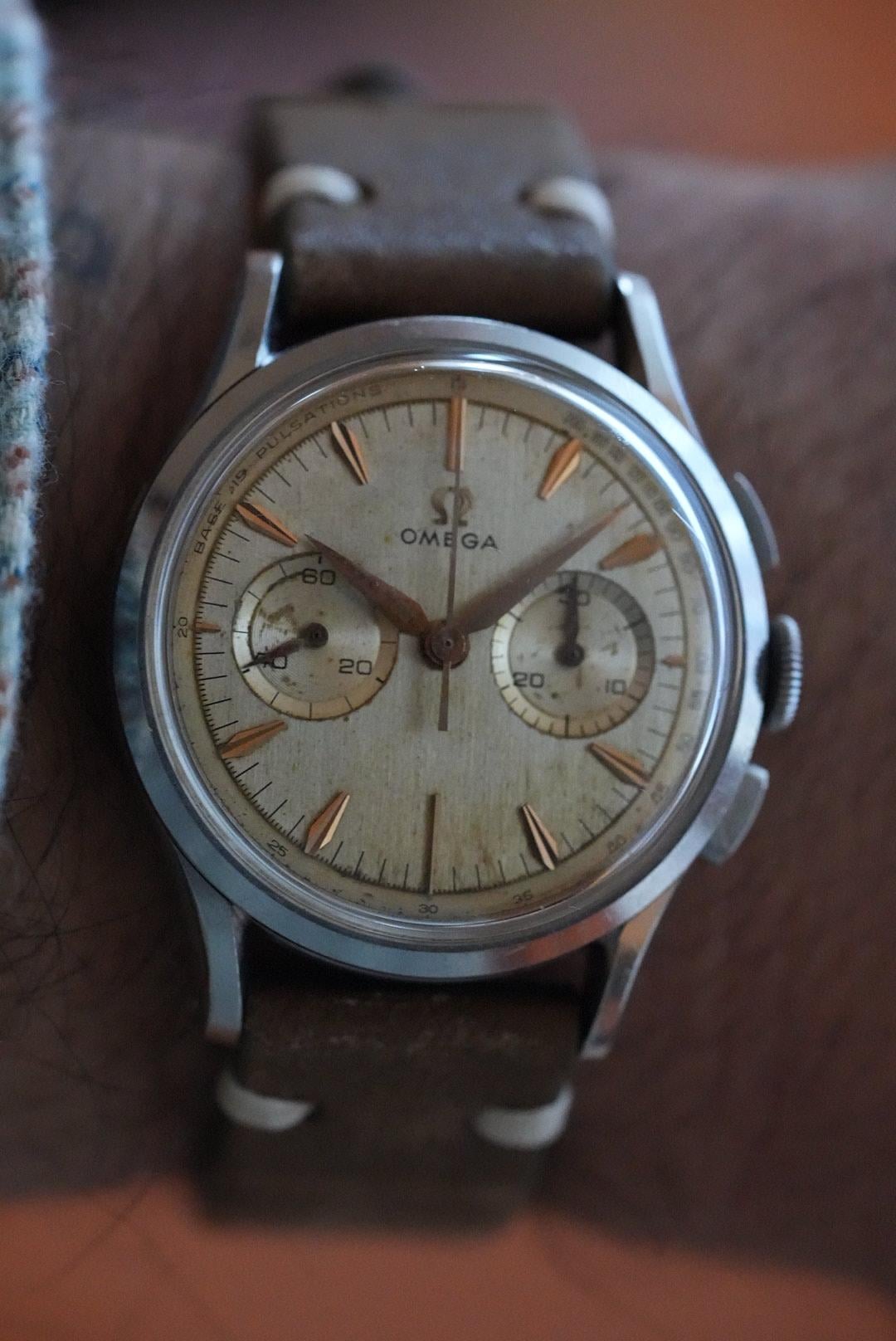I've had this cutie patootie in my vintage collection for many years. Rare pulsations dial for the docs. Note the crown is not original. Chronograph works as it should. Ships from Denver $3,000 + $35 Fedex 2 day shipping in North America. Zelle, PayPal, Venmo f&f to established accounts. From Ai: The **Omega Calibre 320** is one of the most prestigious vintage chronograph movements ever produced by Omega. While the famous Calibre 321 powered the Speedmasters that went to the moon, the **Calibre 320** is its equally refined, **two-register** (bi-compax) sibling. Produced between **1942 and 1968**, this movement is a "column-wheel" chronograph, a technical architecture that is highly prized by collectors today for its smooth operation and historical importance. # Key Specifications * **Movement Type:** Manual-wind, column-wheel chronograph. * **Registers:** Two sub-dials (Small seconds at 9:00, 30-minute counter at 3:00). * **Beat Rate:** 18,000 A/h (2.5 Hz). * **Power Reserve:** Approximately **44 hours**. * **Base Movement:** Developed by **Lemania** (Calibre 27 CHRO).. # Why Collectors Love It * **The "321 Connection":** It shares about 90% of its parts with the legendary Calibre 321. The main difference is that the 320 lacks the 12-hour totalizer, resulting in a cleaner, more symmetrical dial. * **Elegant Design:** While the 321 is associated with "tool" watches like the Speedmaster, the 320 was almost exclusively used in **elegant dress chronographs**. You will often find it in solid 18k gold cases with beautiful "leaf" or "dauphine" hands. * **Relative Rarity:** Because it was produced in smaller quantities than the three-register versions, finding an original, unpolished Cal 320 is a milestone for vintage Omega enthusiasts.