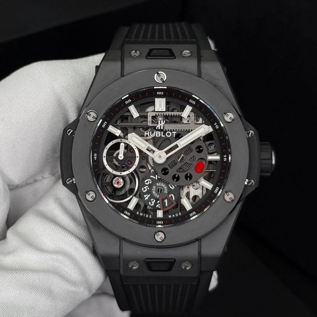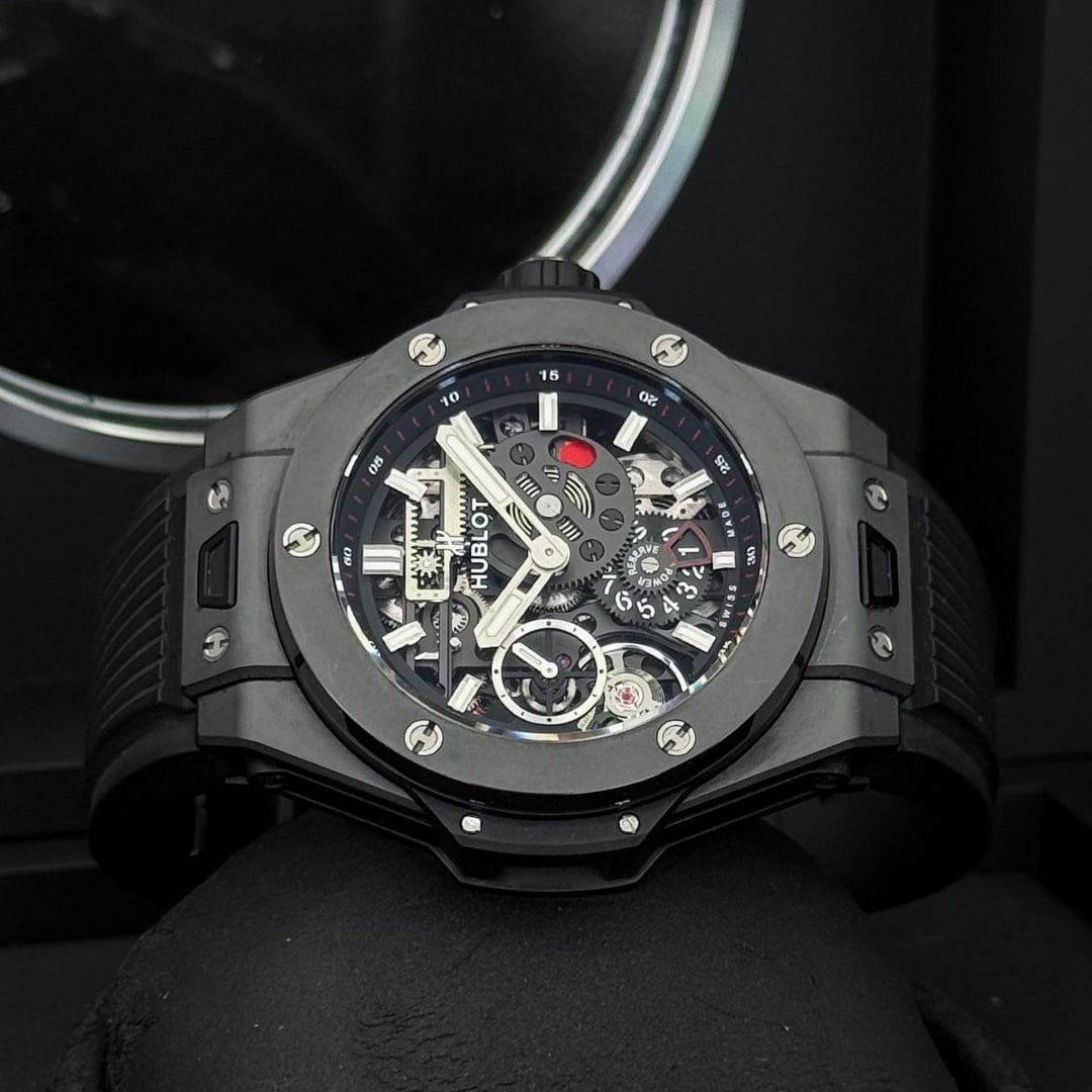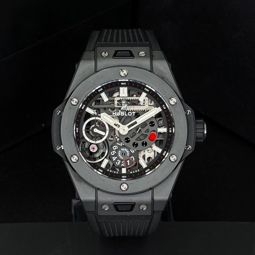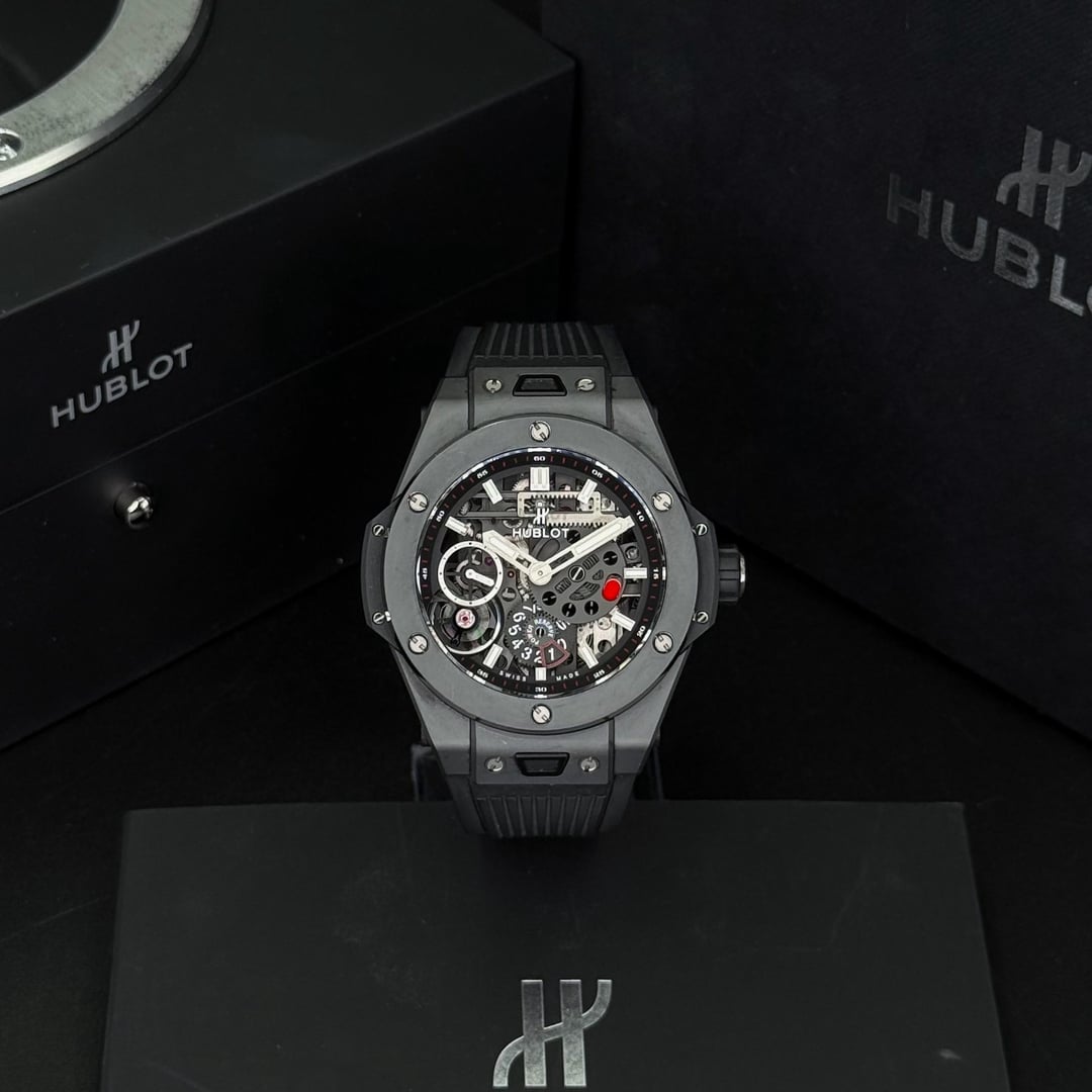 Available is the Hublot Meca-10 Black Magic Ref: Hublot 414.CI.1123.RX Asking $9,450 with free insured overnight shipping Local Orlando [Video](https://imgur.com/a/YfMJuVl) [Timestamp](https://imgur.com/a/Kqd9Xli) [Instagram](https://www.instagram.com/jamesthewatchguy?igsh=a2pxZG16bzhmdHU5&utm_source=qr) I know Reddit isn’t always the most Hublot friendly but… The Meca-10 in-house movement is an absolute engineering marvel and the way Hublot has chosen to display it from both sides is so well executed The 10 day power reserve can be measured 3 different ways on the front of the skeleton dial and 3 bridges on the exhibition caseback are equally beautiful The 45mm black ceramic case wears surprisingly comfortable on the integrated rubber strap and has become one of my go to daily’s Contents: Double Boxed E Warranty Dated 2018 Condition: Very good condition Very light lines on ar coating that can only be seen at certain angles under ring light (most wouldn’t disclose) Running well on timegrapher and not in need of a service Buyer perks and protections: Open to trades 3rd party escrow and authentication available 12 month trade ins and buy backs Timegrapher testing to make sure your watch is working correctly and not in need of a service Overnight insured shipping anywhere in continental US I’m quick to respond and easy to get a hold of -James The Watch Guy jamesthewatchguy.com