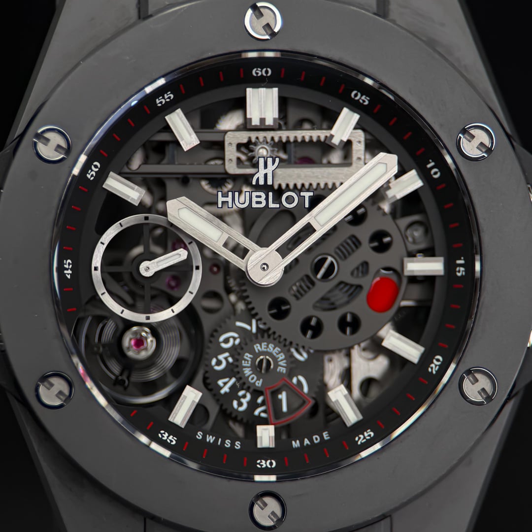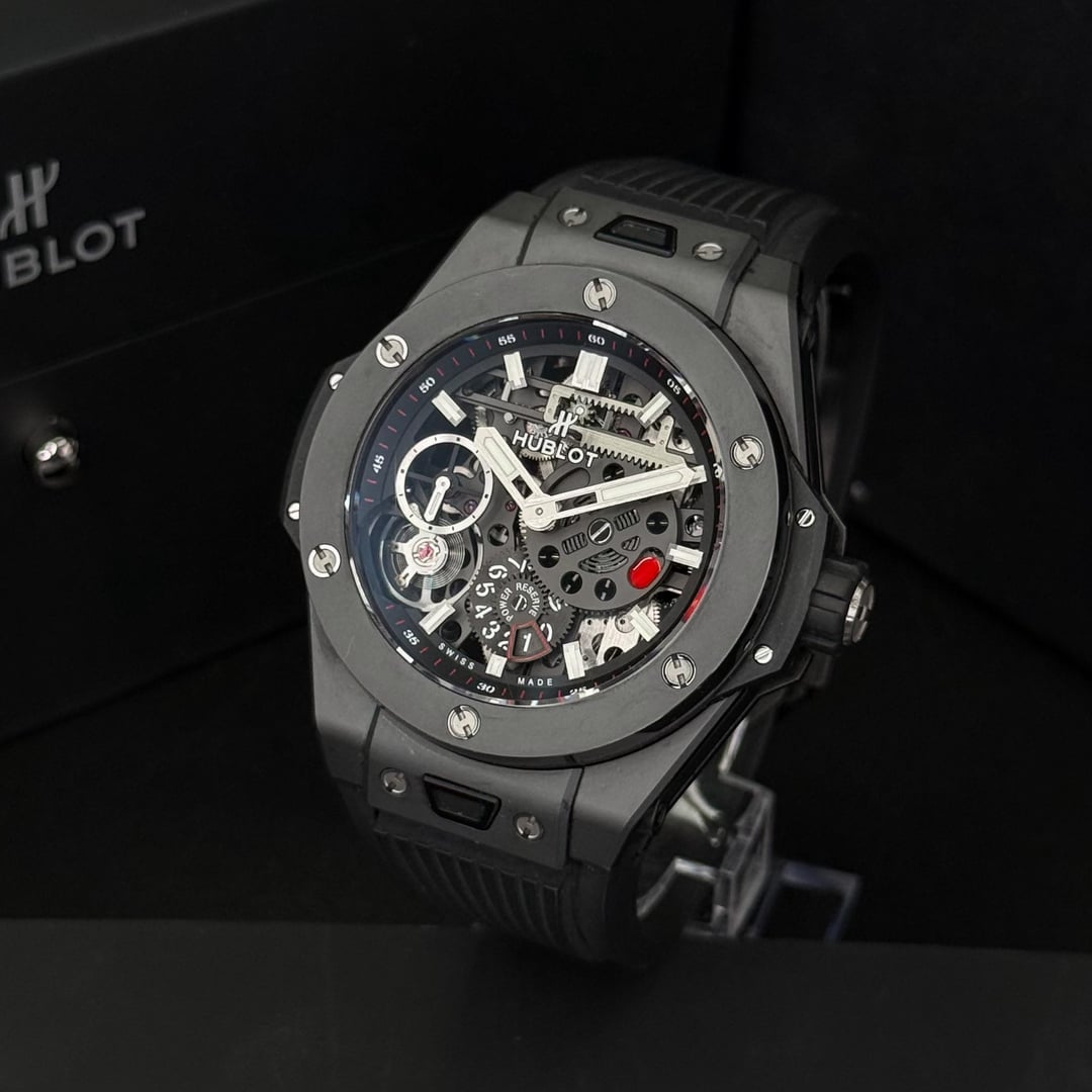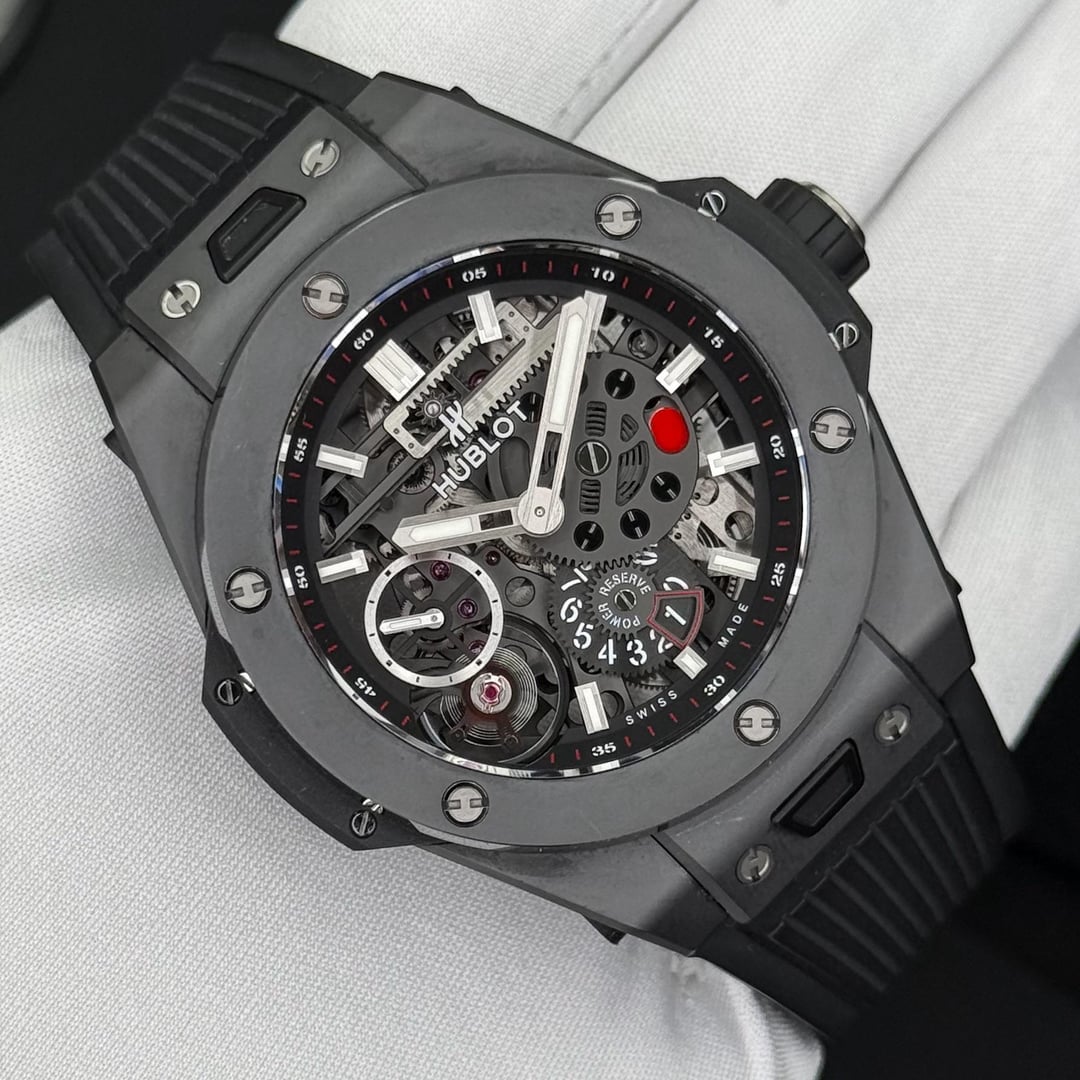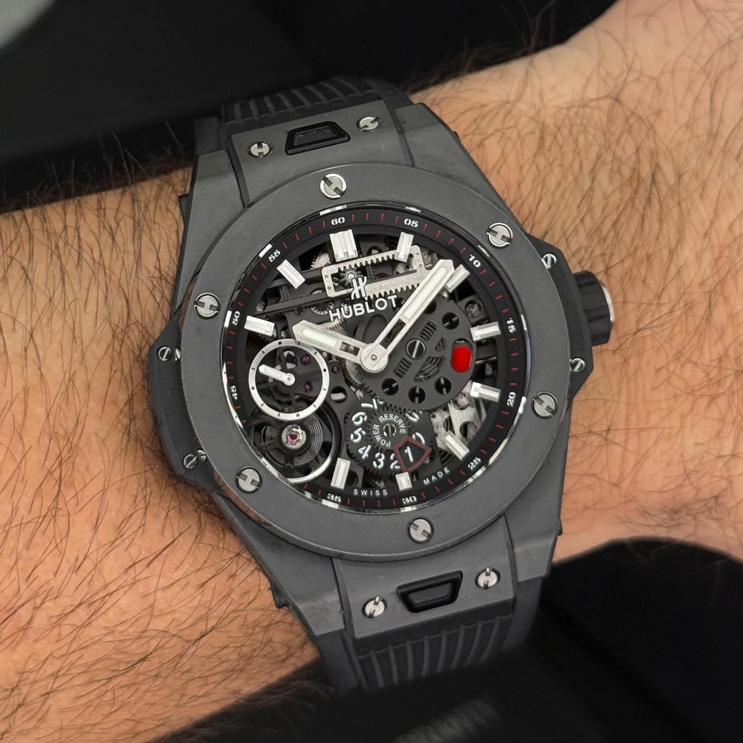 Available is the Hublot Meca-10 Black Magic Ref: Hublot 414.CI.1123.RX Asking $9,450 with free insured overnight shipping Local Orlando [Video](https://imgur.com/a/YfMJuVl) [Timestamp](https://imgur.com/a/Kqd9Xli) [Instagram](https://www.instagram.com/jamesthewatchguy?igsh=a2pxZG16bzhmdHU5&utm_source=qr) I know Reddit isn’t always the most Hublot friendly but… The Meca-10 in-house movement is an absolute engineering marvel and the way Hublot has chosen to display it from both sides is so well executed The 10 day power reserve can be measured 3 different ways on the front of the skeleton dial and 3 bridges on the exhibition caseback are equally beautiful The 45mm black ceramic case wears surprisingly comfortable on the integrated rubber strap and has become one of my go to daily’s Contents: Double Boxed E Warranty Dated 2018 Condition: Very good condition Very light lines on ar coating that can only be seen at certain angles under ring light (most wouldn’t disclose) Running well on timegrapher and not in need of a service Buyer perks and protections: Open to trades 3rd party escrow and authentication available 12 month trade ins and buy backs Timegrapher testing to make sure your watch is working correctly and not in need of a service Overnight insured shipping anywhere in continental US I’m quick to respond and easy to get a hold of -James The Watch Guy jamesthewatchguy.com