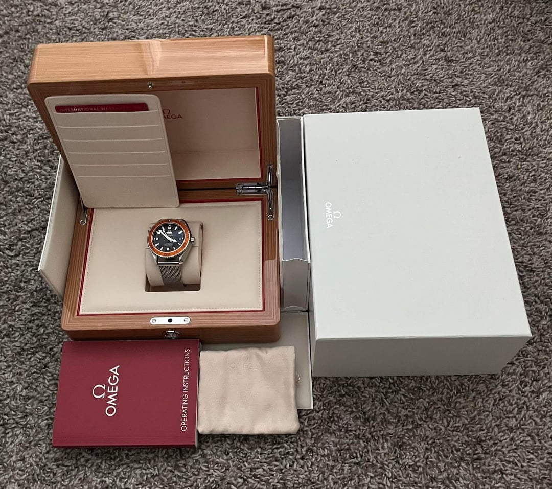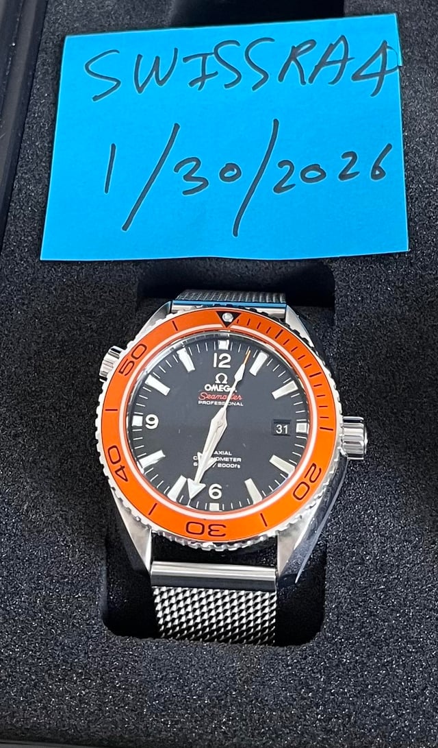 Model: Omega Seamaster Planet Ocean Orange 8500 45mm 232.32.46.21.01.003 Near mint and full set. Crystal and bezel are mint. Really clean piece overall. Gray bezel that came with the watch was swapped with OEM orange. This model originally came with black strap and deployant clasp which was swapped for new style OEM mesh/milanese bracelet. See attached stock picture from omega for reference. $3600 shipped via FedEx anywhere in the US. Payment through zelle, venmo, wire or applepay. NO TRADES. Tons of references/feedback available.