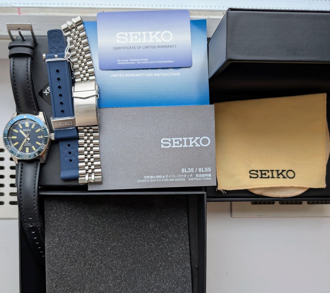 For sale is my Seiko Prospex SLA065 Save the Ocean Limited Edition 1965 Modern Re-Interpretation (you have to love official Seiko names!). I'm only selling as I picked up a different diver and I sadly have a one in/one out policy. (I'm the original owner.) As the name suggests, it's a limited edition of only 1300 produced and is fantastic quality, especially for the price. This watch is only about six months old and is in excellent all around condition. It comes with the caliber 8L35 which is an undecorated Grand Seiko caliber and features Zaratsu polishing which you also only see on Grand Seikos. It comes with it's unused original strap, a sailcloth strap, and a Strapcode steel bracelet which fits it perfectly. It comes with the original box and contents along with an undated warranty card. **Price: $1699 OBRO including insured CONUS shipping via USPS.** I have plenty of references I can provide from WUS and eBay, but I'm happy to cover the cost for PayPal G&S since I don't have any transactions here if that's how you'd like to pay. I can't find a cheaper option in the world. Not interested in trades at this time. **Watch Details:** Thickness: 13.1mm DIAMETER: 41.3mm LENGTH: 47.6mm MOVEMENT: Caliber 8L35 Driving system: Automatic Frequency: 28,800 vibrations per hour Power reserve: 50 hours Number of jewels: 26 CASE: Stainless steel case with super-hard coating CRYSTAL MATERIAL: Dual-curved sapphire crystal with anti-reflective coating on the inner surface WATER RESISTANCE: 200 meters (660 feet), follows ISO standards and is suitable for scuba diving DIAL COLOR: Blue STRAP: Silicone Strap Lug Width: 20mm