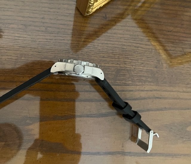 It is in good condition, with several tiny dinks and a few scratches on the bezel. The bezel turns smoothly in 60 clicks, with just the lumed pip for timing. The pilot handset, dial, and crystal are clean, and the lume is very strong. The case is without visible flaws, and the large screwdown crown screws in smoothly and securely. The drilled lugs make strap changes easy. Serial number is 010.